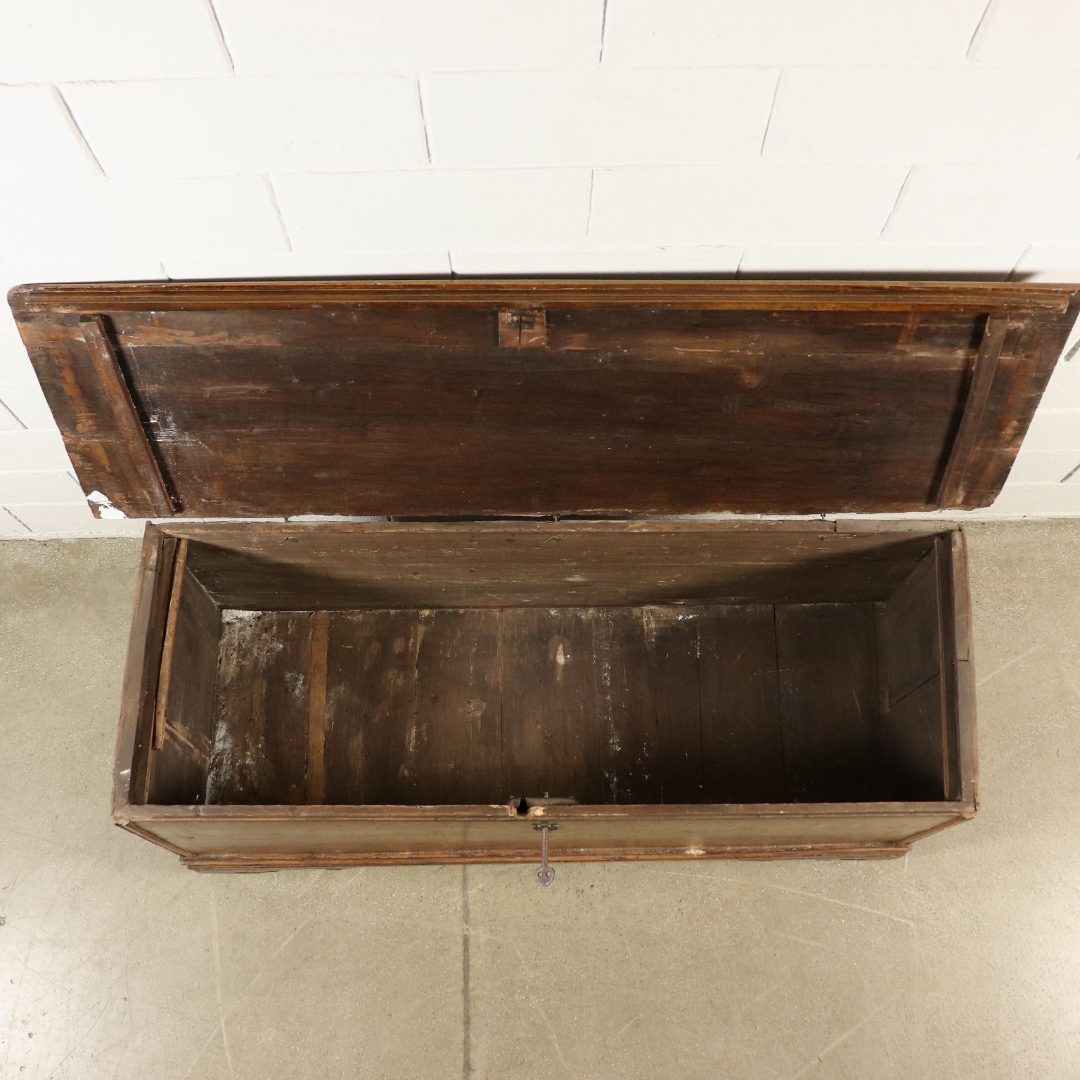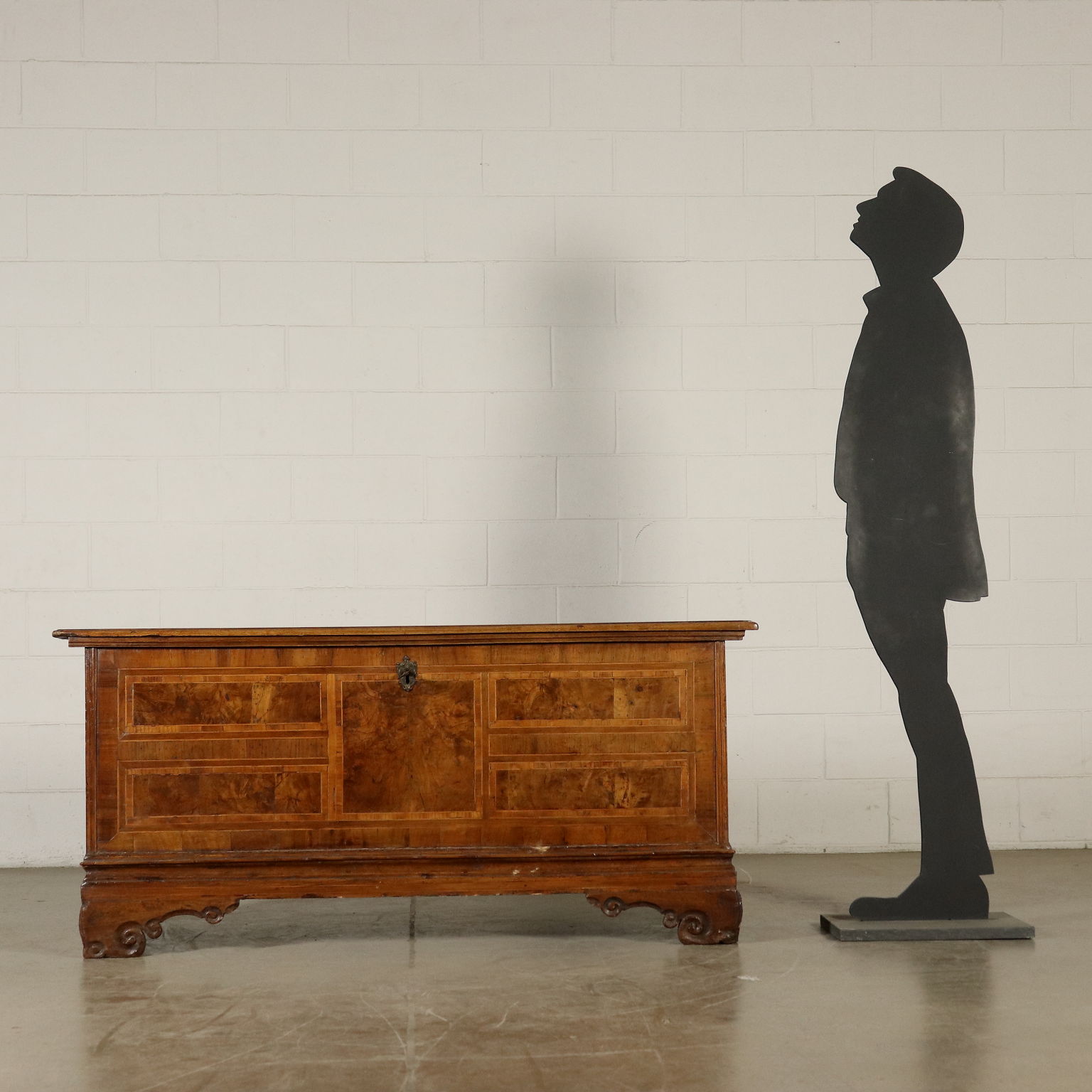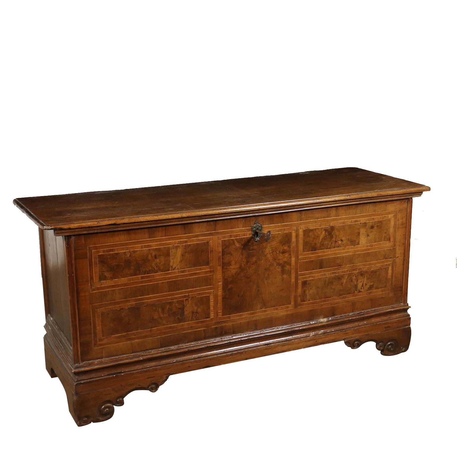 Furnierte Truhe mit Nussbaumholz-Reserven und Ahornfäden. Halterfüße.