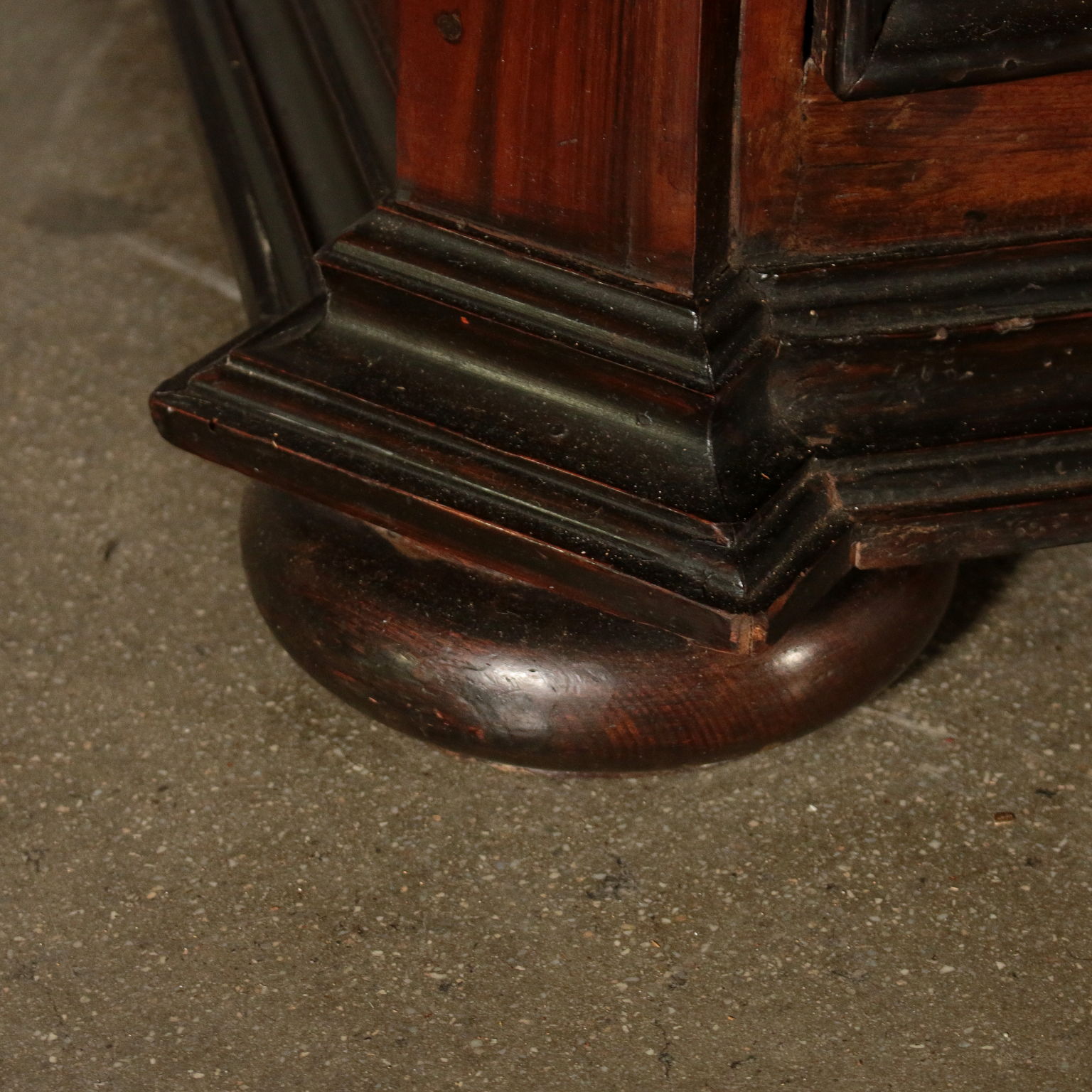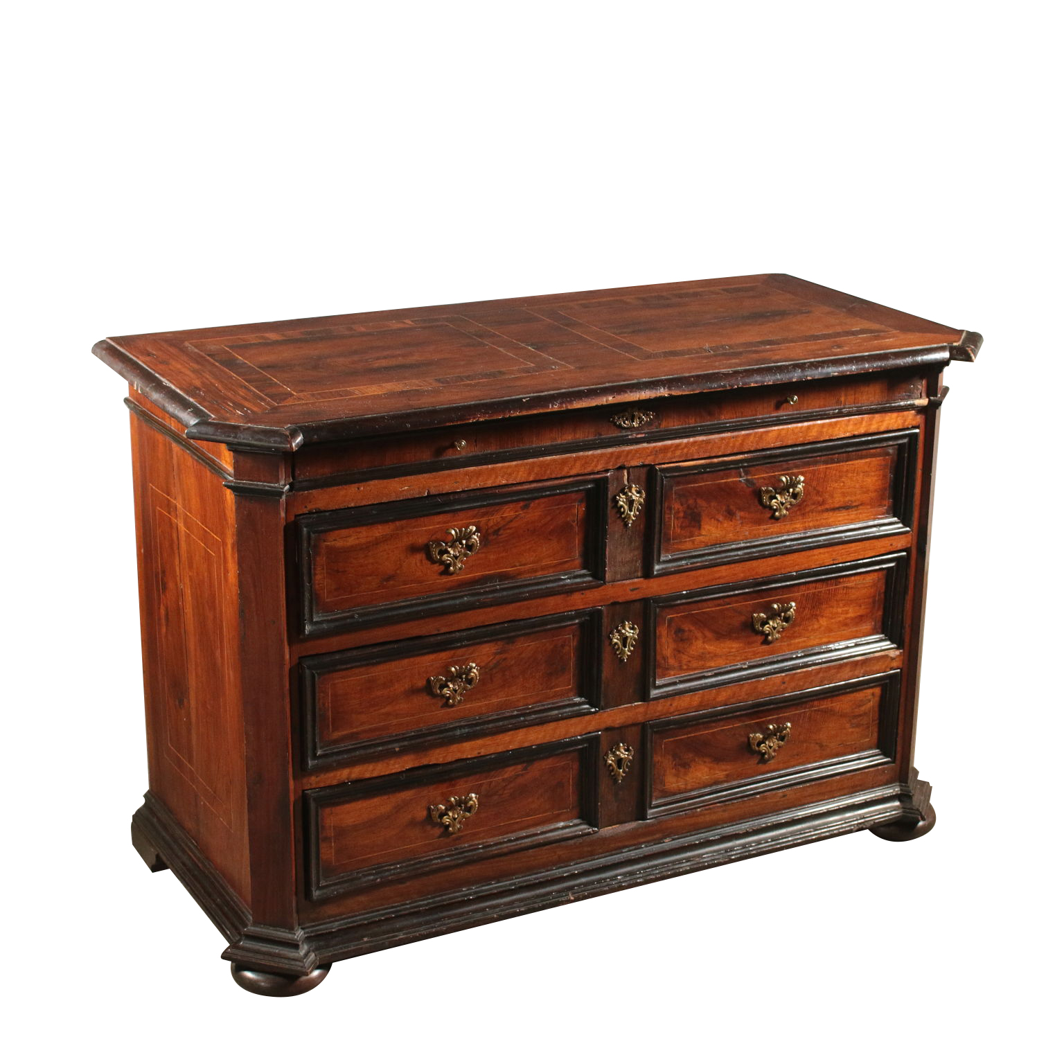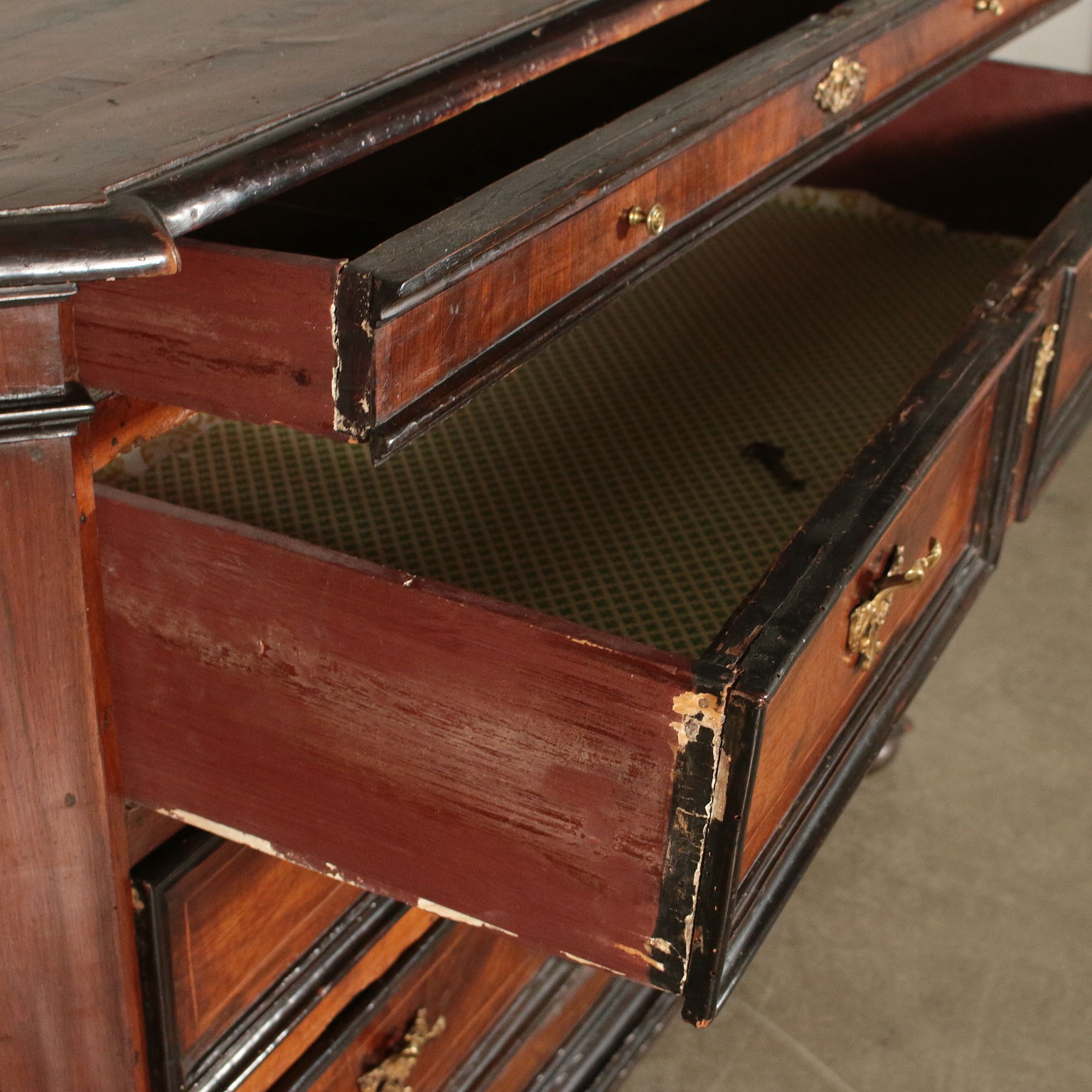Toskanische Schubladenmöbel mit gedrehten Füßen. Es verfügt über drei Schubladen mit Paneelen sowie eine darunter liegende Schublade. Gekerbte Ständer. Ahornfäden und ebonisierte Frames.