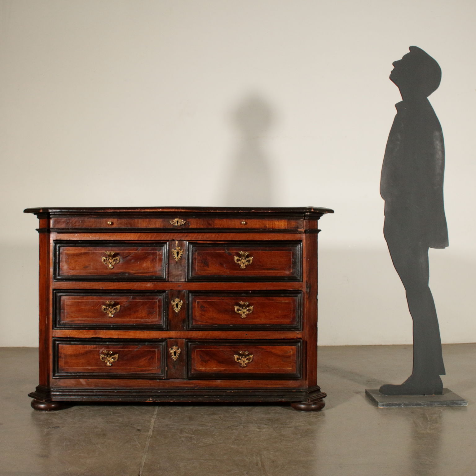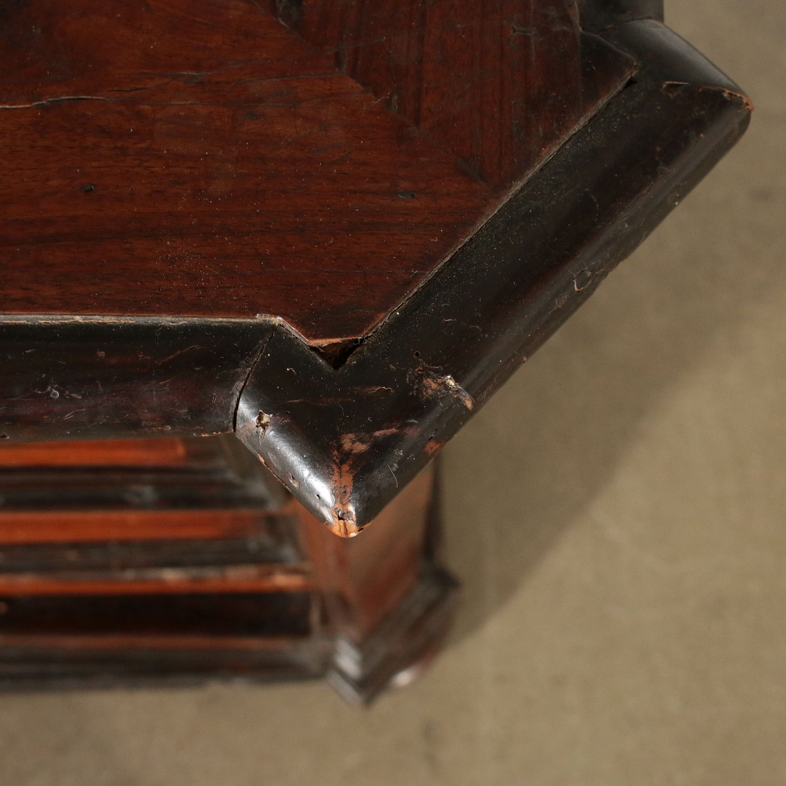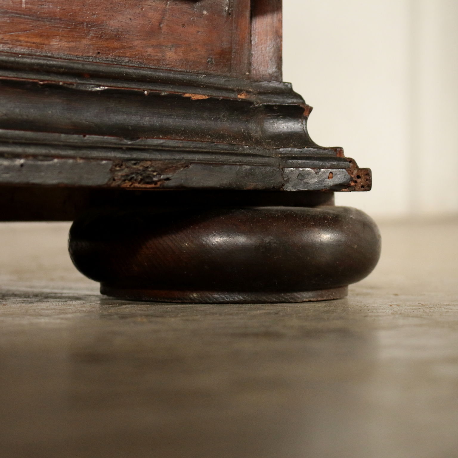 Toskanische Schubladenmöbel mit gedrehten Füßen. Es verfügt über drei Schubladen mit Paneelen sowie eine darunter liegende Schublade. Gekerbte Ständer. Ahornfäden und ebonisierte Frames.