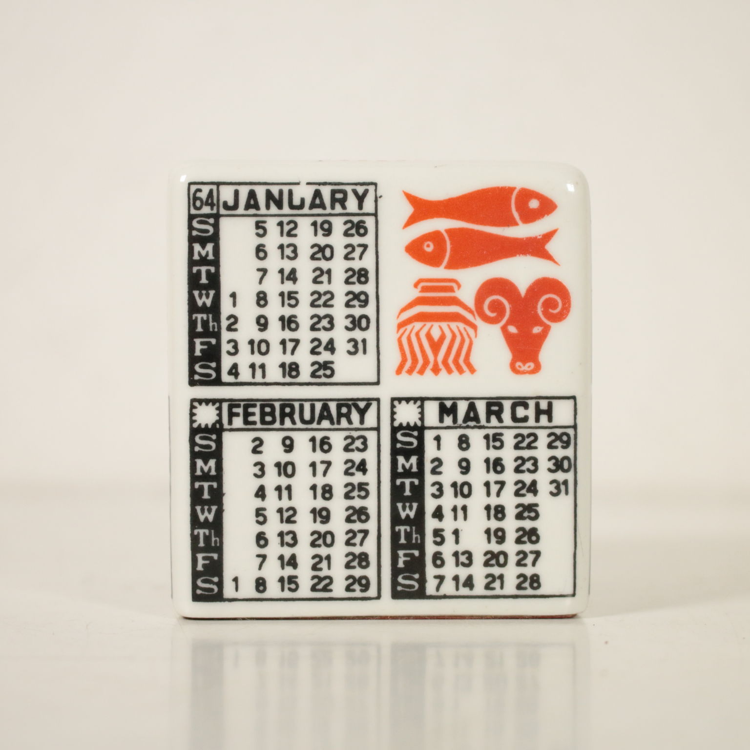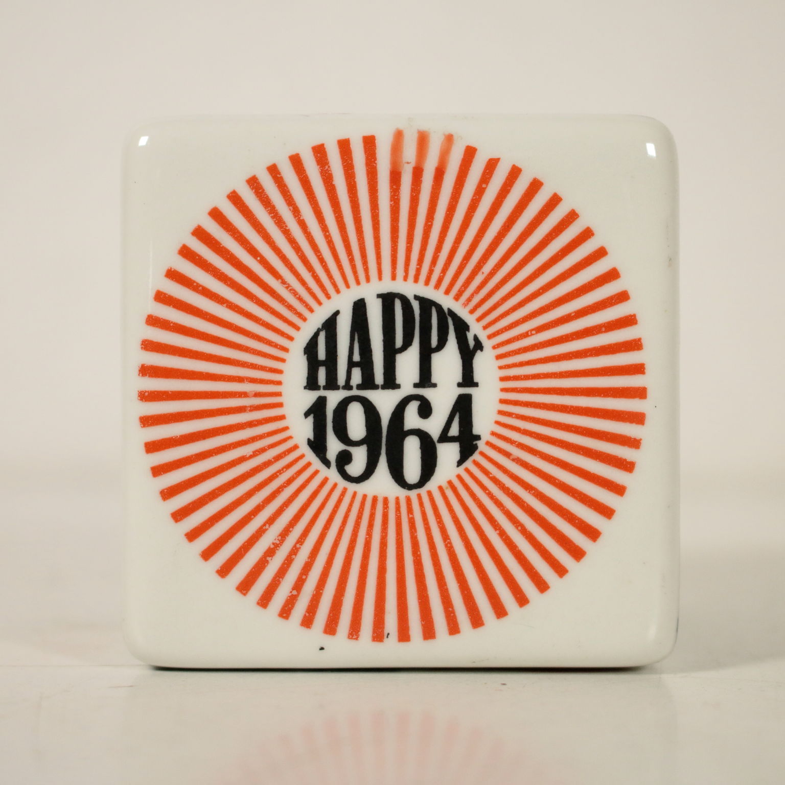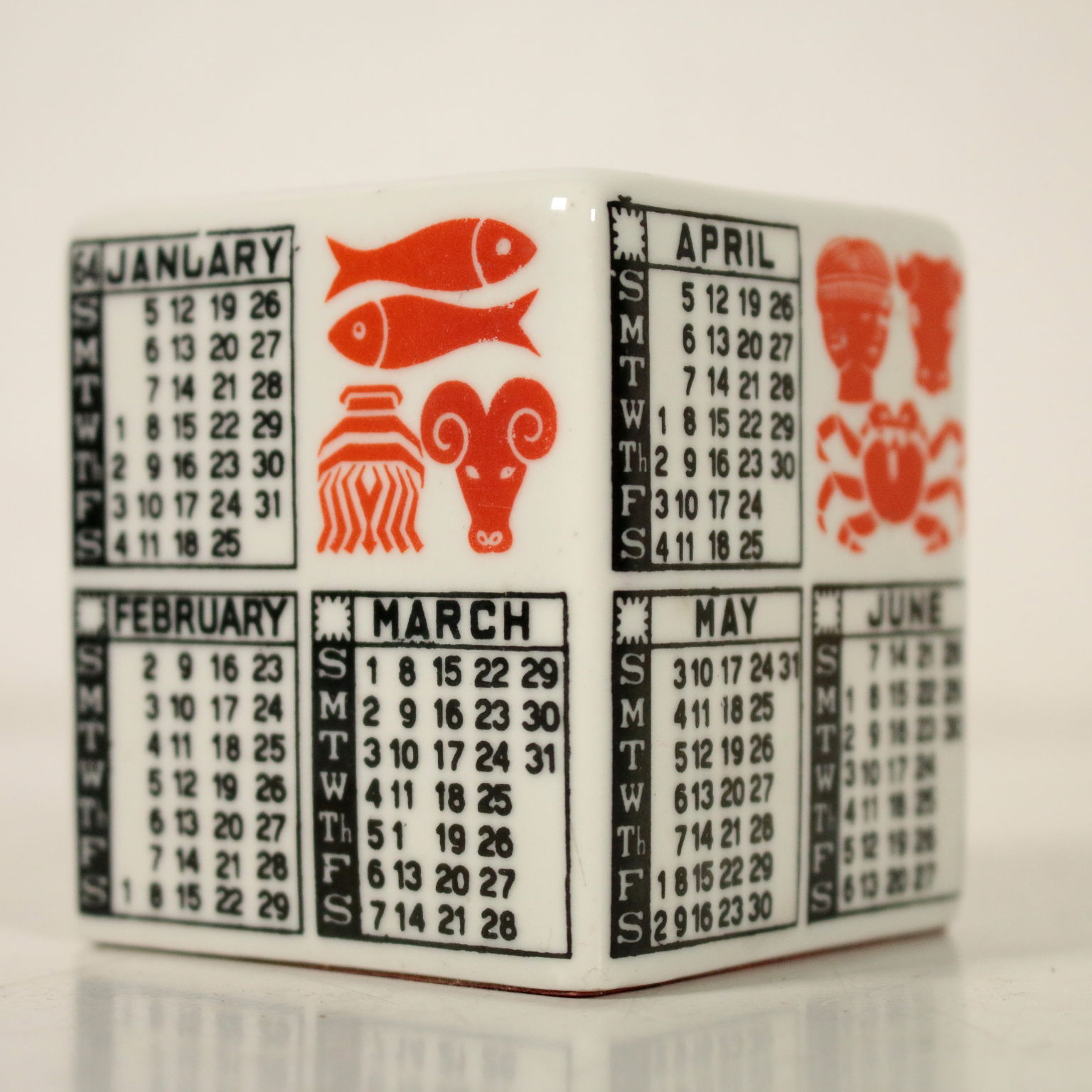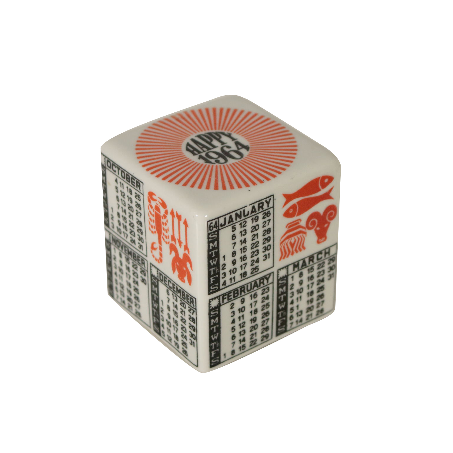 Kubischer Briefbeschwerer aus Keramik, siebgedruckt mit Kalender und Sternzeichen des Jahres 1964. Oben geschrieben "Happy 1964", in radialer Reserve eingeschlossen. Die Basis ist mit Samt bezogen und mit der Marke der Manufaktur versehen.