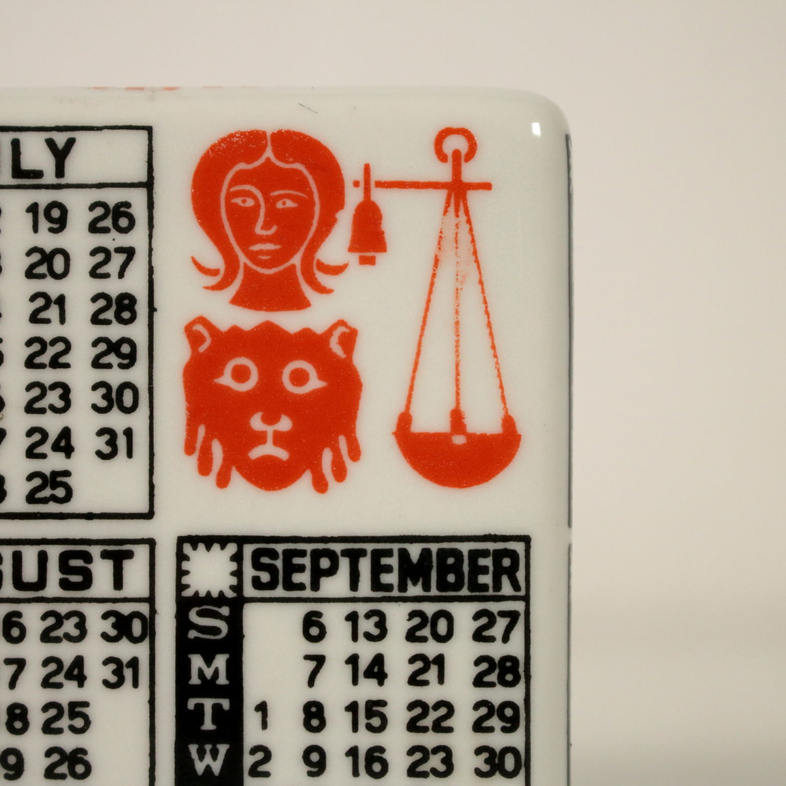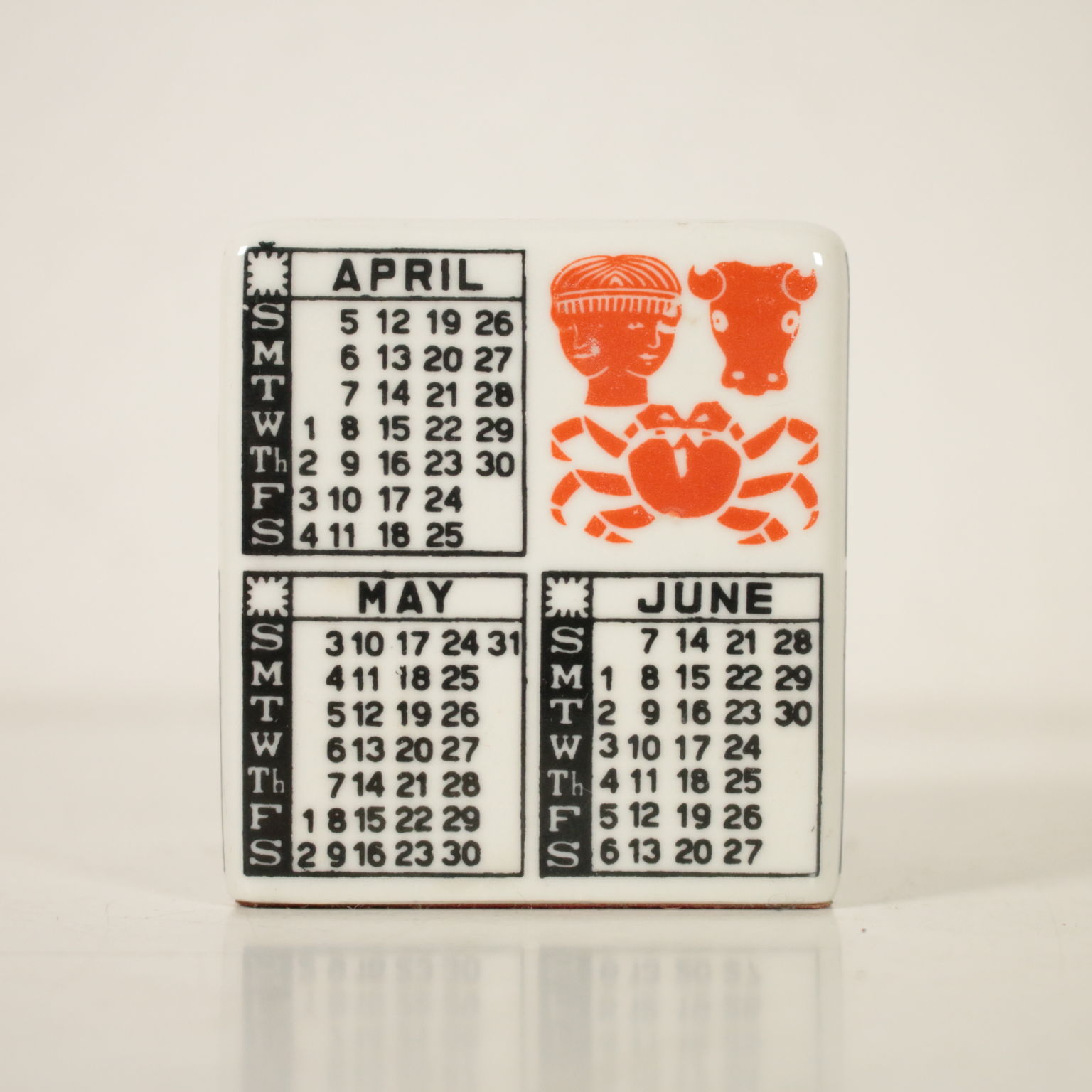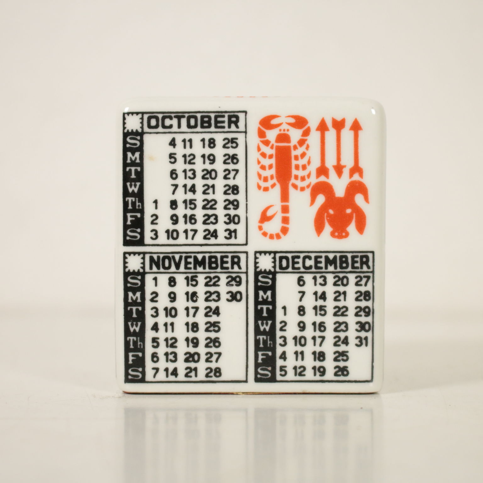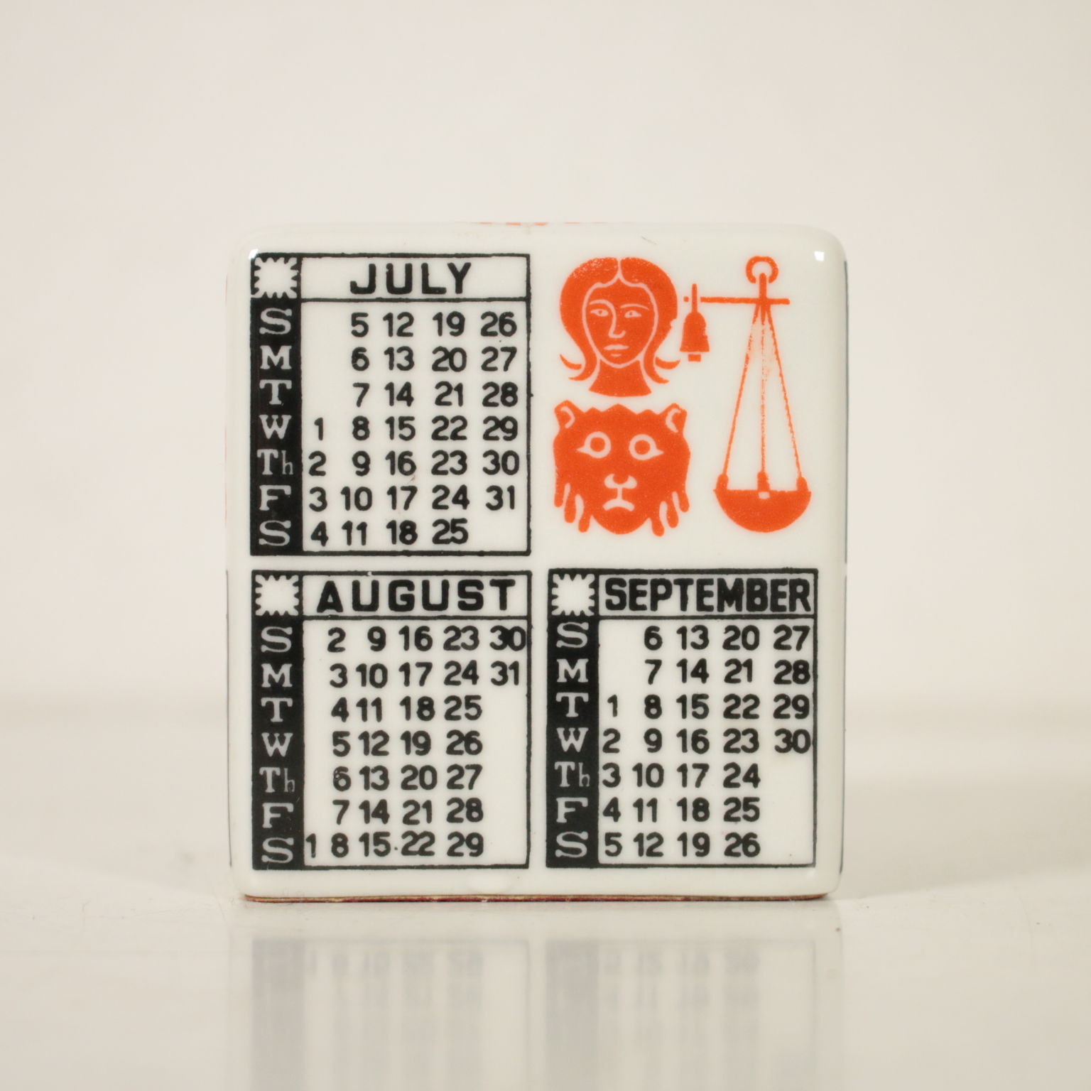 Kubischer Briefbeschwerer aus Keramik, siebgedruckt mit Kalender und Sternzeichen des Jahres 1964. Oben geschrieben "Happy 1964", in radialer Reserve eingeschlossen. Die Basis ist mit Samt bezogen und mit der Marke der Manufaktur versehen.