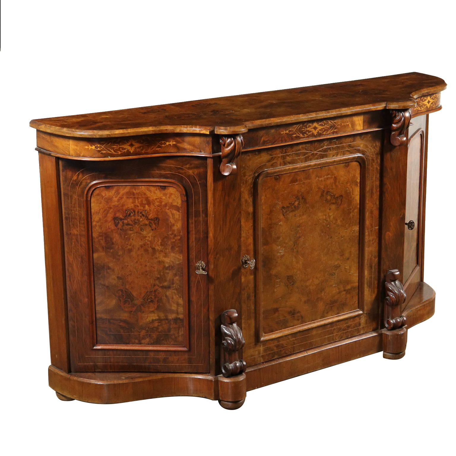 Geschirrschrank mit drei Türen aus Walnussholz, umrahmt mit Rahmen. Geschnitzte Regale und Ahorn Schnitzarbeit.