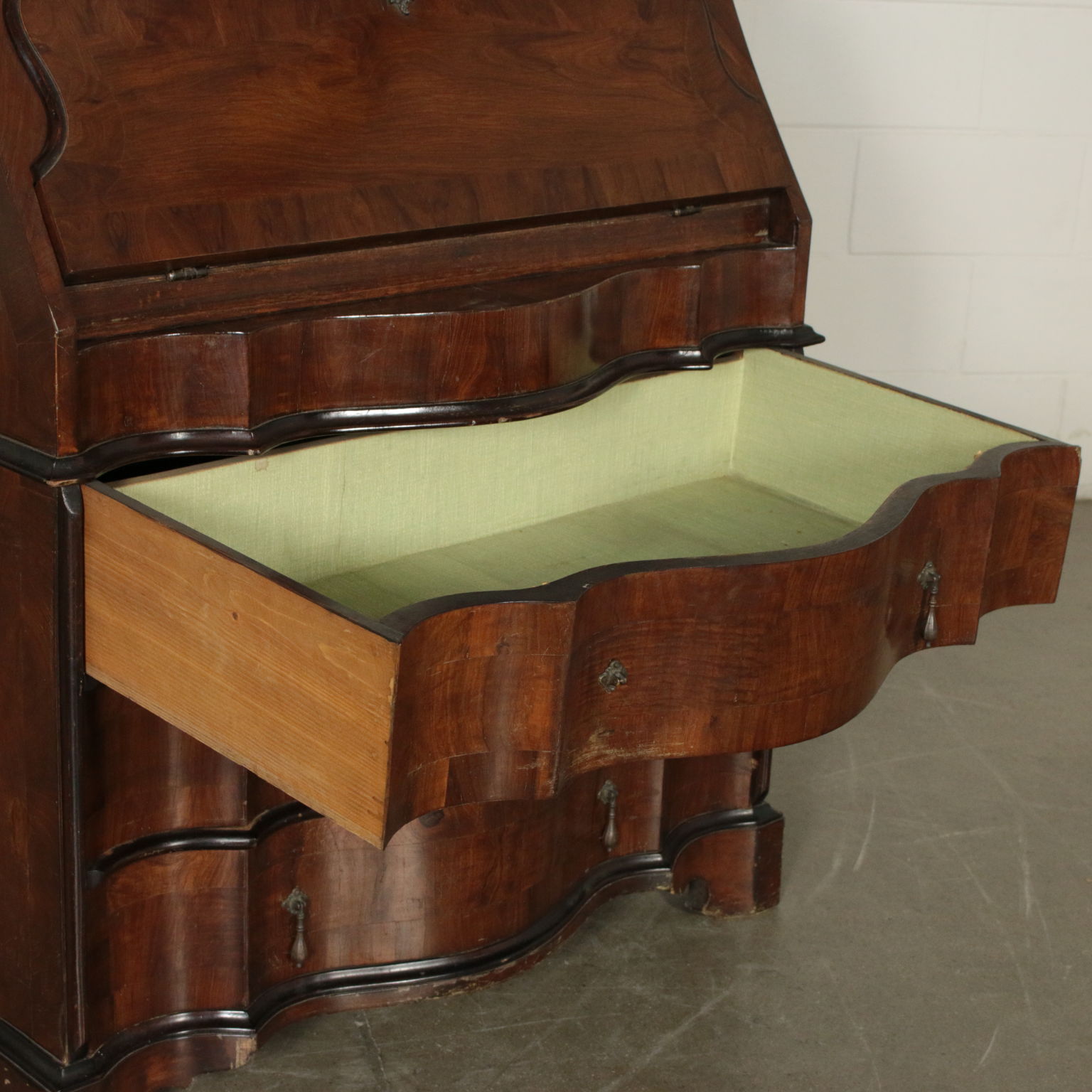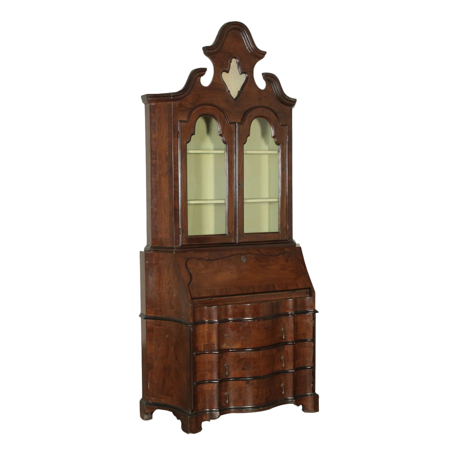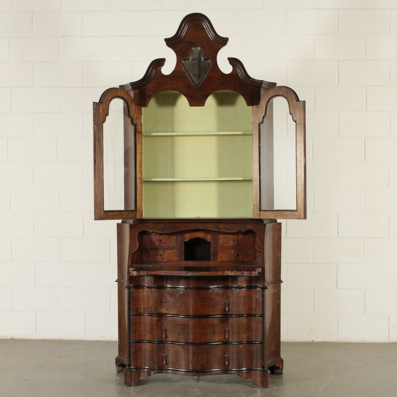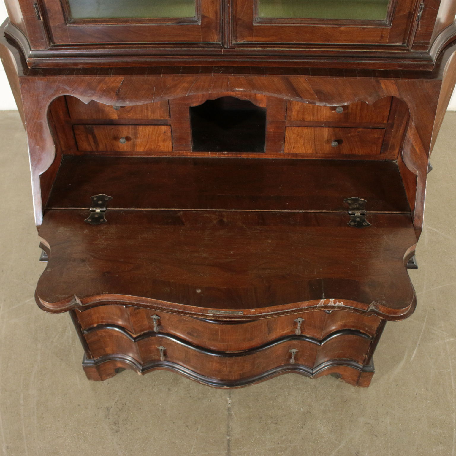 Bewegt auf der stirn und hüften hat drei schubladen und eine klappe. Innerhalb von vier cassettini. Paar türen mit glas und schriftrollen, die mittlere mit spiegel.