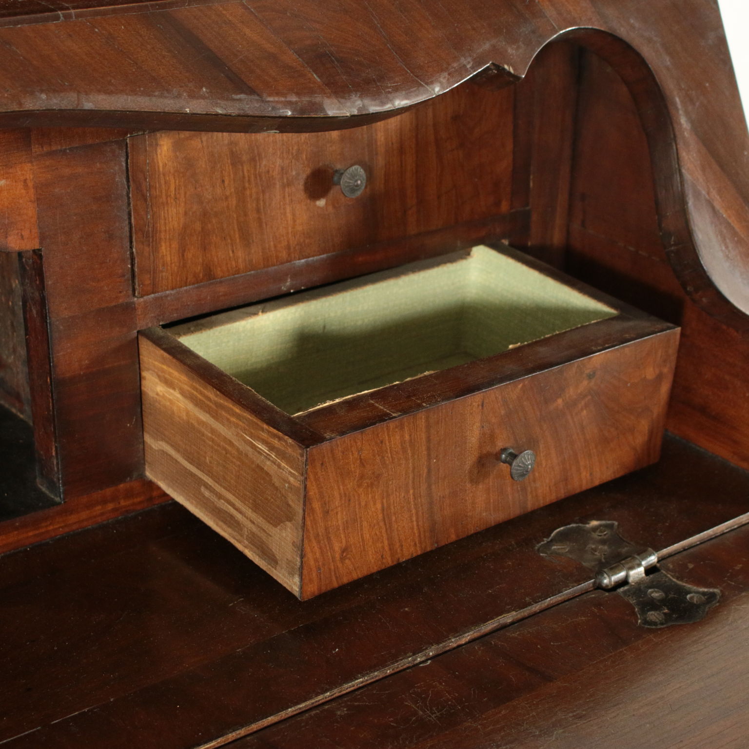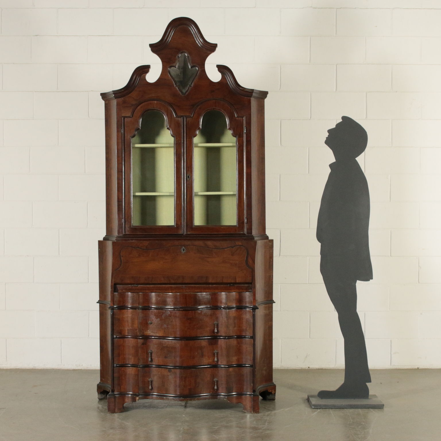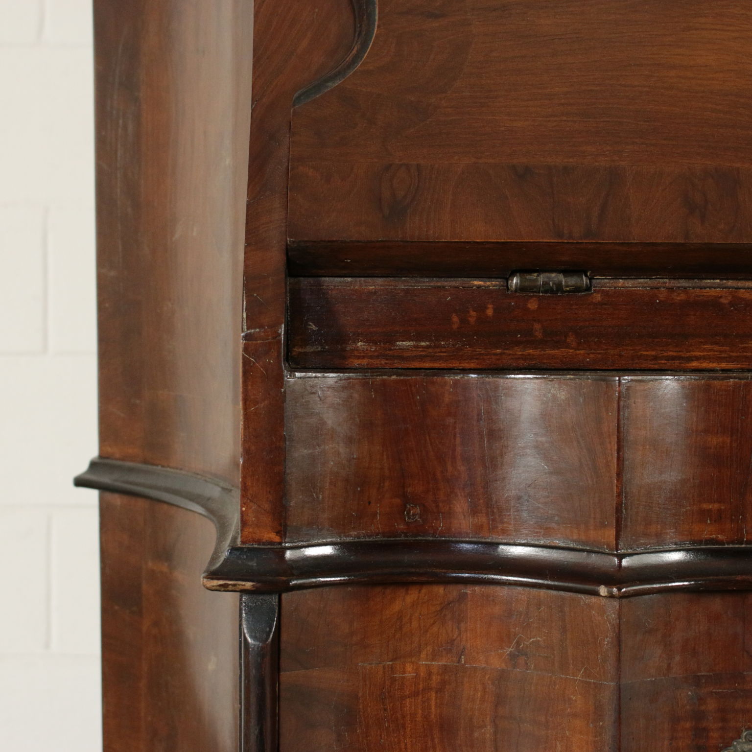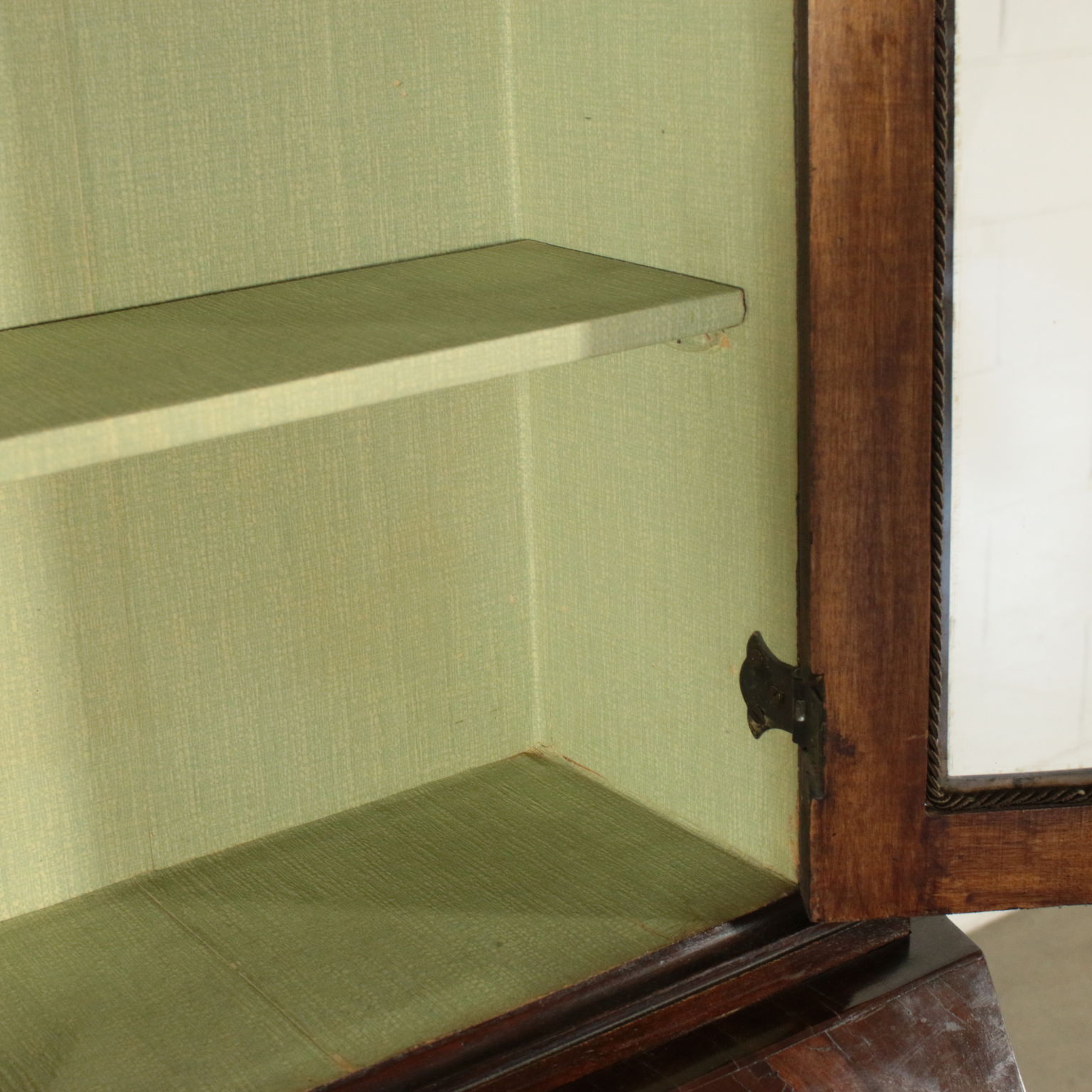 Bewegt auf der stirn und hüften hat drei schubladen und eine klappe. Innerhalb von vier cassettini. Paar türen mit glas und schriftrollen, die mittlere mit spiegel.