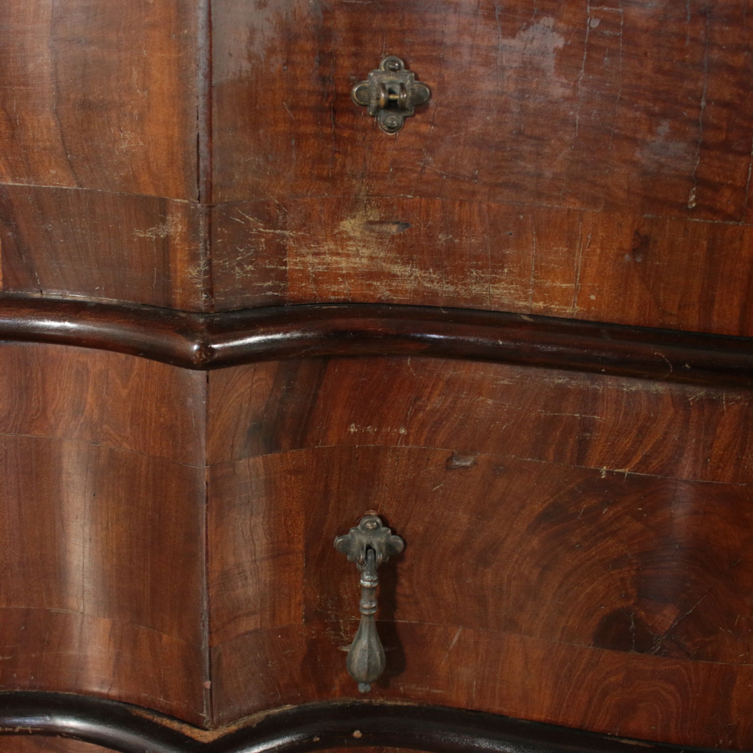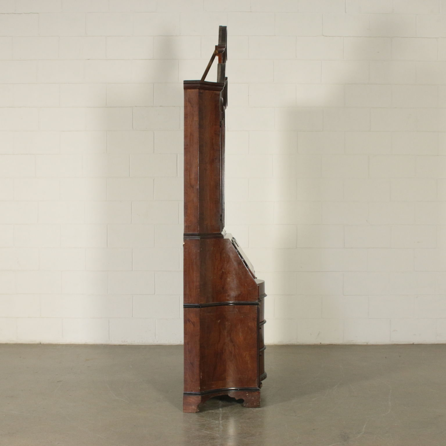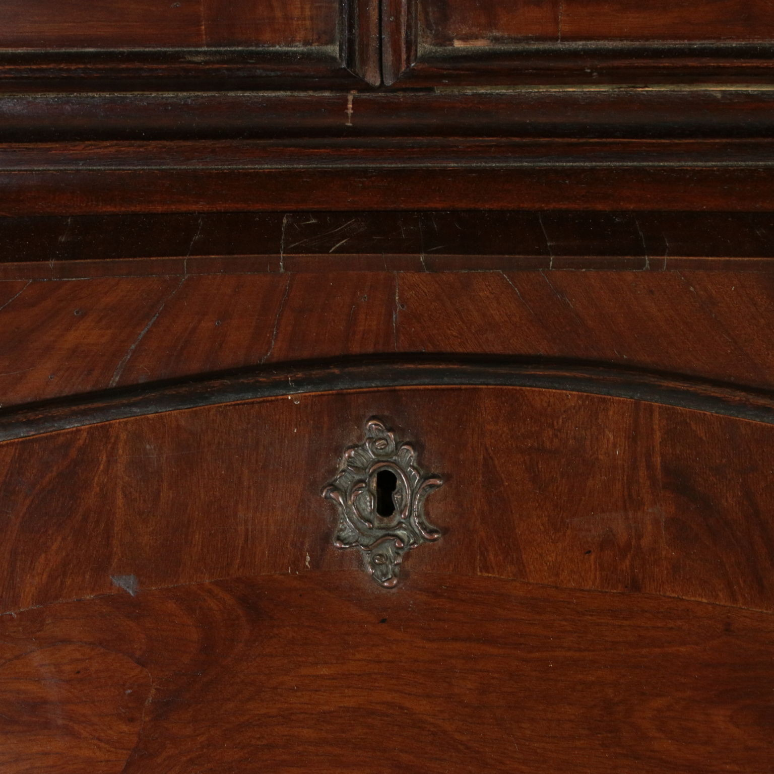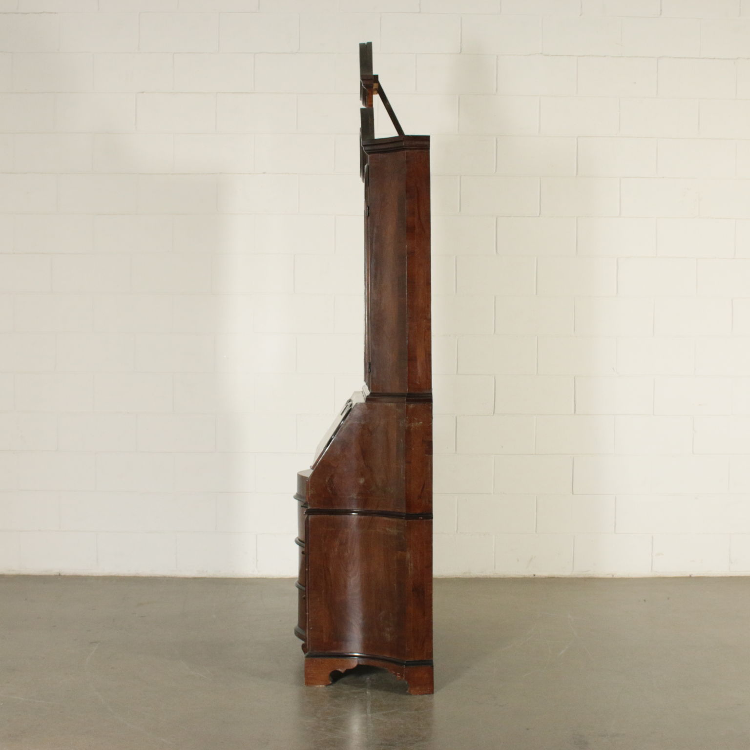 Bewegt auf der stirn und hüften hat drei schubladen und eine klappe. Innerhalb von vier cassettini. Paar türen mit glas und schriftrollen, die mittlere mit spiegel.