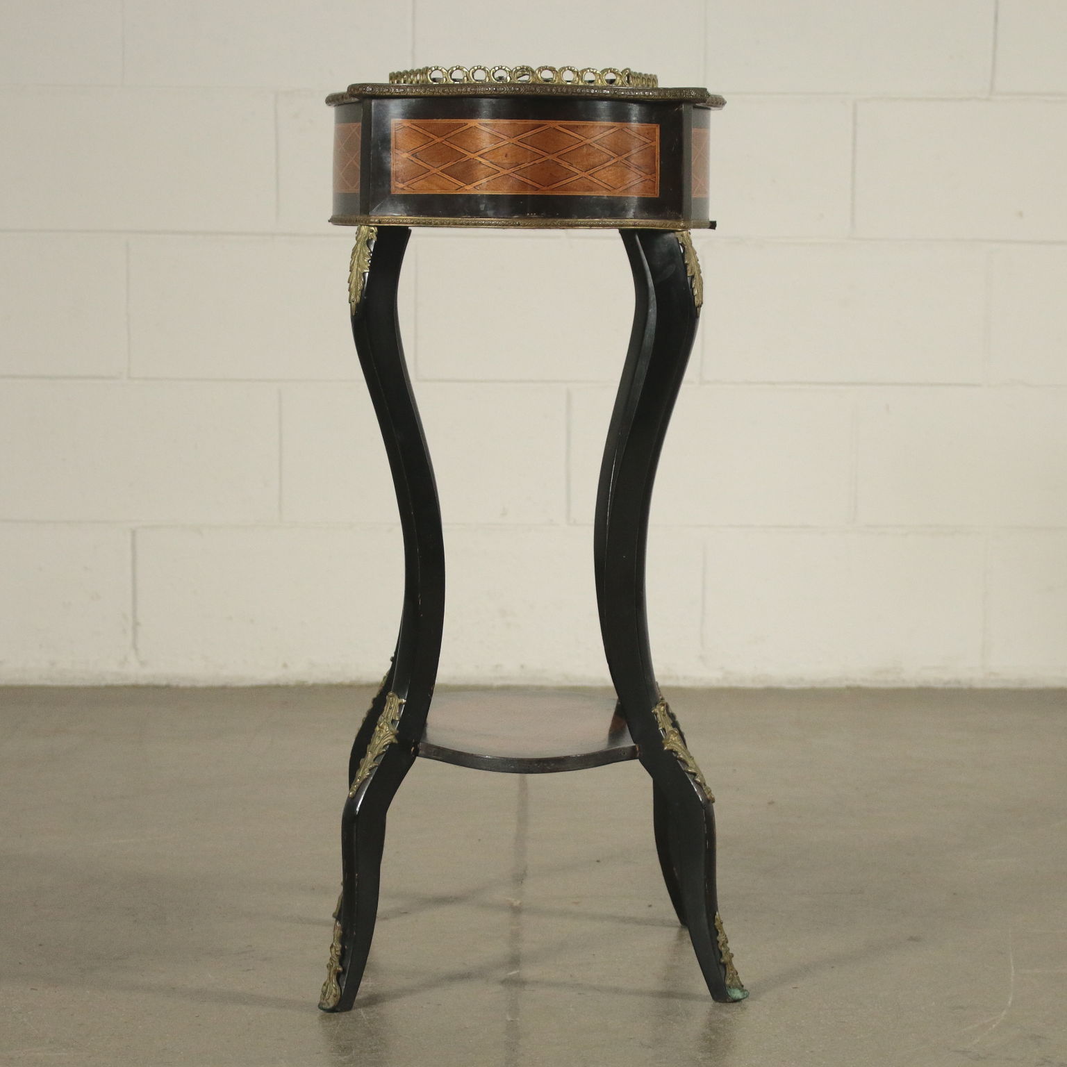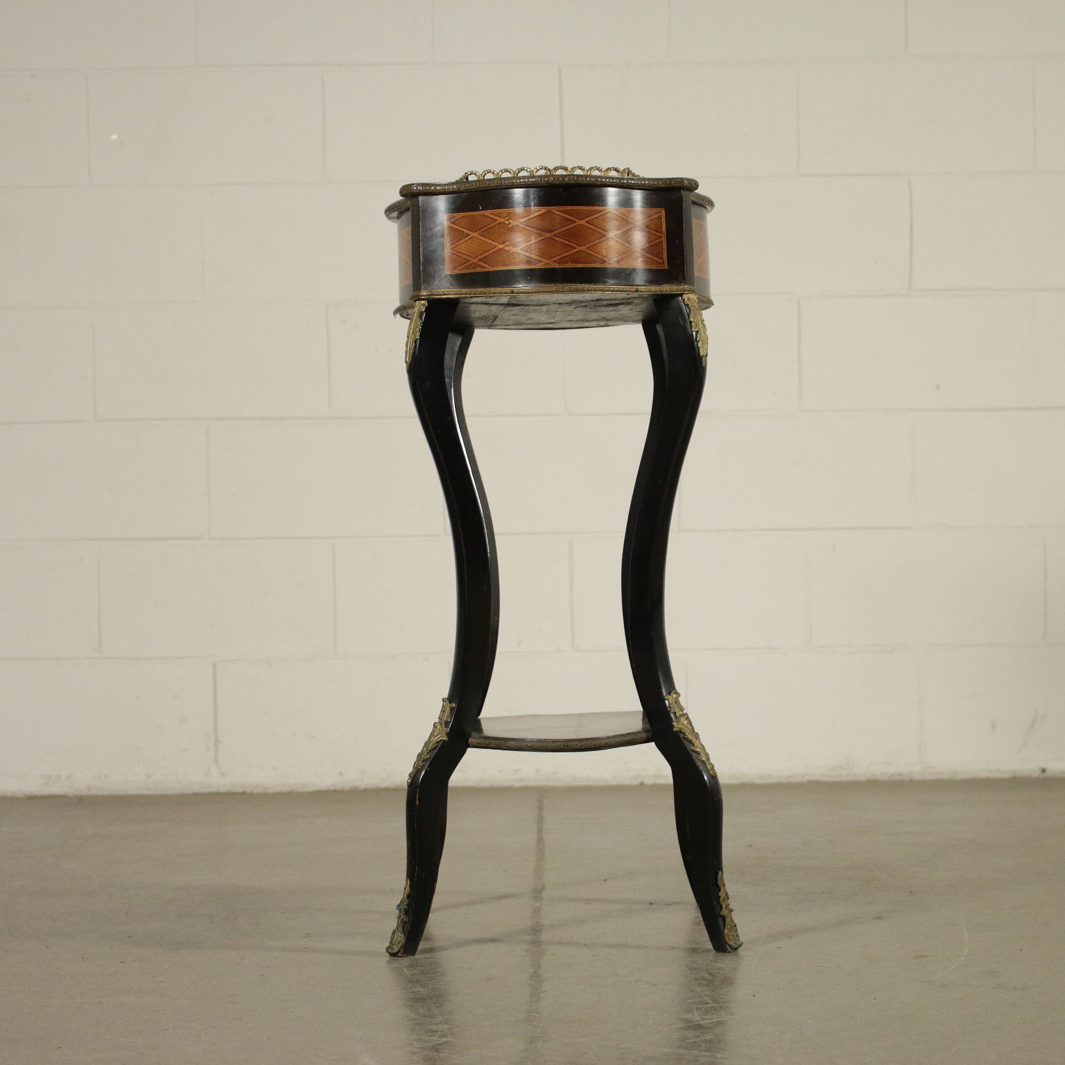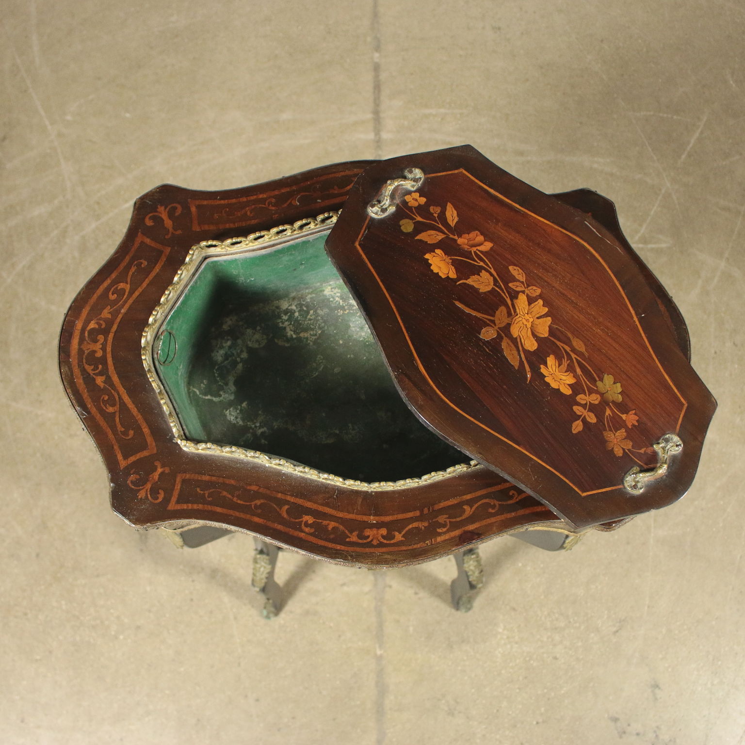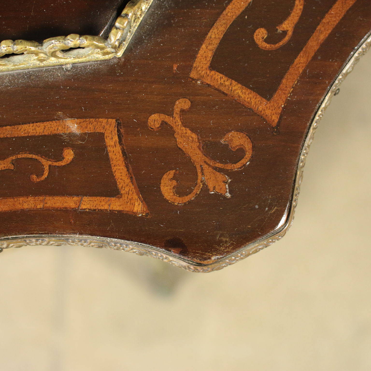 Tisch unterstützt durch beine bewegt verrundete von regal. Plan formte mit hoher rückwand und deckel reich mit intarsien. Innerhalb badewanne pflanzgefäß ausziehbarer zink. Präsentiert intarsien geometric; rahmen und friese in bronze.