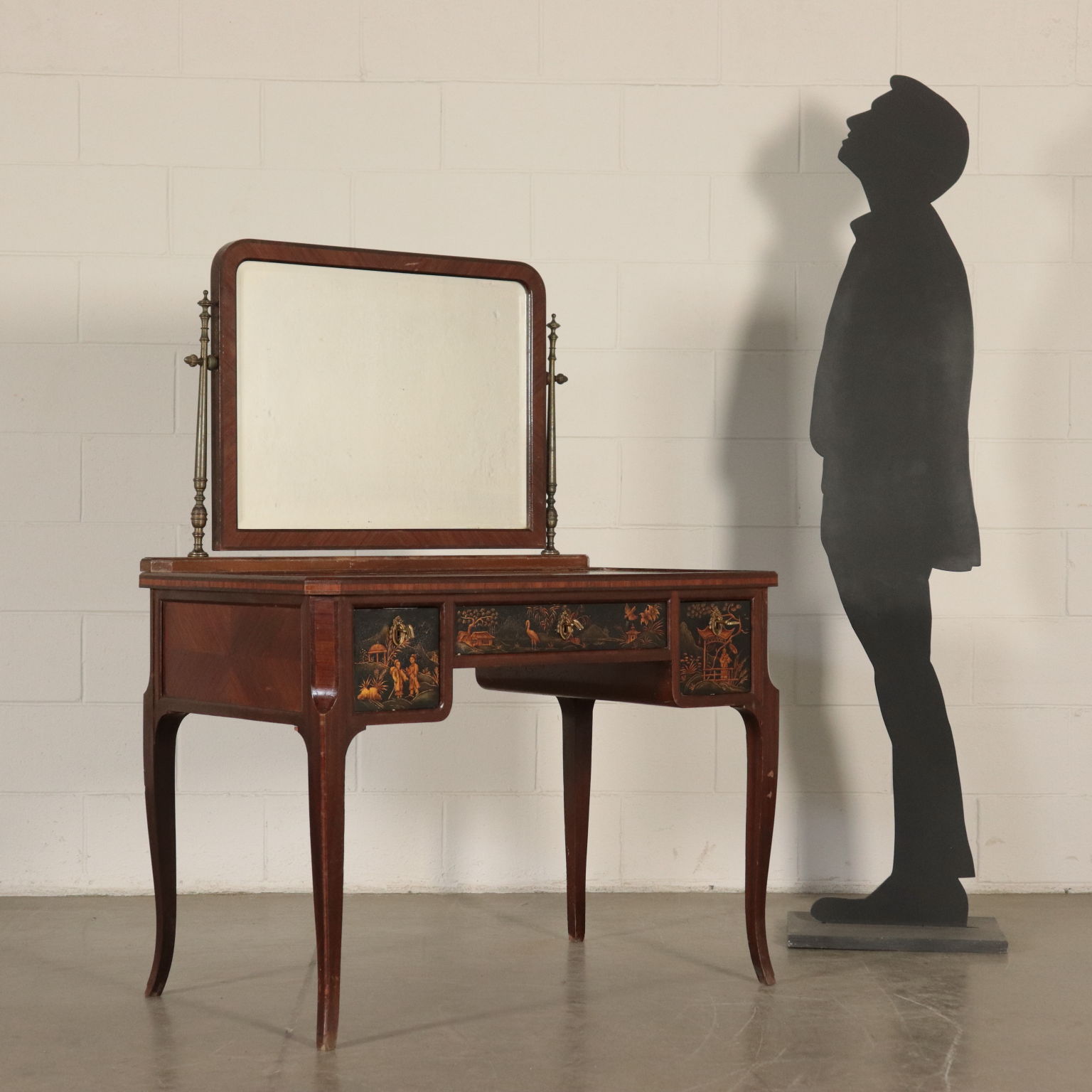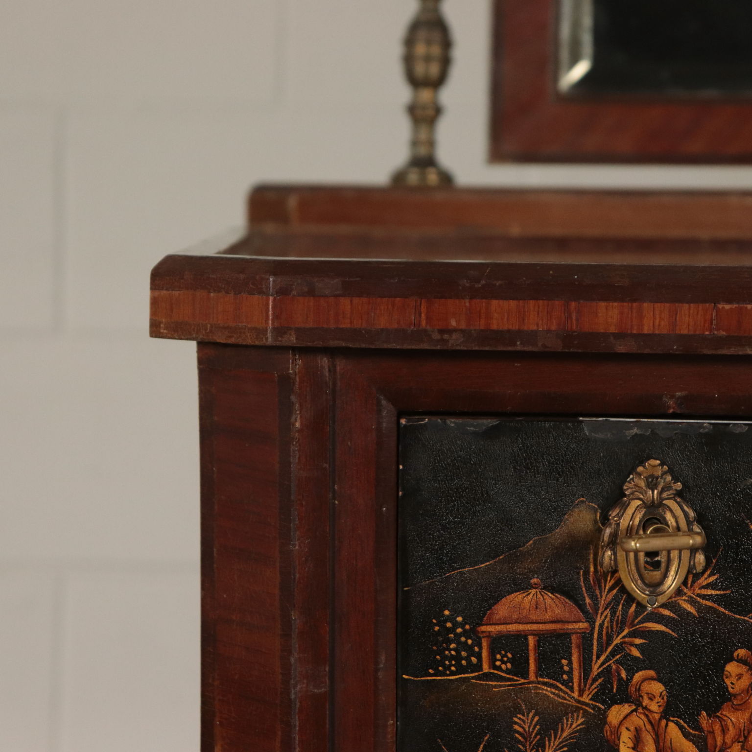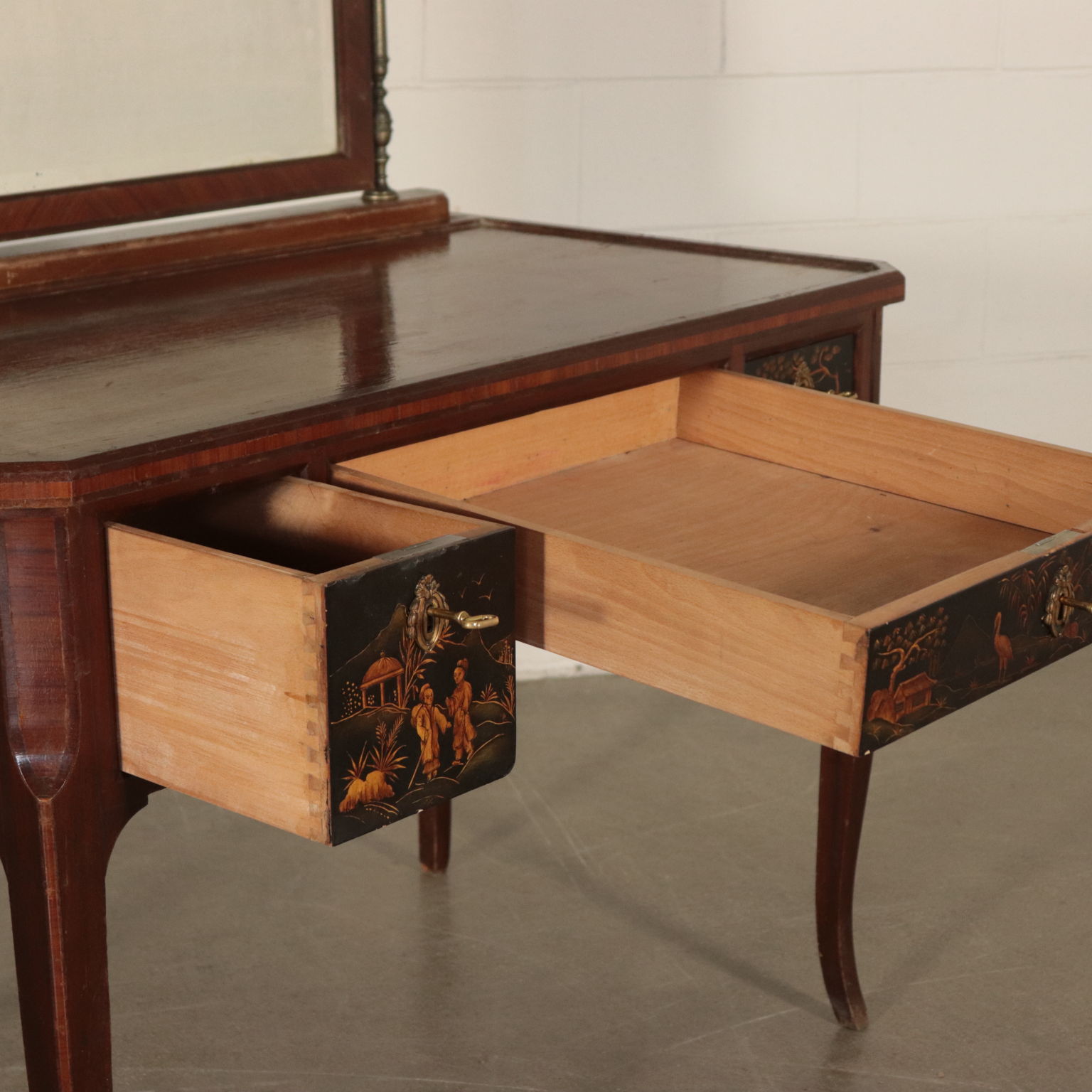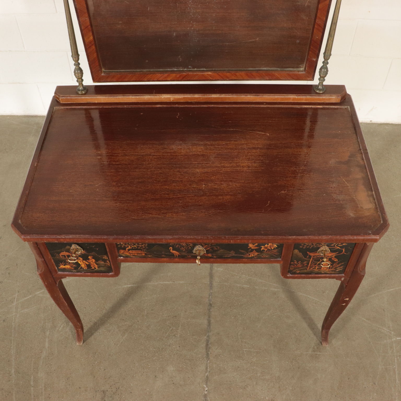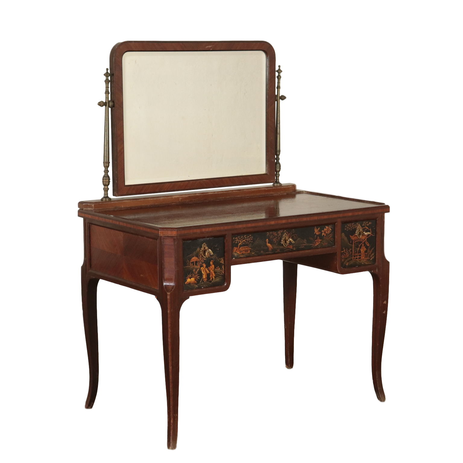 Toiletten mit drei schubladen, lackiert und mit chinoiserie-dekorationen. Spiegel kippen gerade von drehbearbeitungen aus messing.