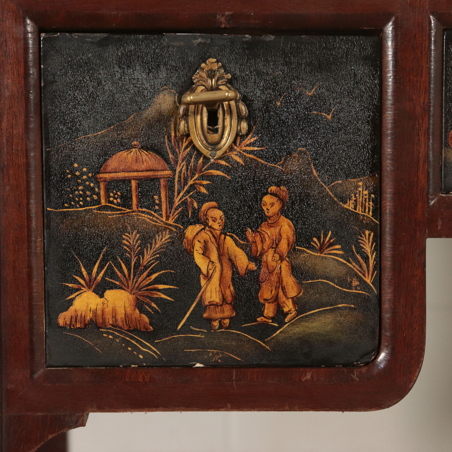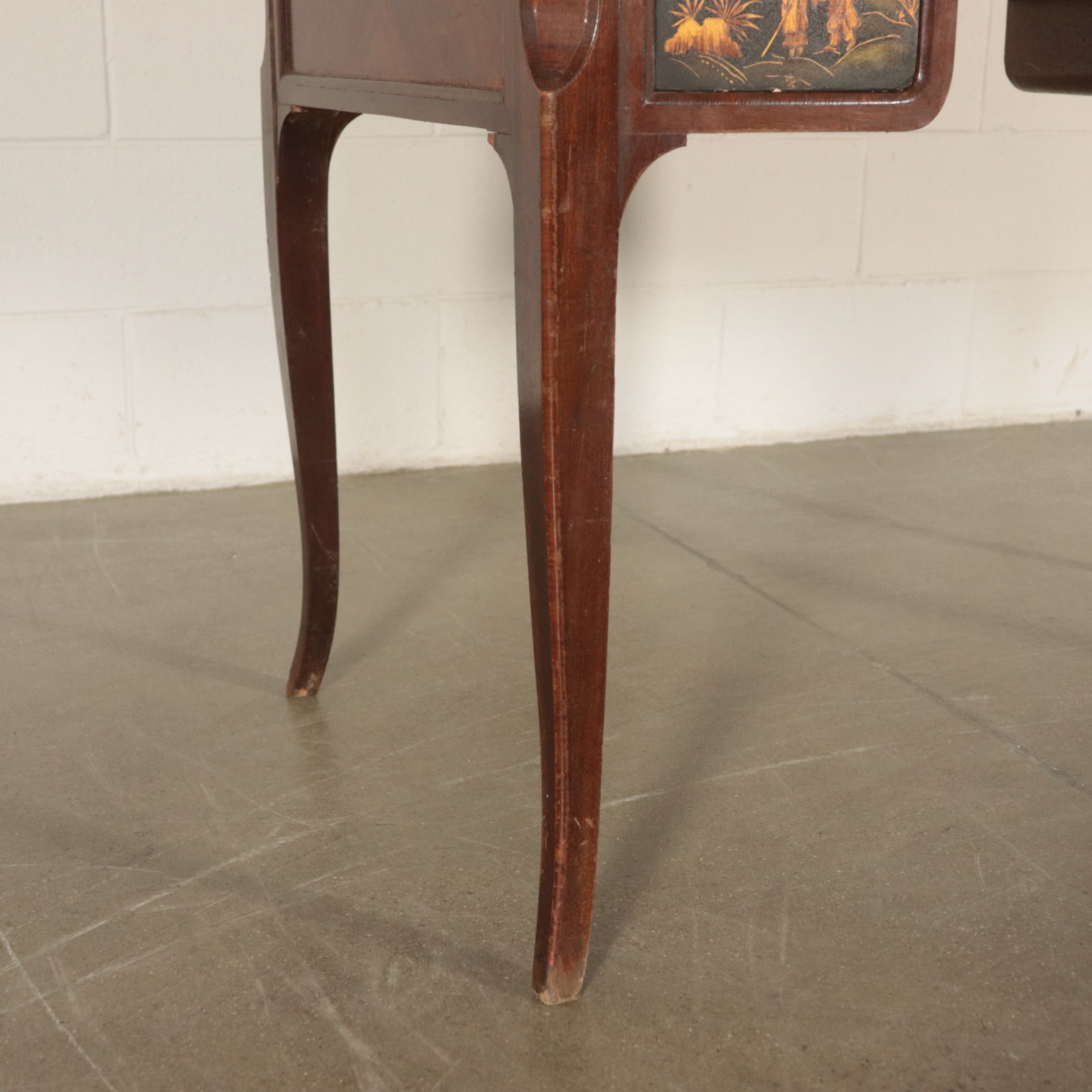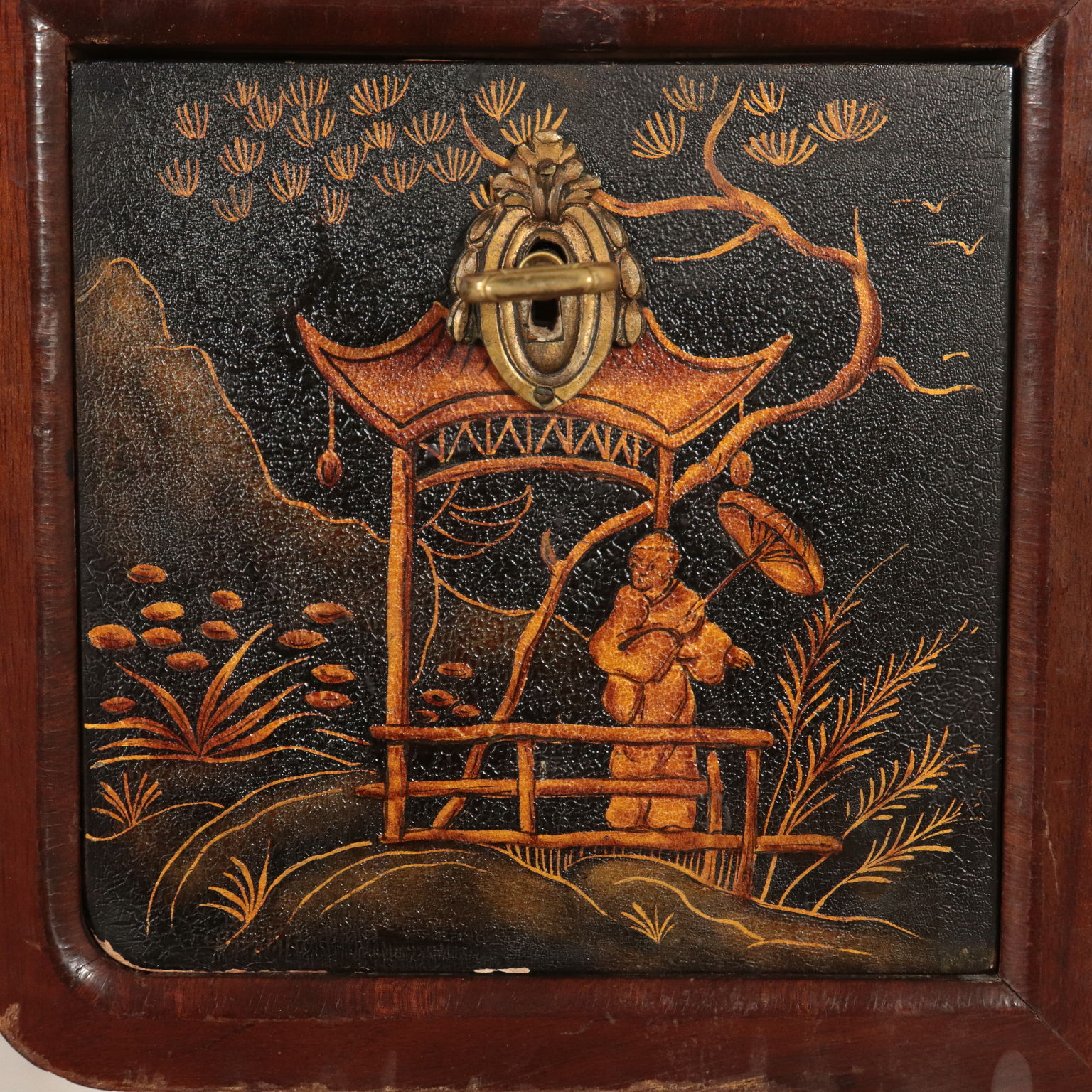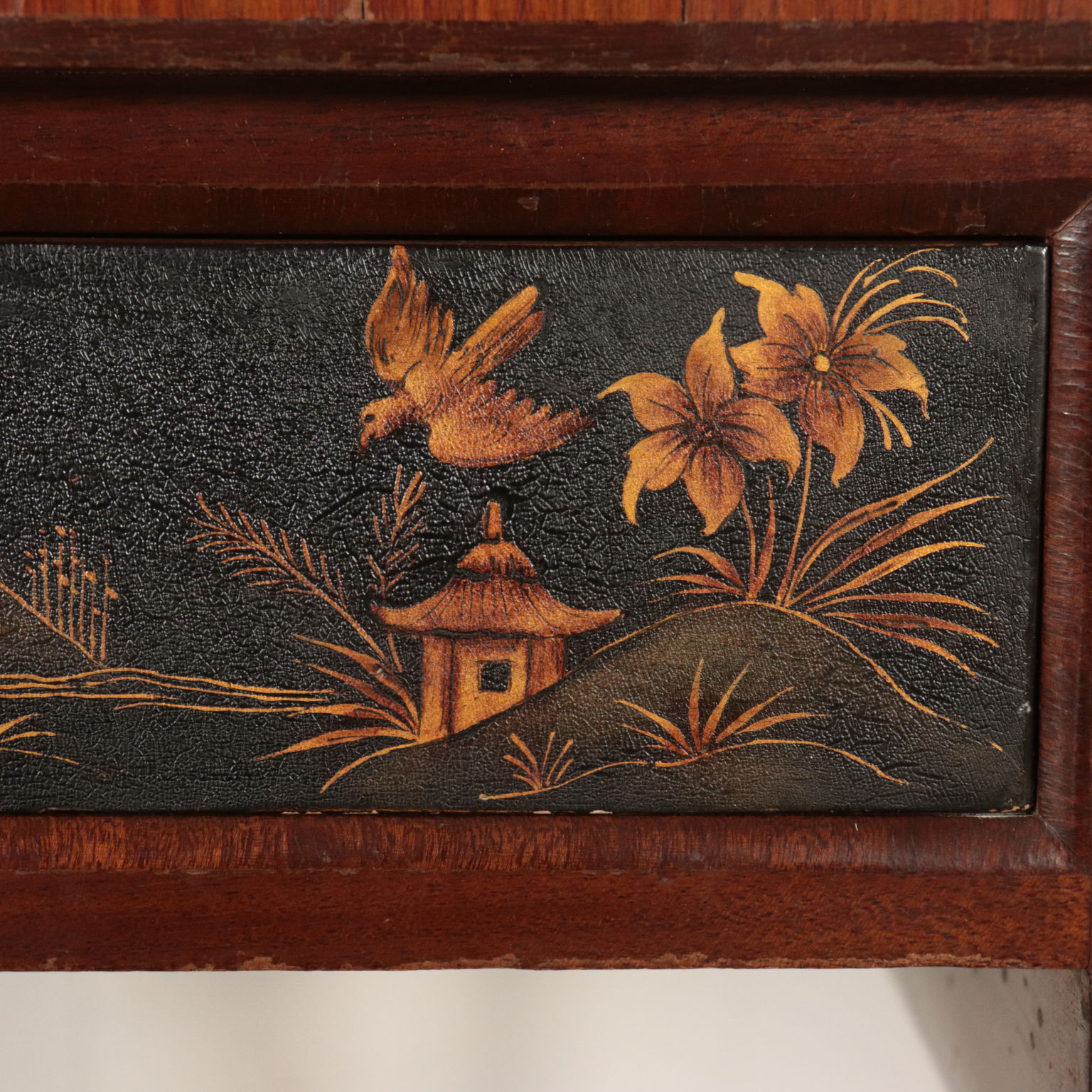 Toiletten mit drei schubladen, lackiert und mit chinoiserie-dekorationen. Spiegel kippen gerade von drehbearbeitungen aus messing.