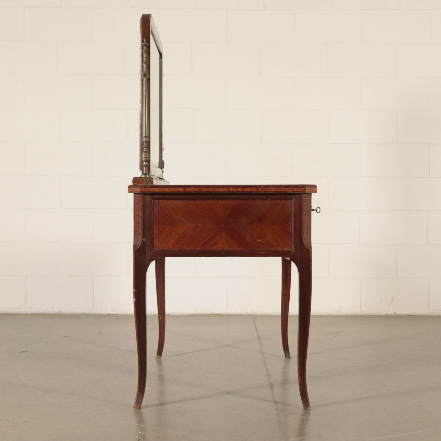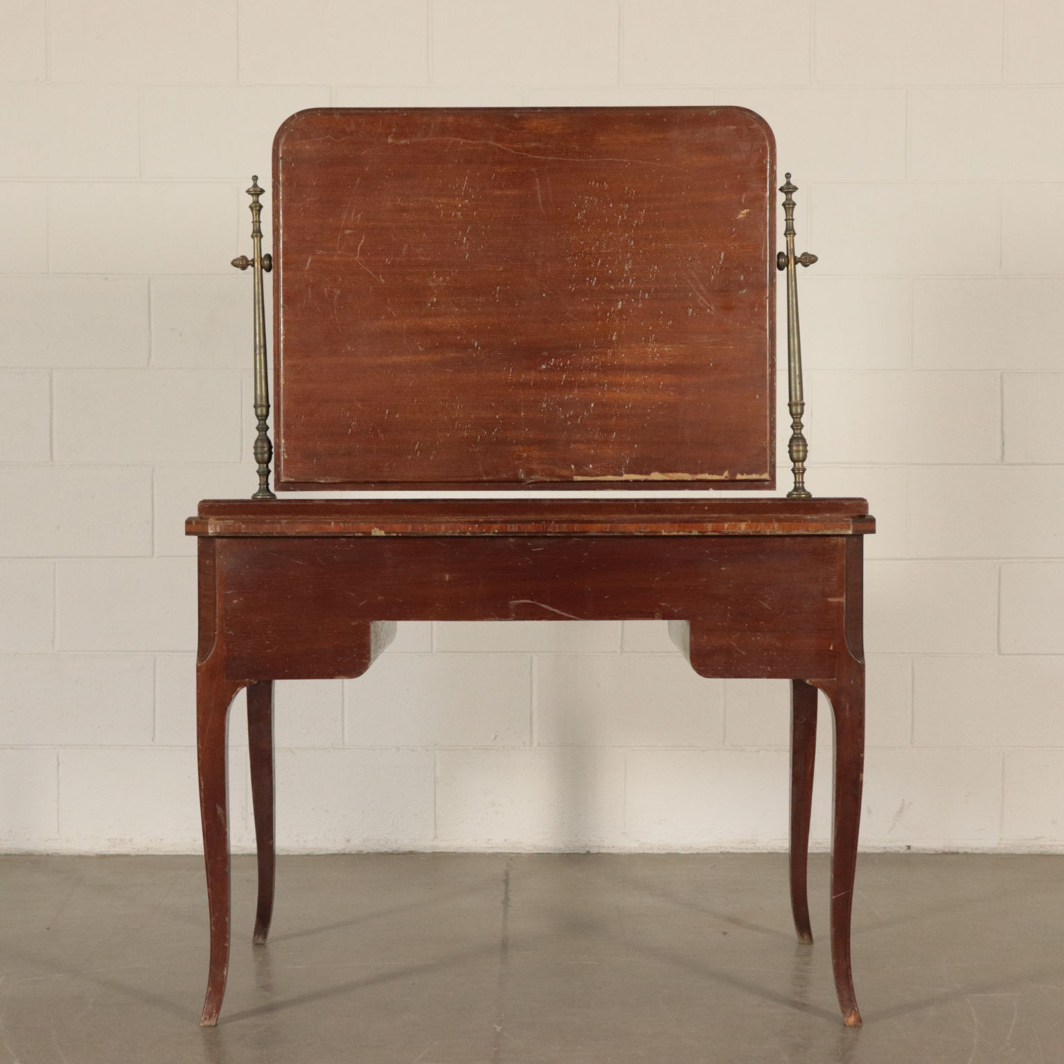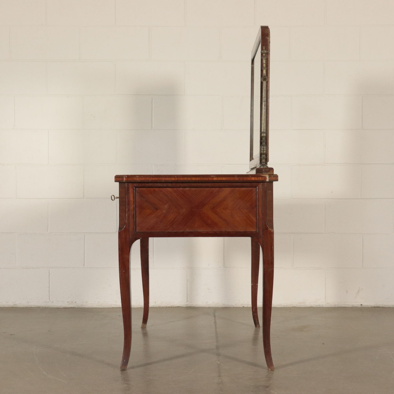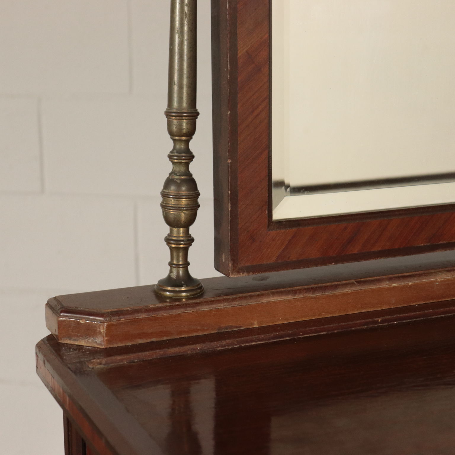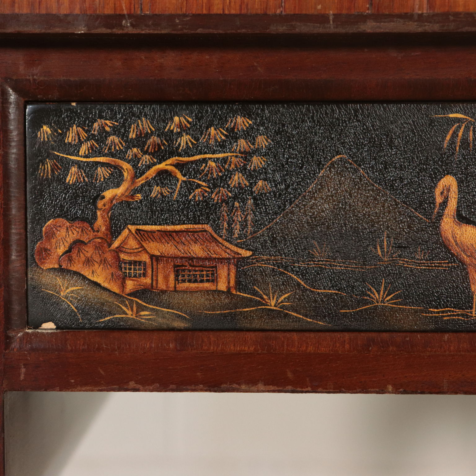 Toiletten mit drei schubladen, lackiert und mit chinoiserie-dekorationen. Spiegel kippen gerade von drehbearbeitungen aus messing.