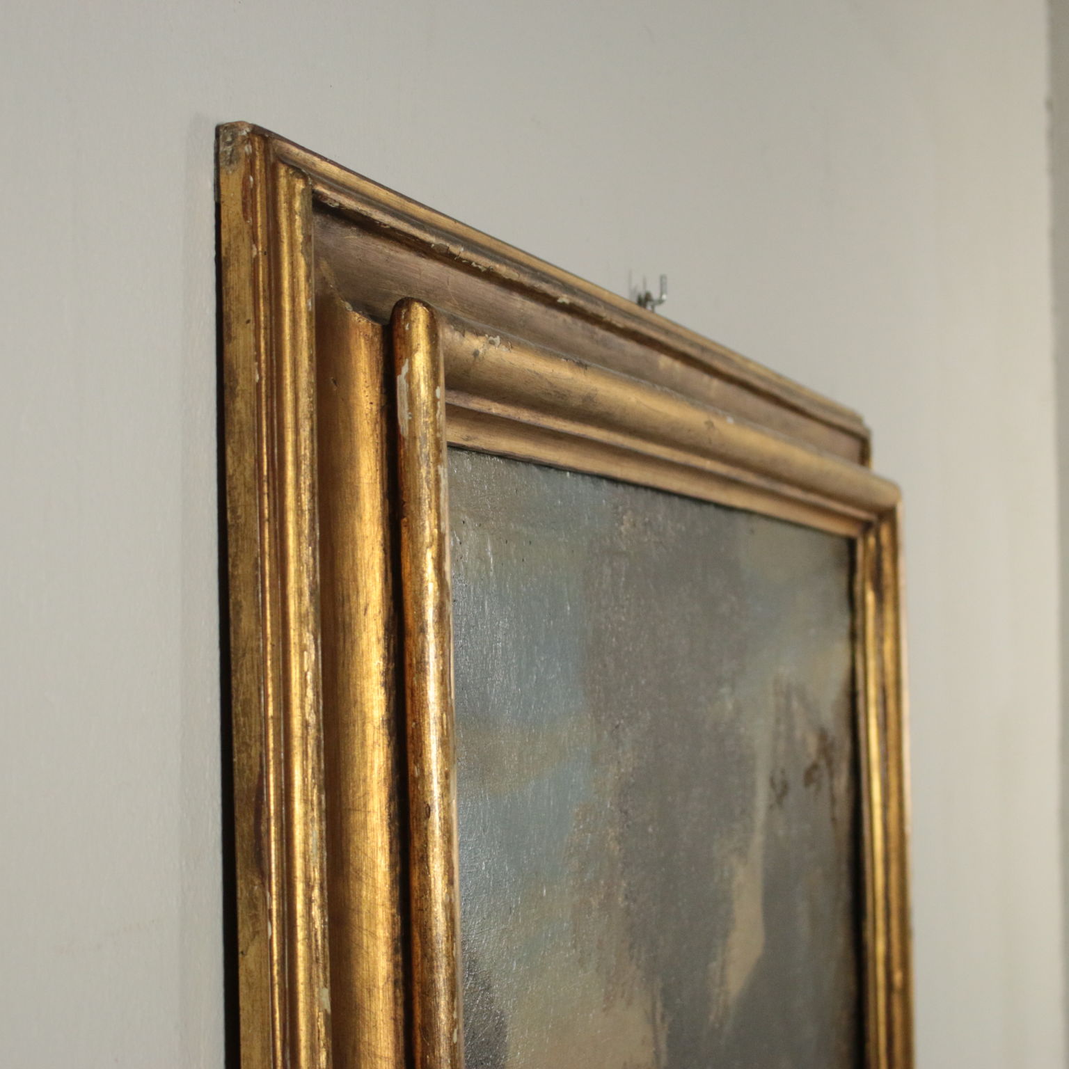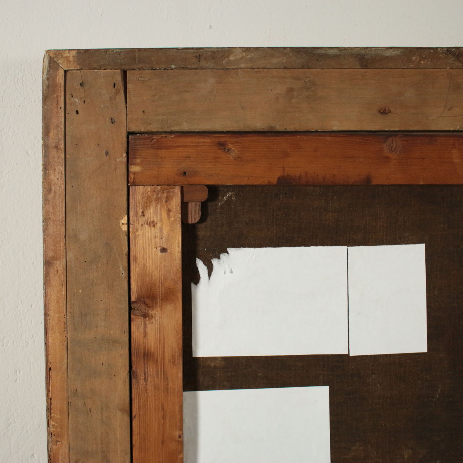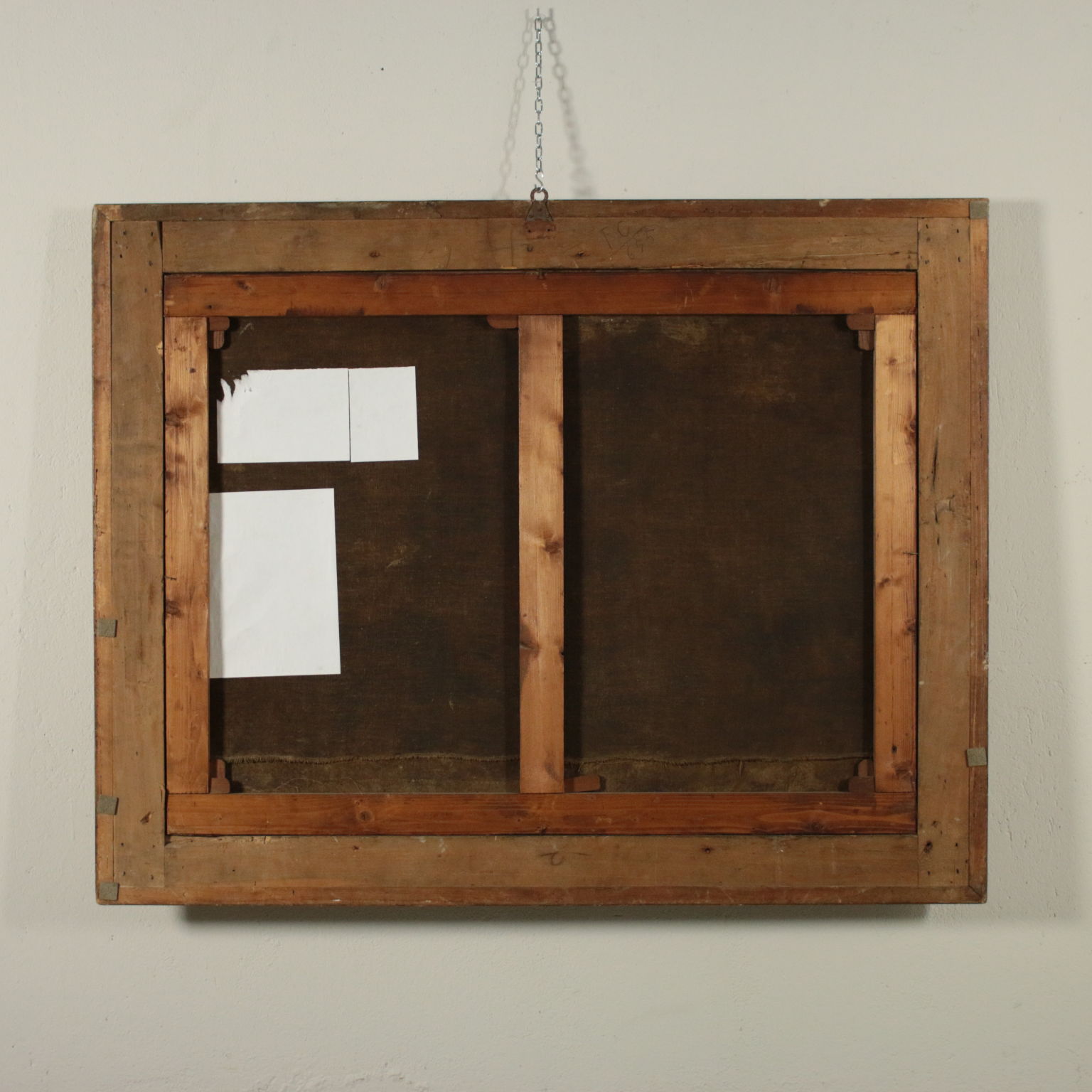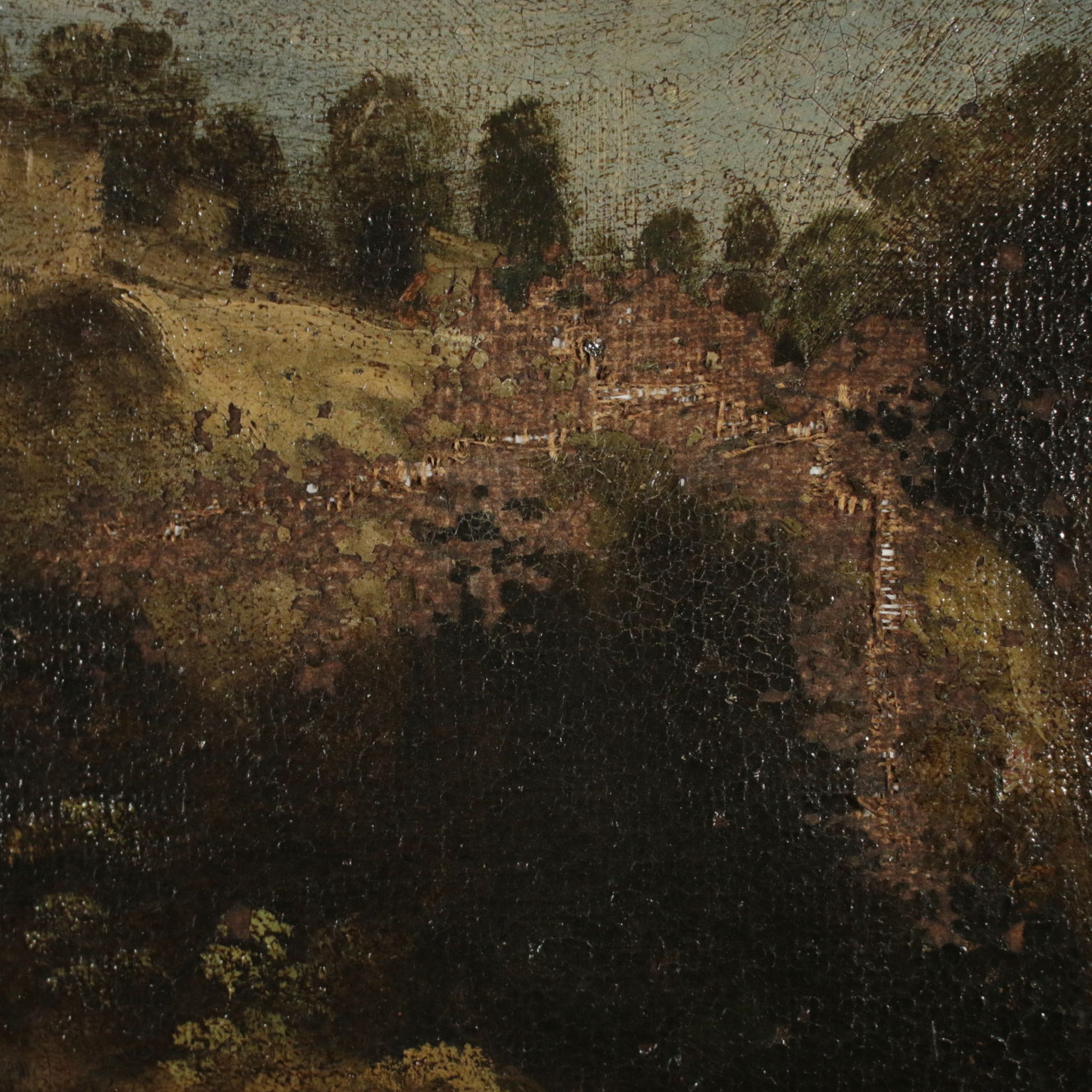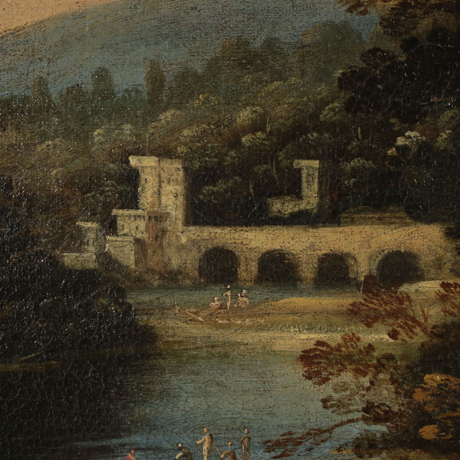 Öl auf leinwand. Die landschaft sieht man einen kleinen wasserlauf, der mitten durch den wald, mit kaskade überquerung von der brücke aus stein; sie leiten figuren beliebt, der mann mit dem esel nach rechts, die paar wanderer nach links; in der ferne hintergrund eine größere brücke über den fluss breiter, in der nähe der wohnungen. Noch in der ersten leinwand, mit zeichen der restaurierung der vorherigen (flicken auf der rückseite), präsentiert verschiedene fälle der farbe. Präsentiert in rahmen aus der selben zeit stammt, ridorata.