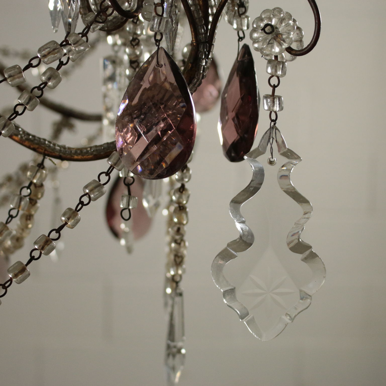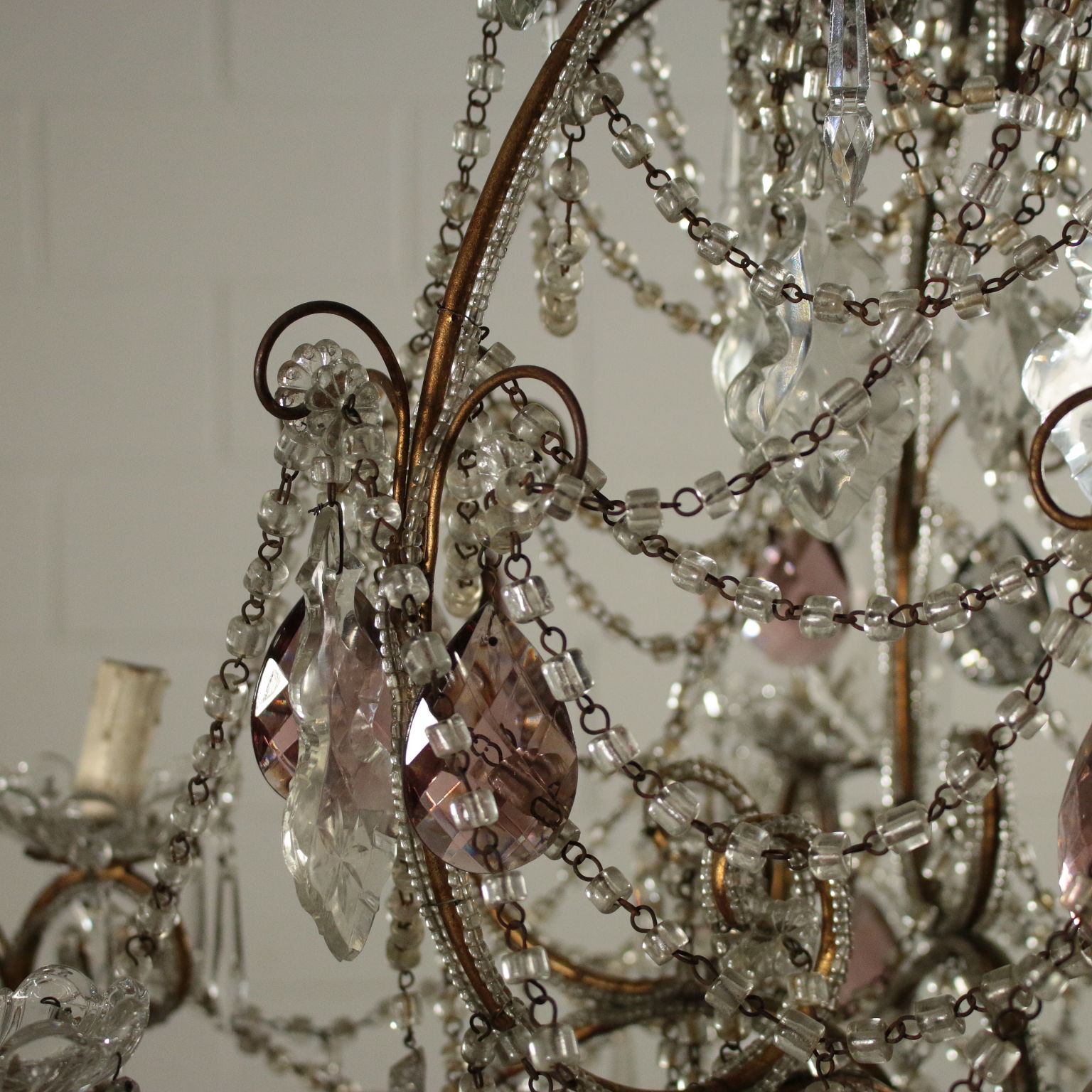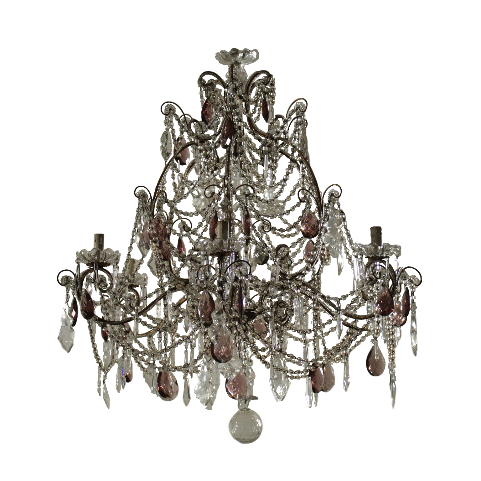 Kronleuchter, sechs arme mit schleifen und anhängern aus glas. Hat einige anhänger gefärbt.