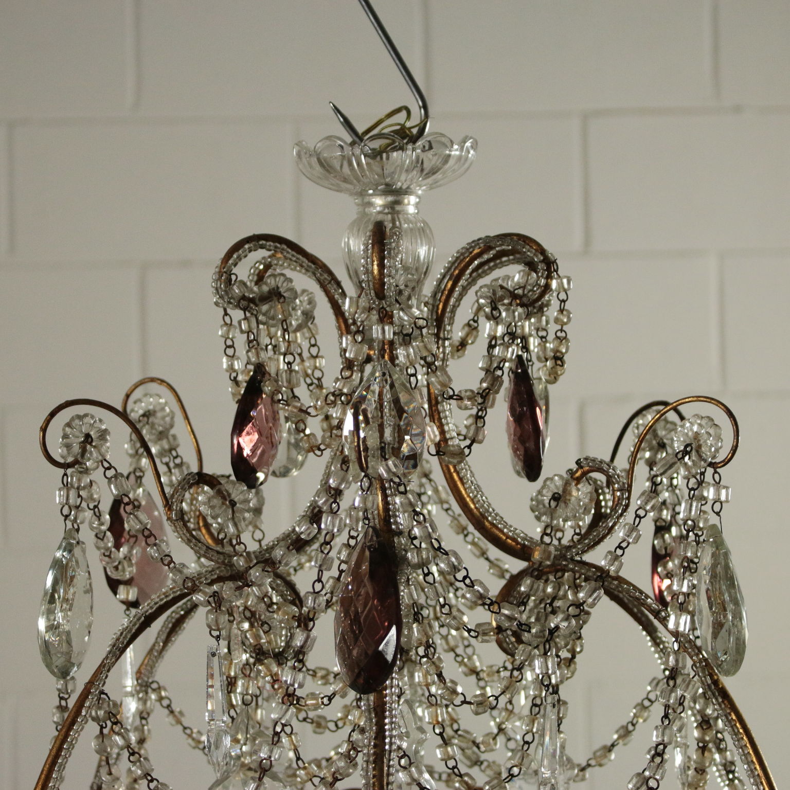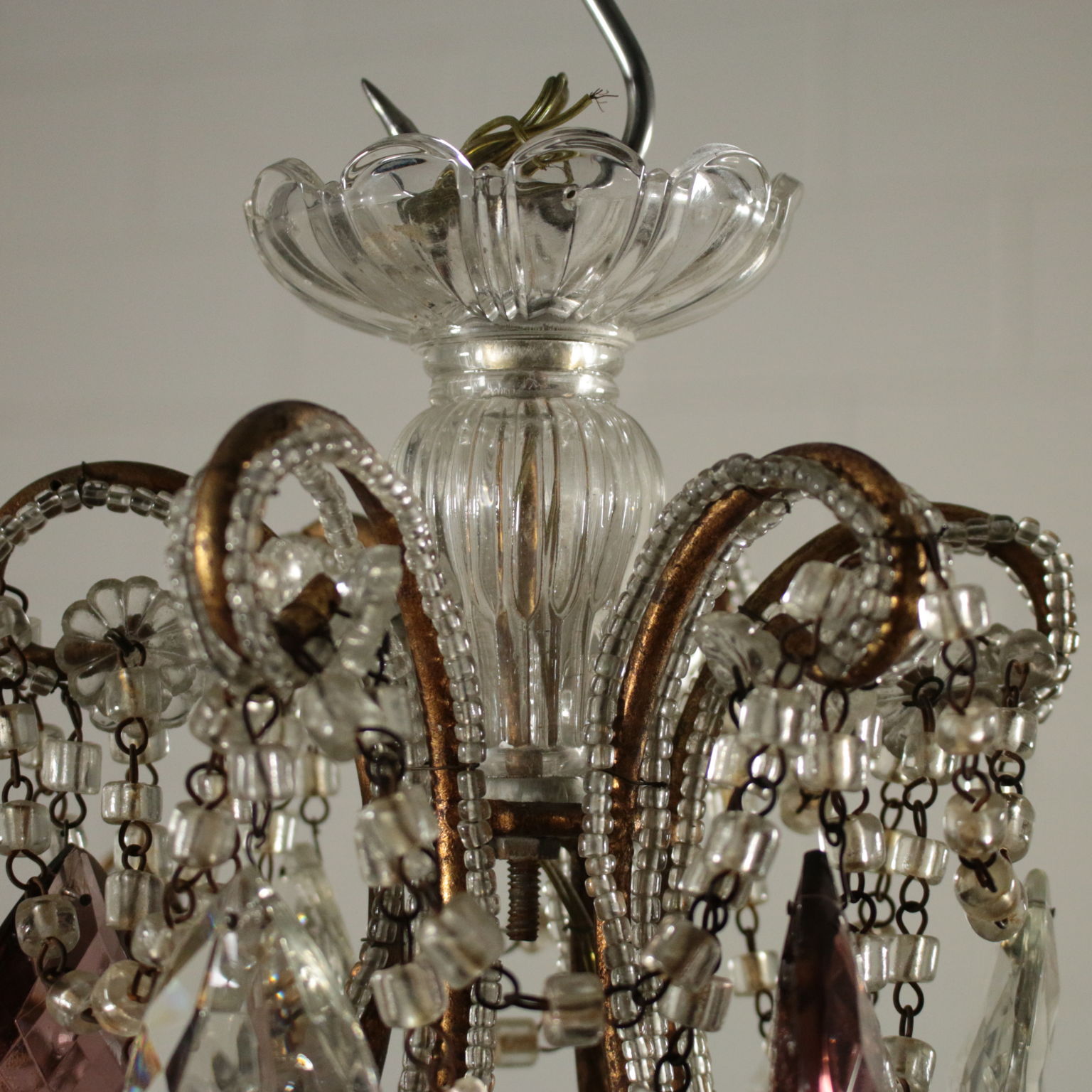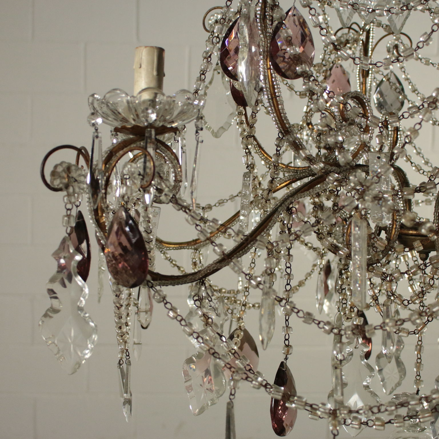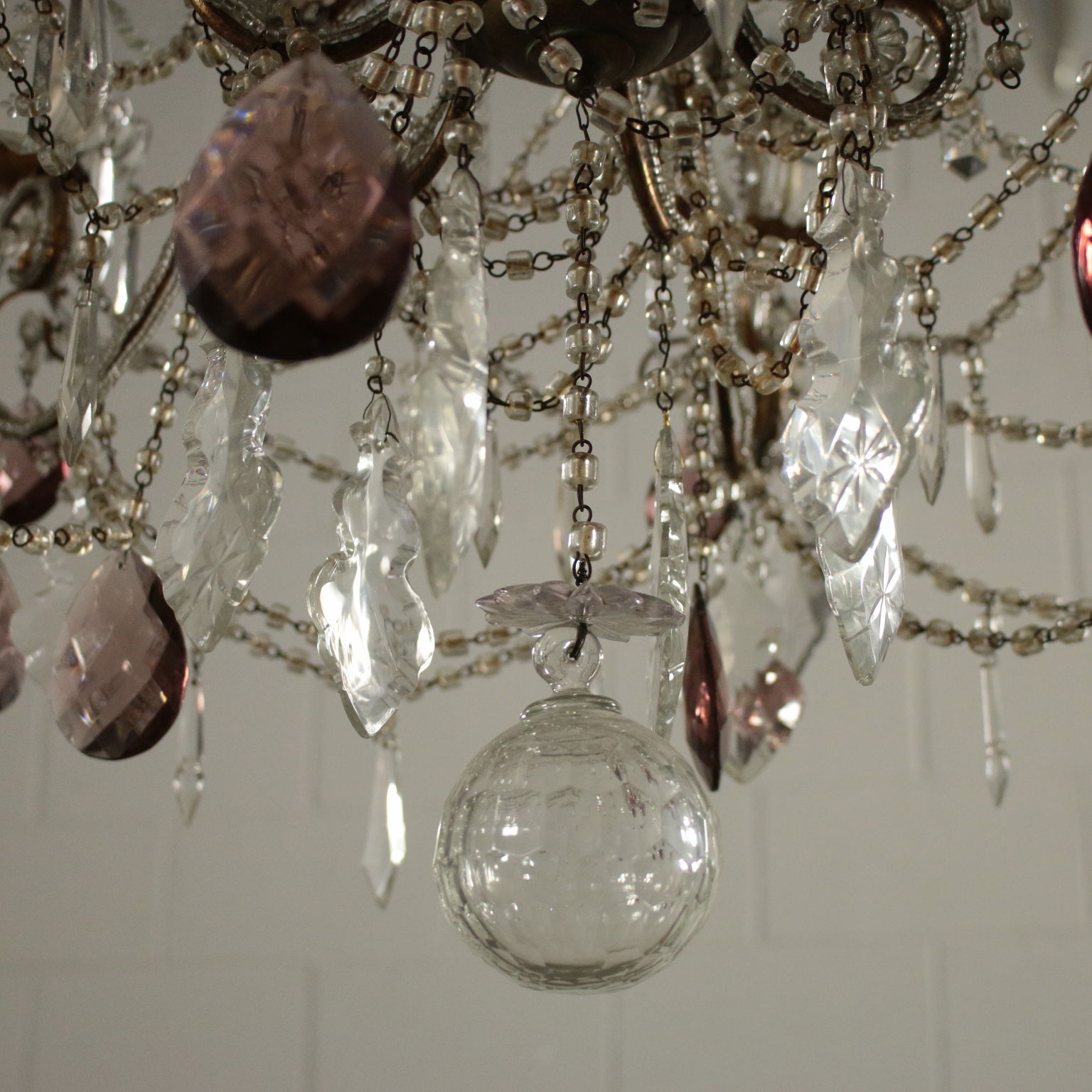 Kronleuchter, sechs arme mit schleifen und anhängern aus glas. Hat einige anhänger gefärbt.