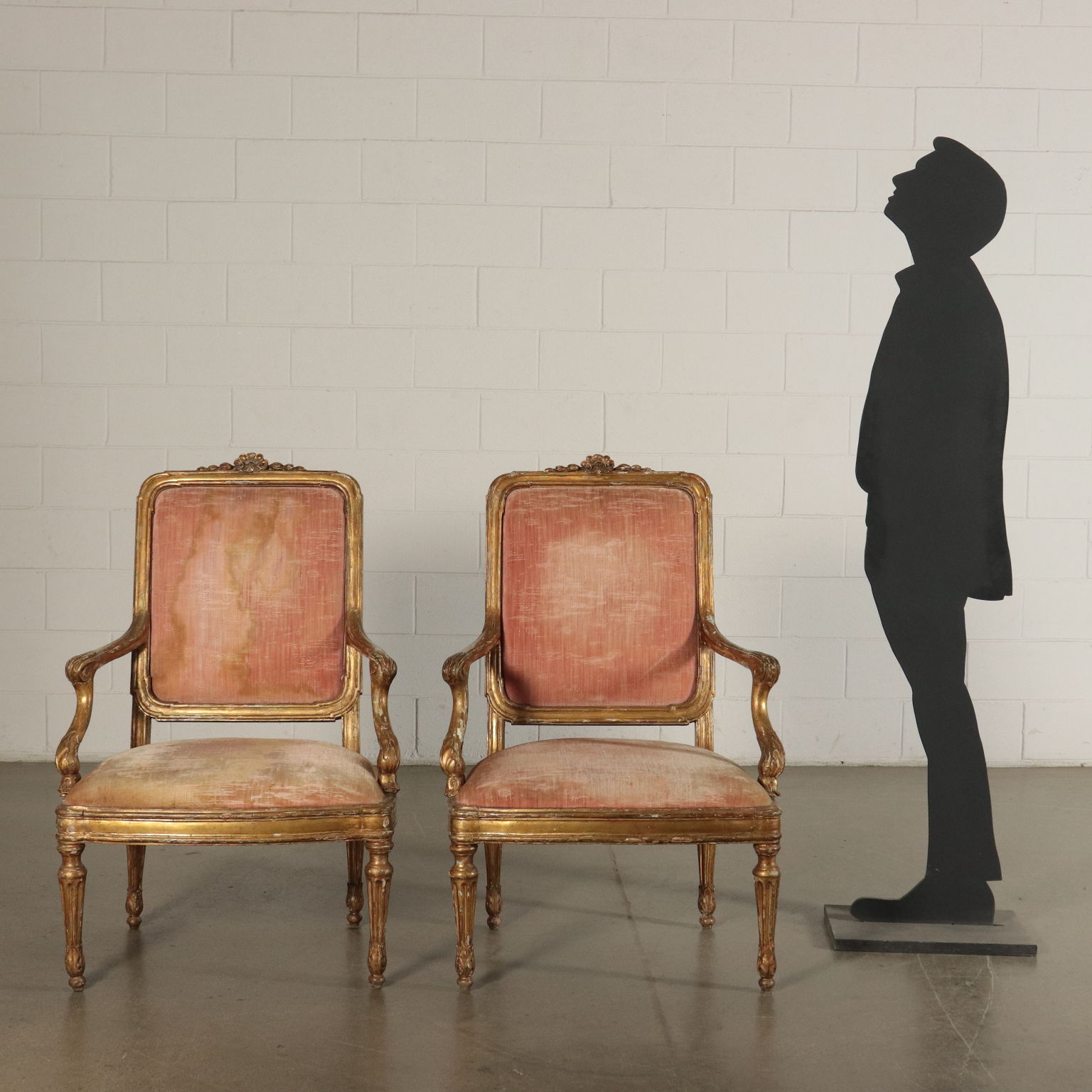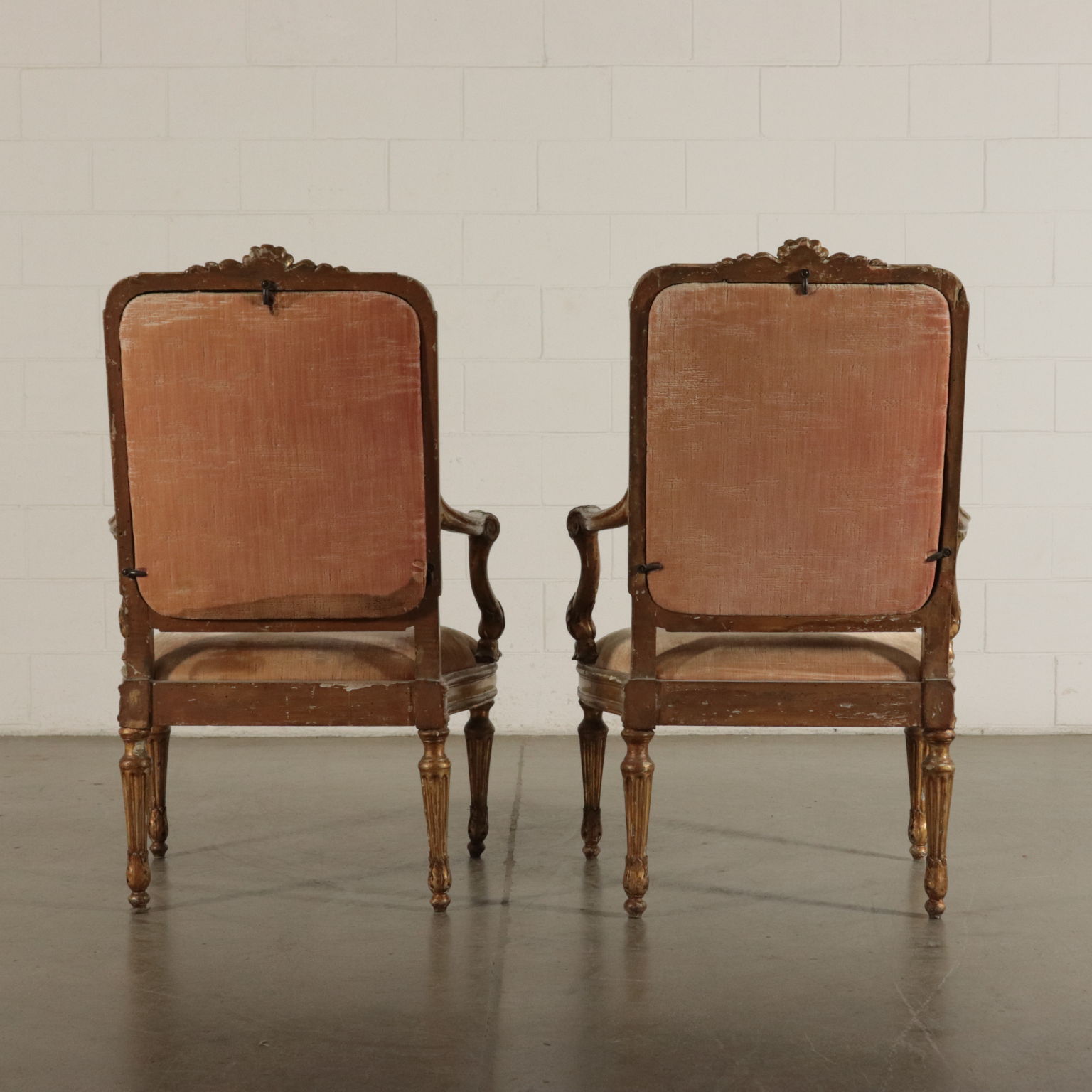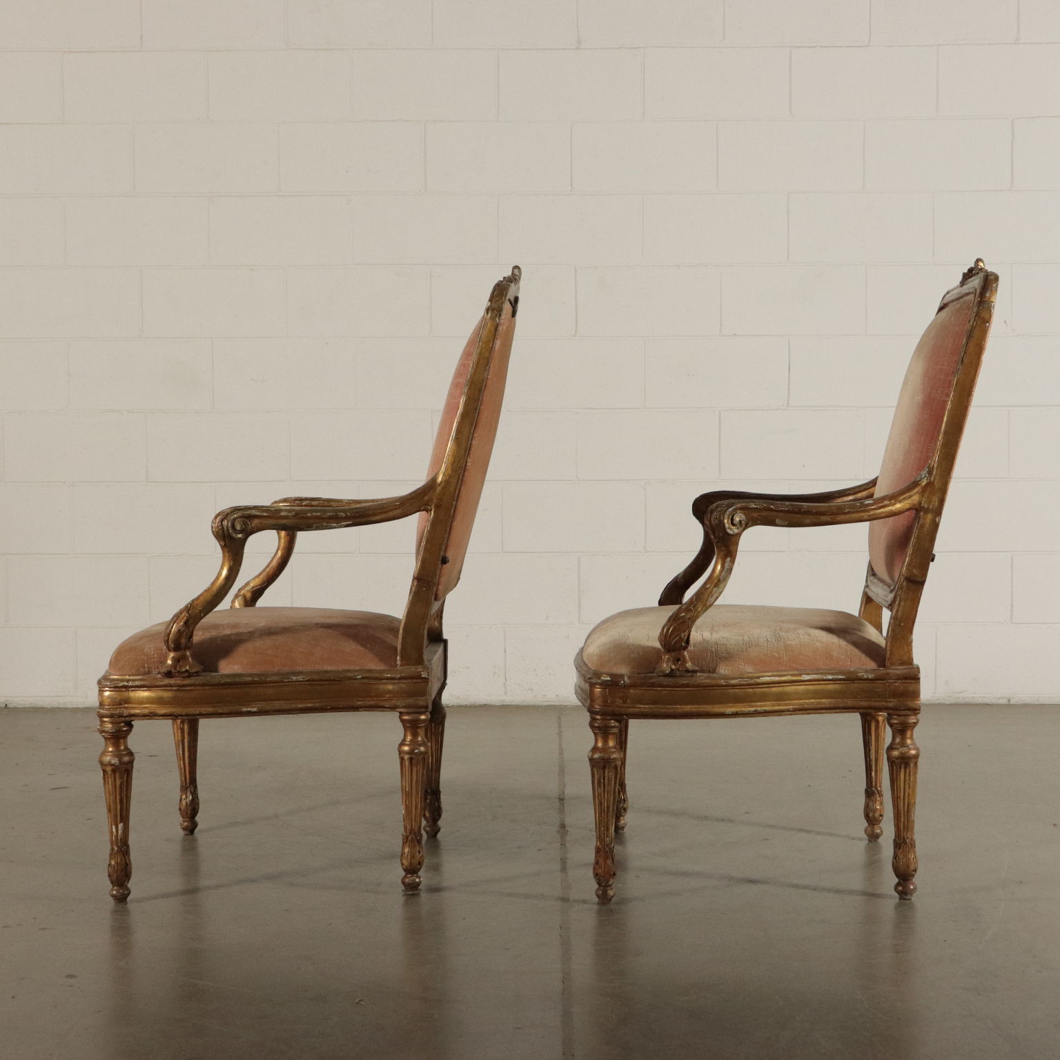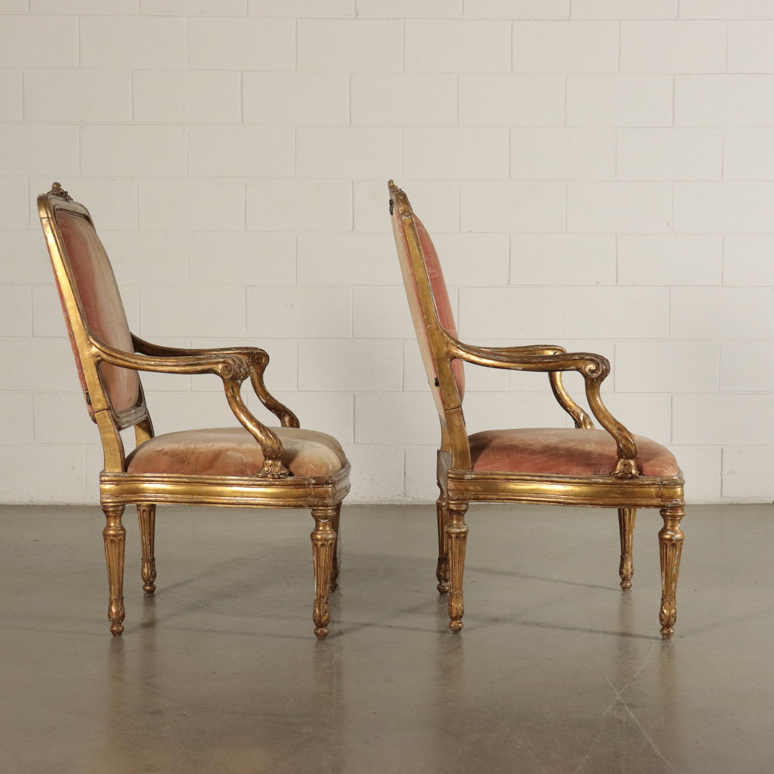 Elegantes paar sessel Louis XVI geraden von den beinen troncoconiche gerippt. Verfügen über armlehnen mit tag bewegt. Armlehnen und bewältigung geschnitzt. Sitz und rückenlehne gepolstert.