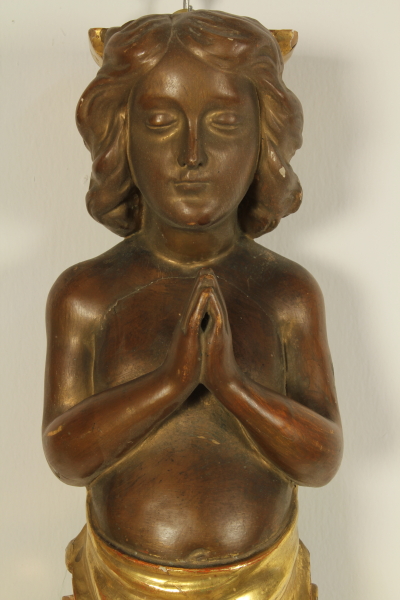 Paar Karyatiden in Lindenholz geschnitzten Pilastern mit Büsten von Engel beten und Kandelaber Absacken, goldene Frucht über die Oberfläche in Blattgold und polierte Teile, Bronze zu imitieren.