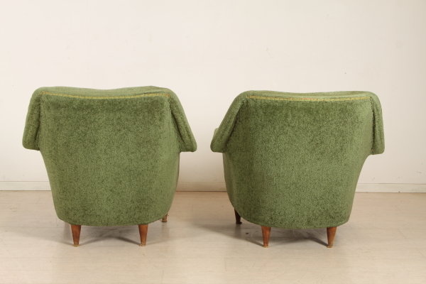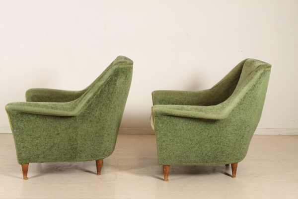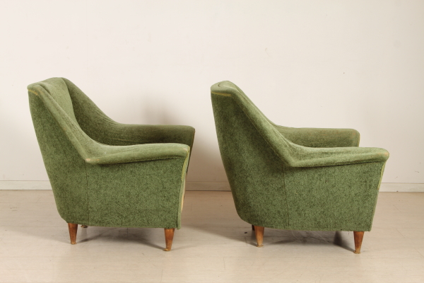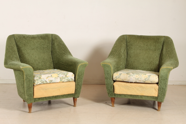 Zwei Sessel aus Schaumstoff gepolstert und mit Stoff bespannt. Füße aus Holz.