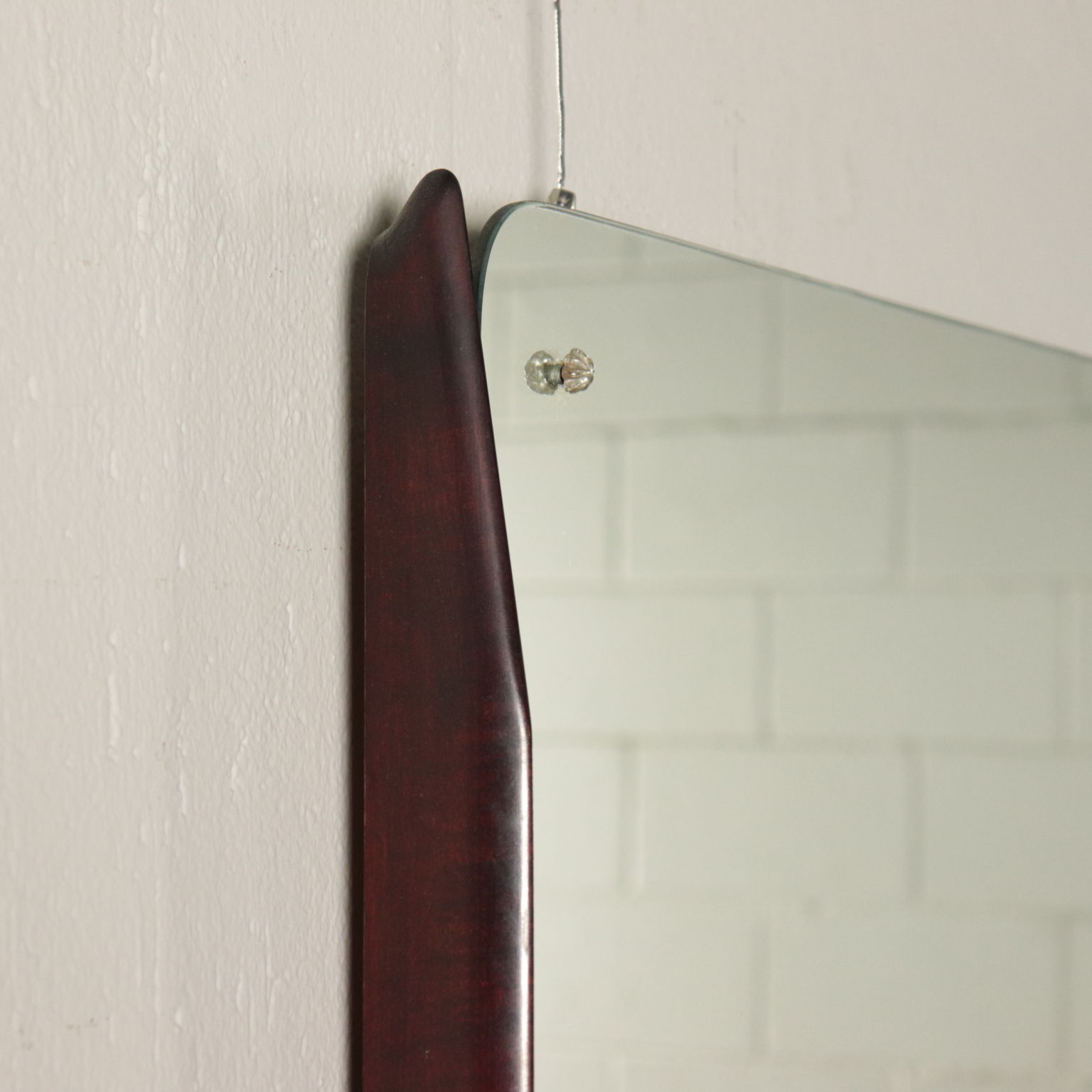 Specchio a parete, montato su telaio in legno, con cornice sui due lati in mogano, vetro specchiato.