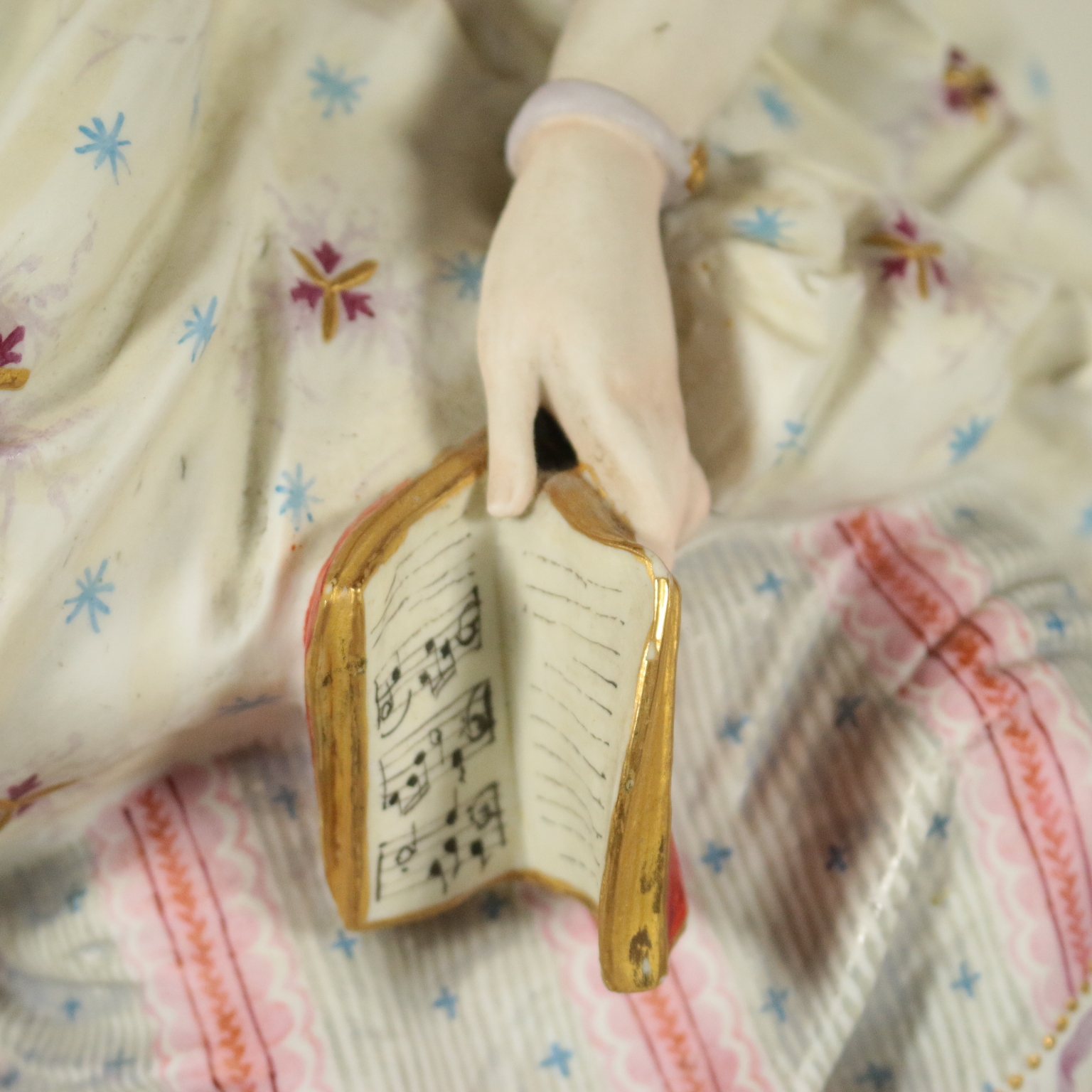 Große, polychrom verzierte Keksskulptur einer jungen Frau mit einem Kleid aus dem 18. Jahrhundert und einer Partitur.