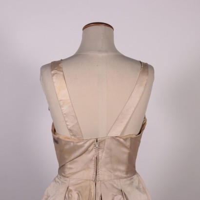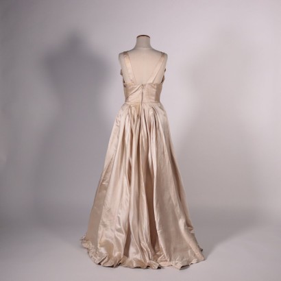 Abendkleid aus Mailand in den 1950er Jahren. Es ist ein Stück Haute Couture, das im Detail studiert wurde, von der Drapierung des elfenbeinfarbenen Satins bis zum von Hand mit schwarzen Perlen bestickten rubinroten Samt. Im Laufe der Jahre hat sich der Stoff verschlechtert (Flecken und kleine Risse), aber er kann "restauriert" oder zur Sammlung aufbewahrt werden. Es ist jedoch ein einzigartiges und wirklich wundervolles Kleid. (Länge 158 cm, Taille 67 cm)