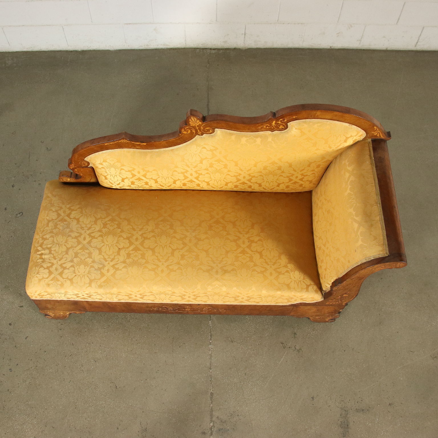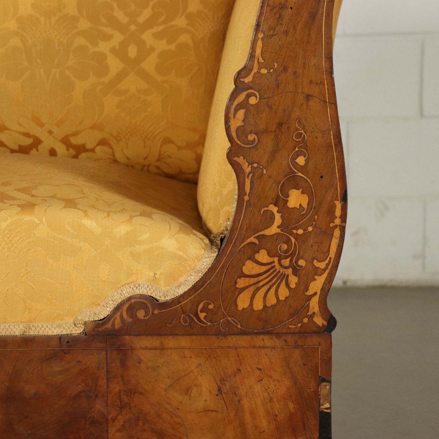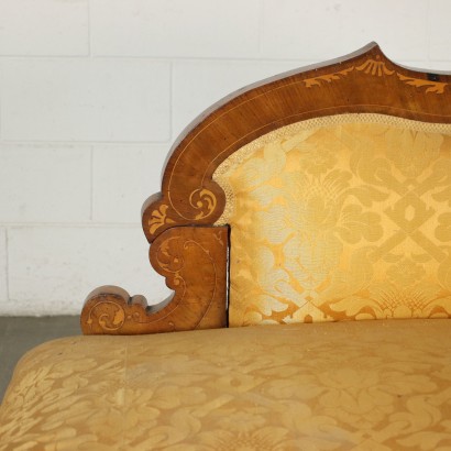 Sofa, Charles X Periode, in Nussbaum eingelegt mit Ahorn; geformte Rückenlehne. Seite an Boot mit gekräuselten Füßen, die gesamte Oberfläche ist mit phytomorphen Motiven eingelegt