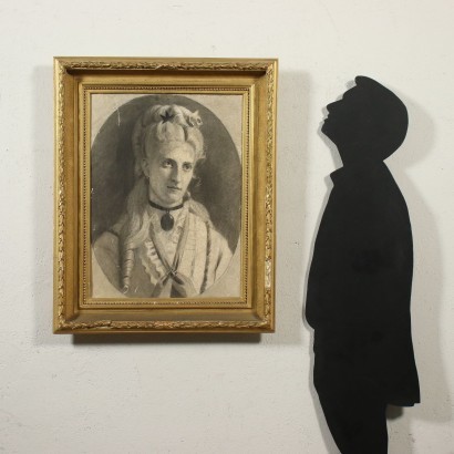 Großer vergoldeter Rahmen im Stil des späten Empire mit einem von Bändern gehaltenen Blätterkranz. Im Rahmen befindet sich ein Kohleporträt einer Dame.