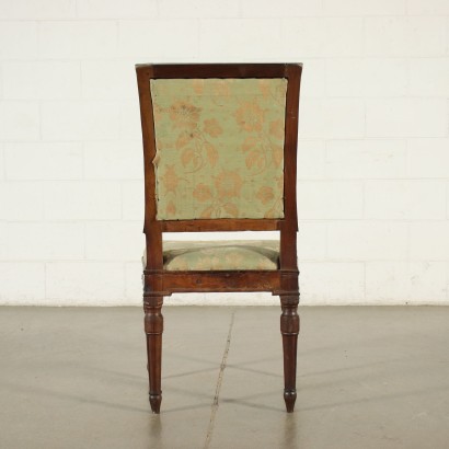 Gruppe von 4 klassizistischen Stühlen aus Nussbaumholz, Parma, letztes Viertel des 18. Jahrhunderts. Rücken und Band mit Rosetten und Glockenblumen beschnitzt, Tropfelemente in den Verbindungspunkten zwischen Band und Beinen, letztere gerillte Kegelstümpfe, die in birnenförmigen Füßen enden. Gepolsterte Rückenlehne und Sitz mit Damaststoff bezogen.