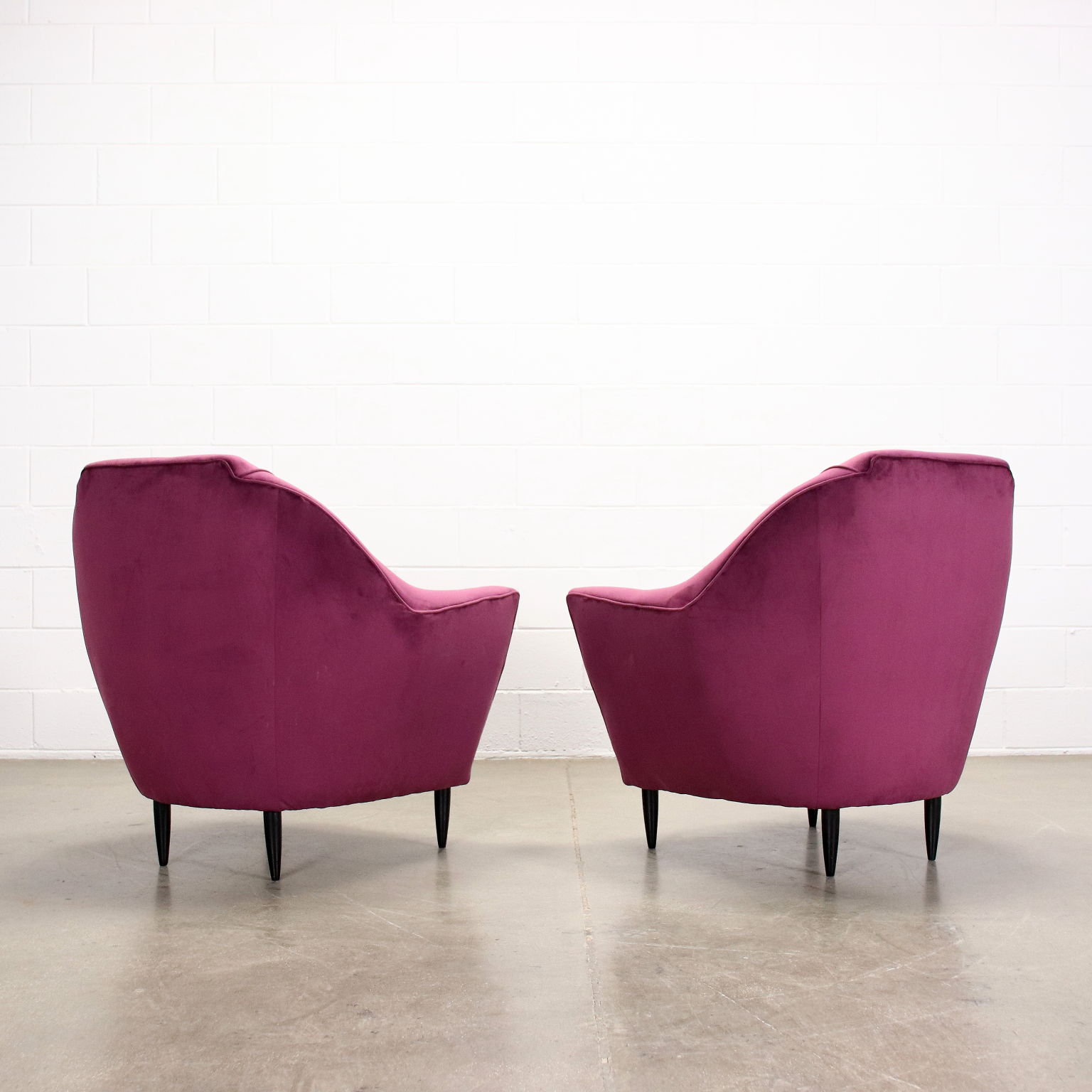 Paar Sessel im Stil von Ico Parisi, Feder- und Schaumstoffpolsterung, Samtpolsterung, ebenholzgebeizte Holzbeine.