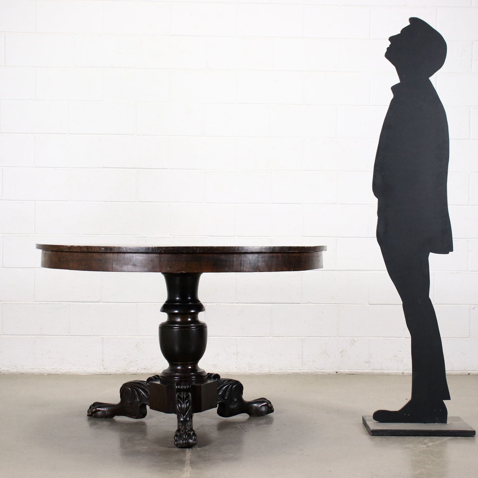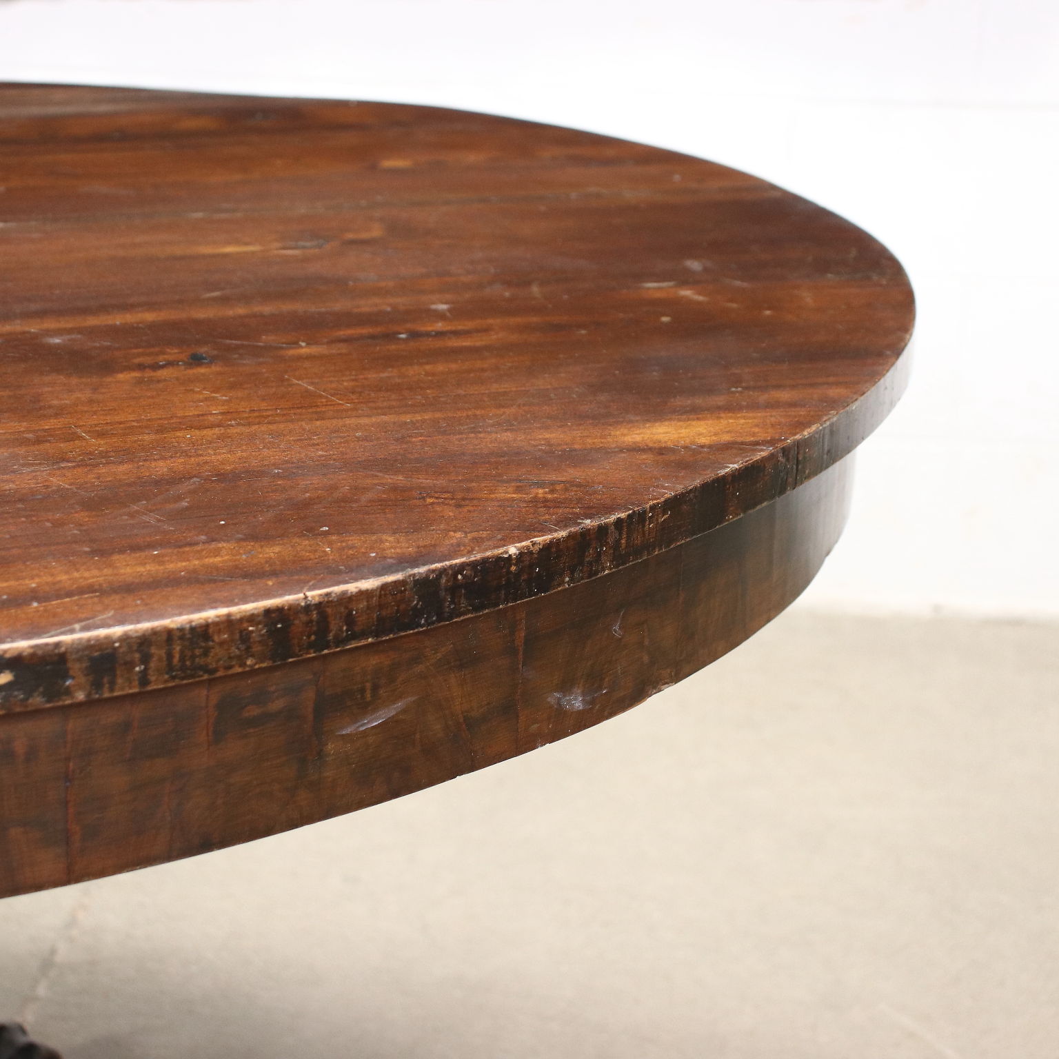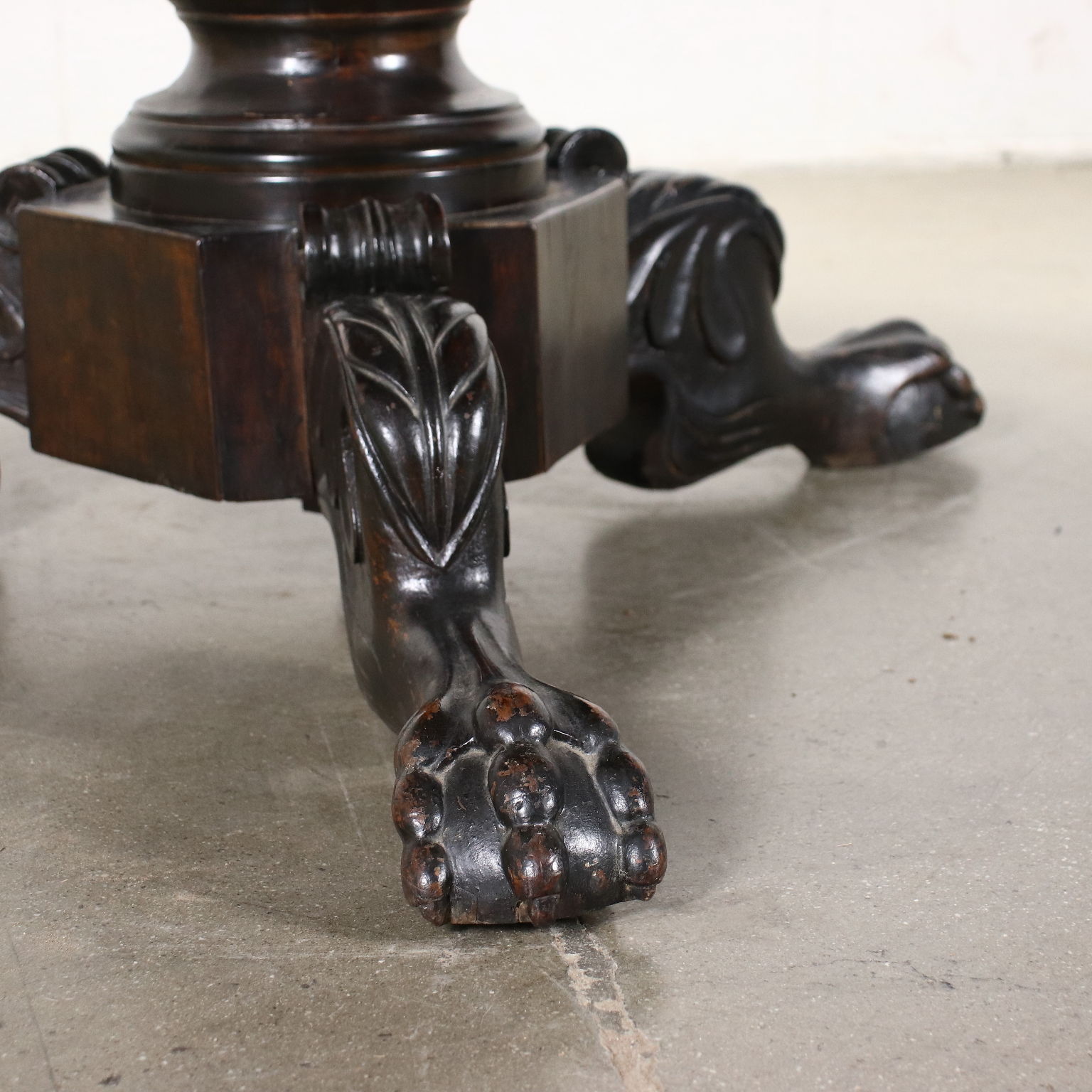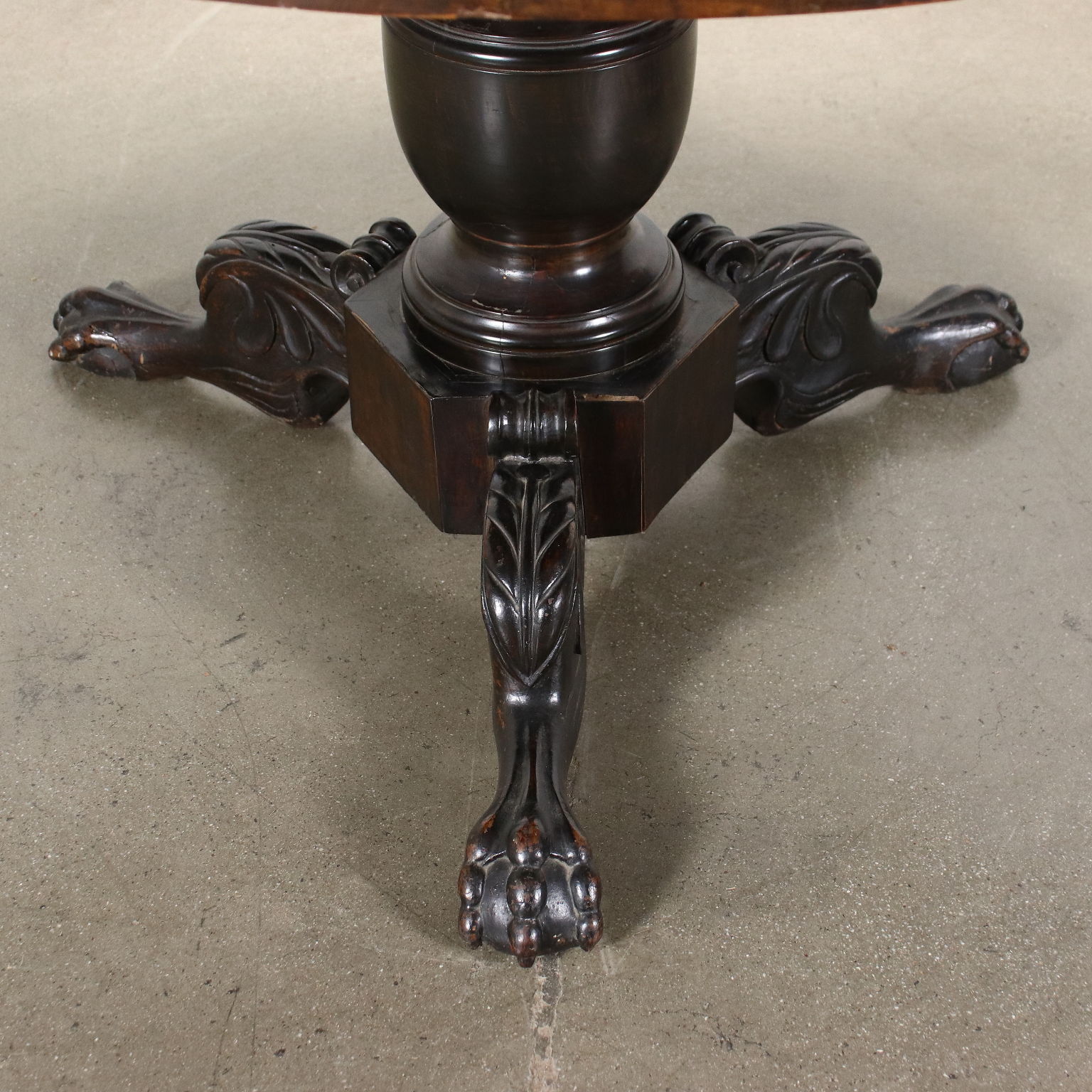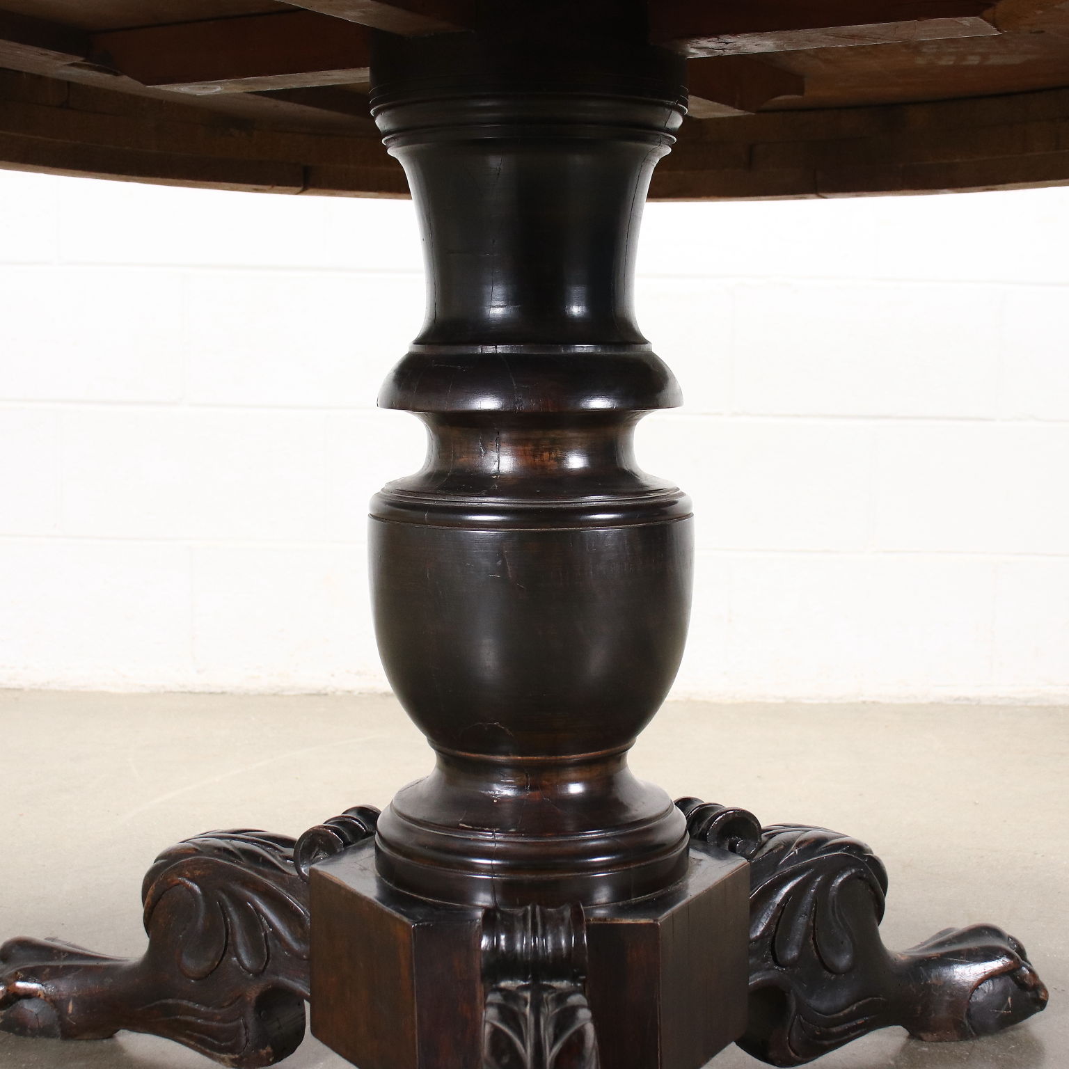 Tisch aus der Mitte des 19. Jahrhunderts, getragen von einem zentralen gedrechselten Baluster, der auf wellenförmig geschnitzten Beinen ruht und mit "Klauen- und Kugel"-Füßen endet. In Kirsche, Oberseite in Walnuss.