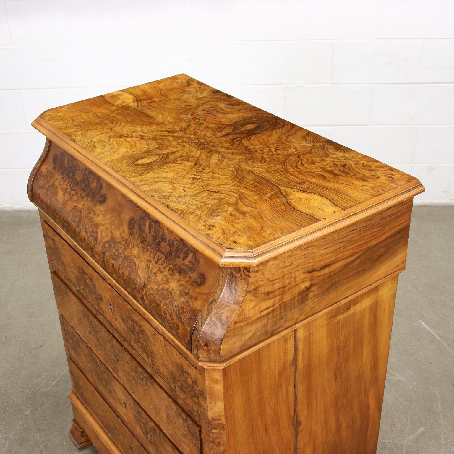 Französischer Schminktisch von Füßen getragen, auf der Vorderseite hat er vier Schubladen, die Klappplatte verbirgt den Schminktisch mit Spiegel und Marmorplatte. Nussbaum furniert, die Innenausstattung in Eiche.