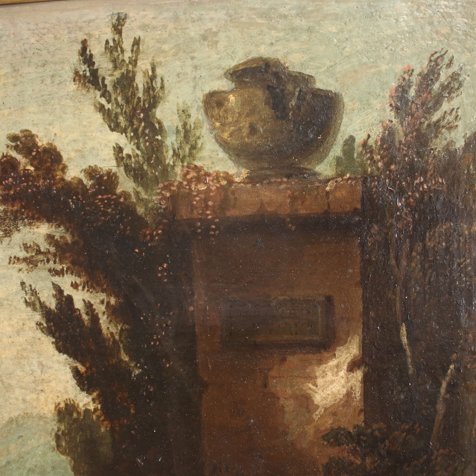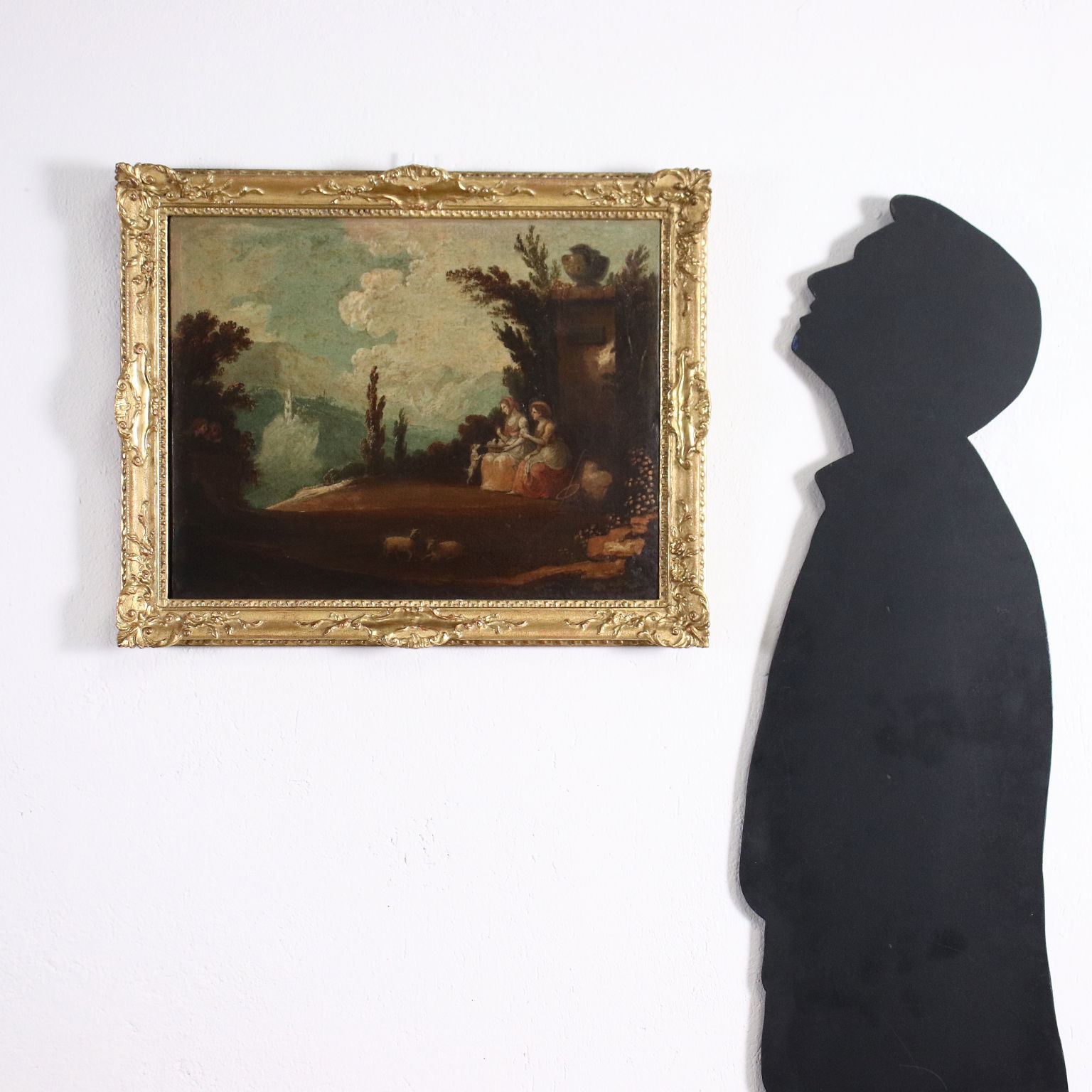 Öl auf Leinwand auf Sperrholz aufgetragen. In einer hügeligen Landschaft schauen zwei Hirteninnen, die auf einigen Bauernhöfen sitzen, auf die Tauben, die sie auf dem Schoß haben, während der neugierige kleine Hund zusieht; links, im Dickicht der Bäume versteckt, spionieren zwei Jungen die Szenerie aus. In die ländliche Szenerie wird das neoklassizistische Architekturelement des hohen Steins mit einer Amphore, unter der die beiden Mädchen sitzen, eingefügt. Das Gemälde wird in einem vergoldeten Rahmen aus der Mitte des 19. Jahrhunderts präsentiert.