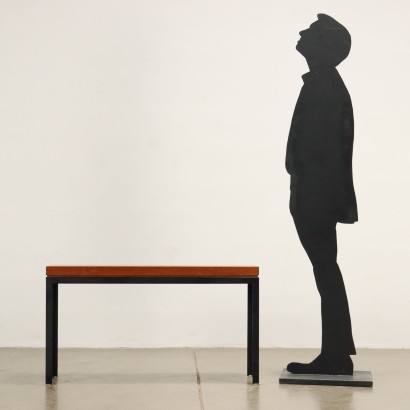 Bank mit Gestell aus emailliertem Metall, Sitz aus furniertem Nussbaumholz.