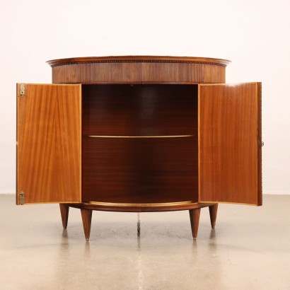 Schrank mit Flügeltüren, Platte aus furniertem Holz mit konzentrischen Segmenten in Nussbaum, Schubladenband unter der "Grissinata"-Platte, gebogene Türen in Nussbaum-Wurzel furniert, mit verzierten Rahmen, gedrechselte Beine.