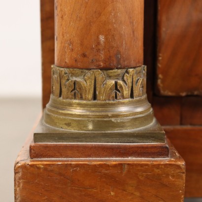 Empire-Möbel auf Füßen, die hinteren sockelartig und die vorderen gedreht, auf der Vorderseite zwei Schubladen, eingerahmt von einem Säulenpaar mit Sockel und Kapitell aus vergoldeter Bronze (von denen eine fehlt); Rolltür mit Mechanismus, der das Öffnen durch Herausziehen der Tischplatte ermöglicht und den Schrank mit Fächern und Schubladen verbirgt. Im oberen Teil befindet sich eine Rückwand mit einer zentralen Tür und zwei seitlichen Schubladen. Die Innenausstattung besteht aus Nussbaumholz, die Innenausstattung aus Tanne.