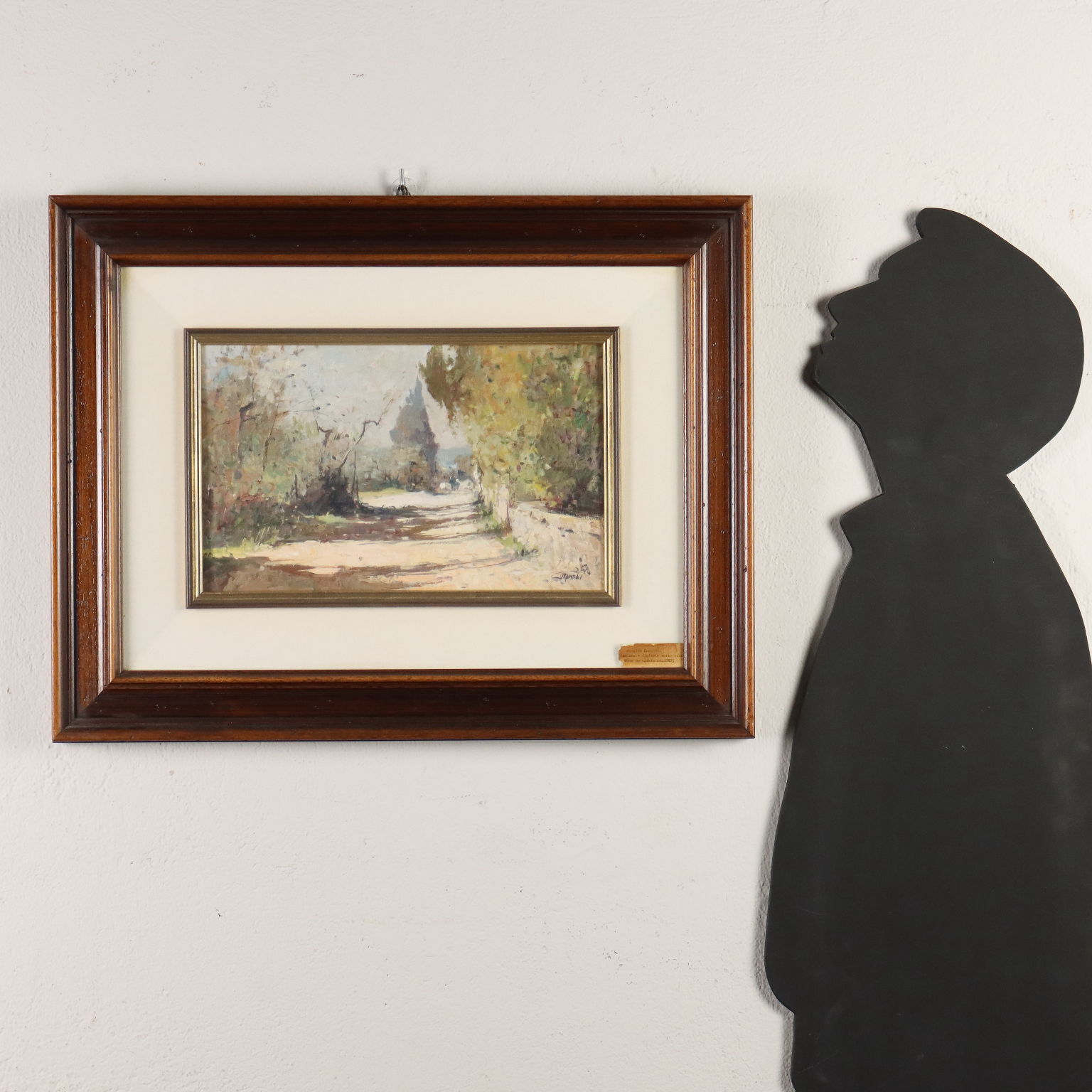 Öl auf Leinwand. Rechts unten signiert. Auf der Rückseite befindet sich ein Etikett der Bongiovanni Art Gallery (seit vielen Jahren Ort seiner ständigen Ausstellung) mit dem Titel und dem Vermerk der Ausstellung in der Galerie Manzoni in Mailand im Jahr 1978; Präsentieren Sie auch Briefmarken derselben Galerie. Curandai zeichnete sich hauptsächlich als Landschaftsarchitekt aus, ein Liebhaber der magischen Atmosphäre des Himmels, der Hügel, der Haustiere, der toskanischen Bauernhäuser, die uns in eine alte Zeit zurückversetzen, der ländlichen und der Teilpacht, unsere bis vor einigen Jahrzehnten, was zwangsläufig verschwindet. Hier ist ein Blick auf die Landschaft, die von einem Feldweg durchquert wird, auf dem zwei Figuren, der Vater und der Sohn des Titels, in der Ferne zu sehen sind. Im Rahmen.