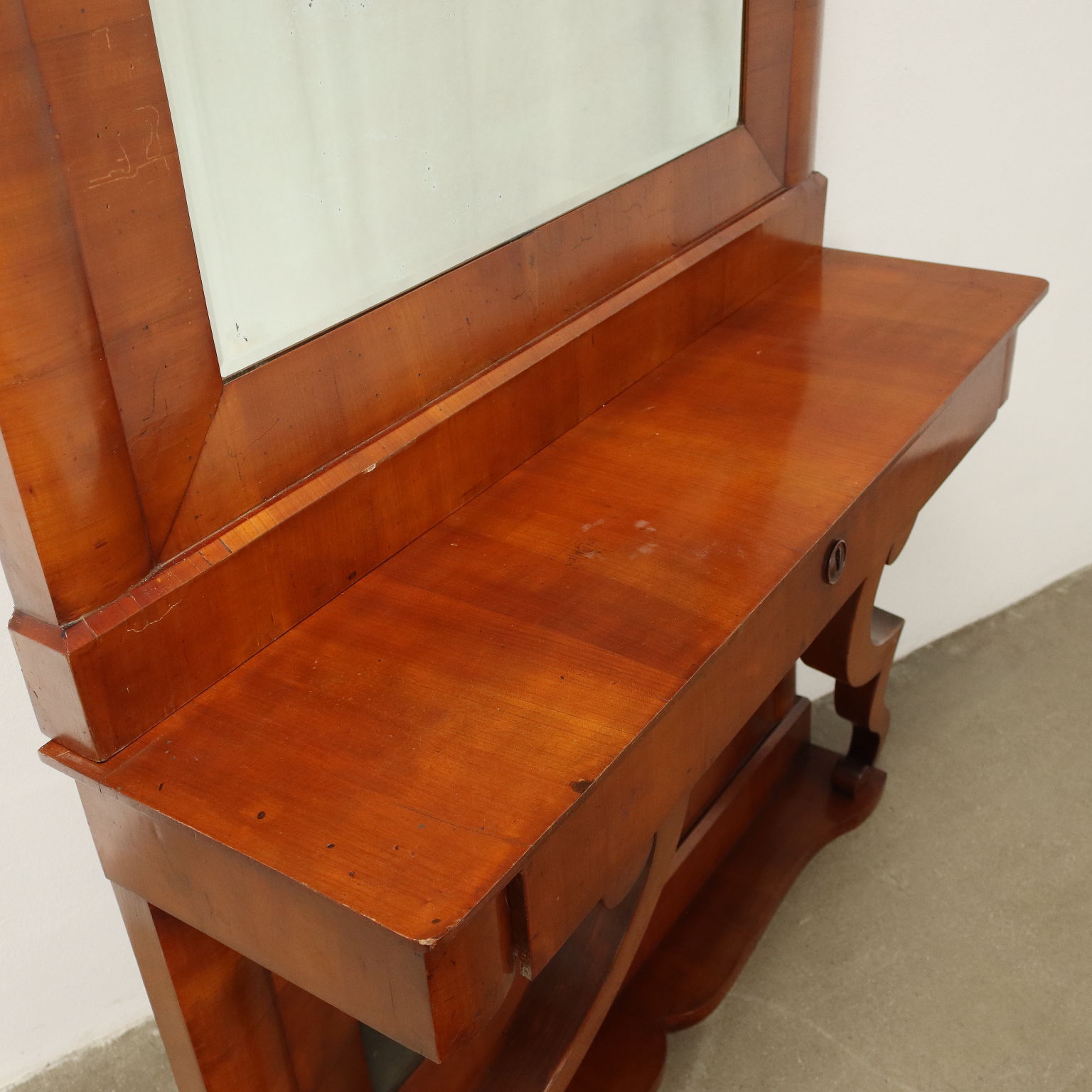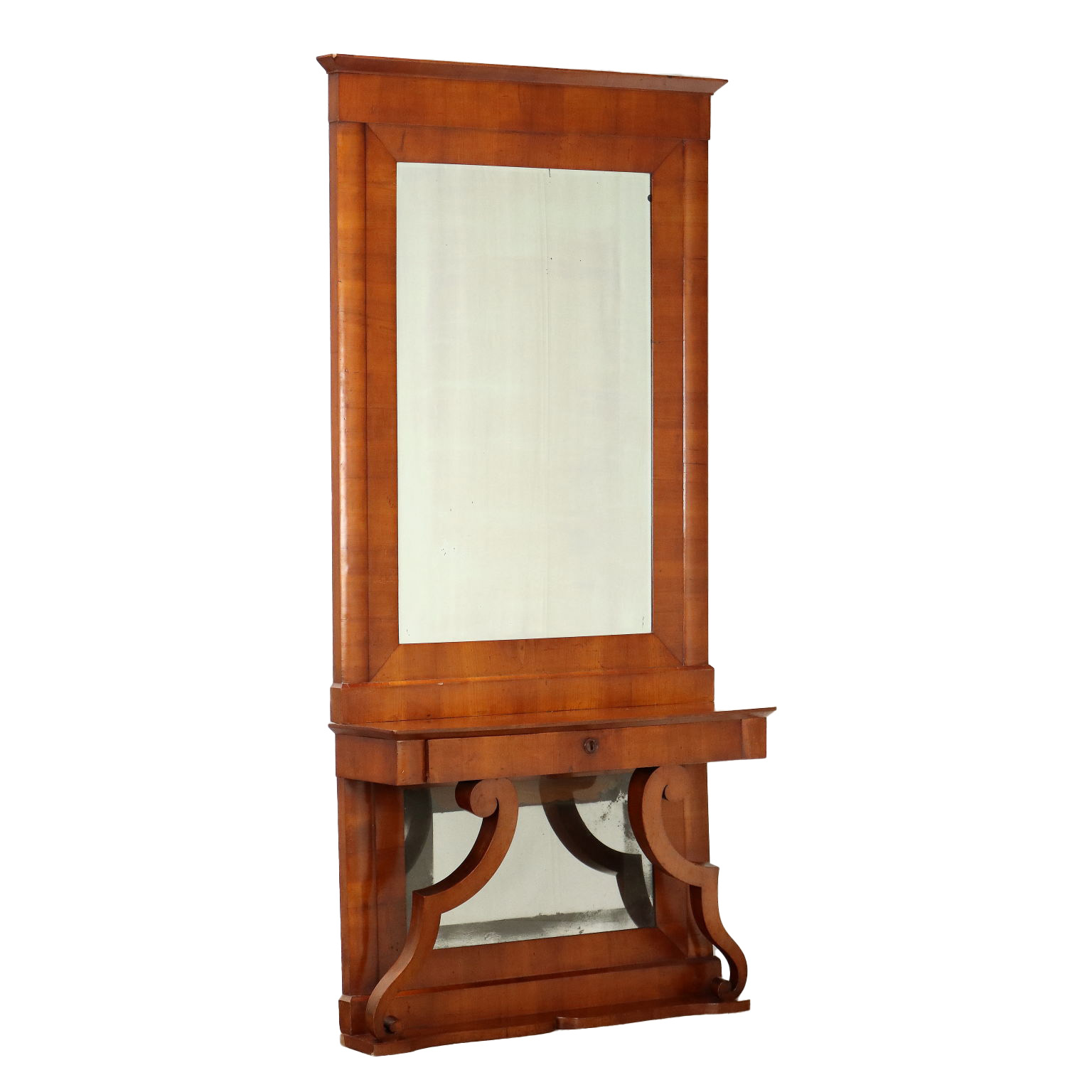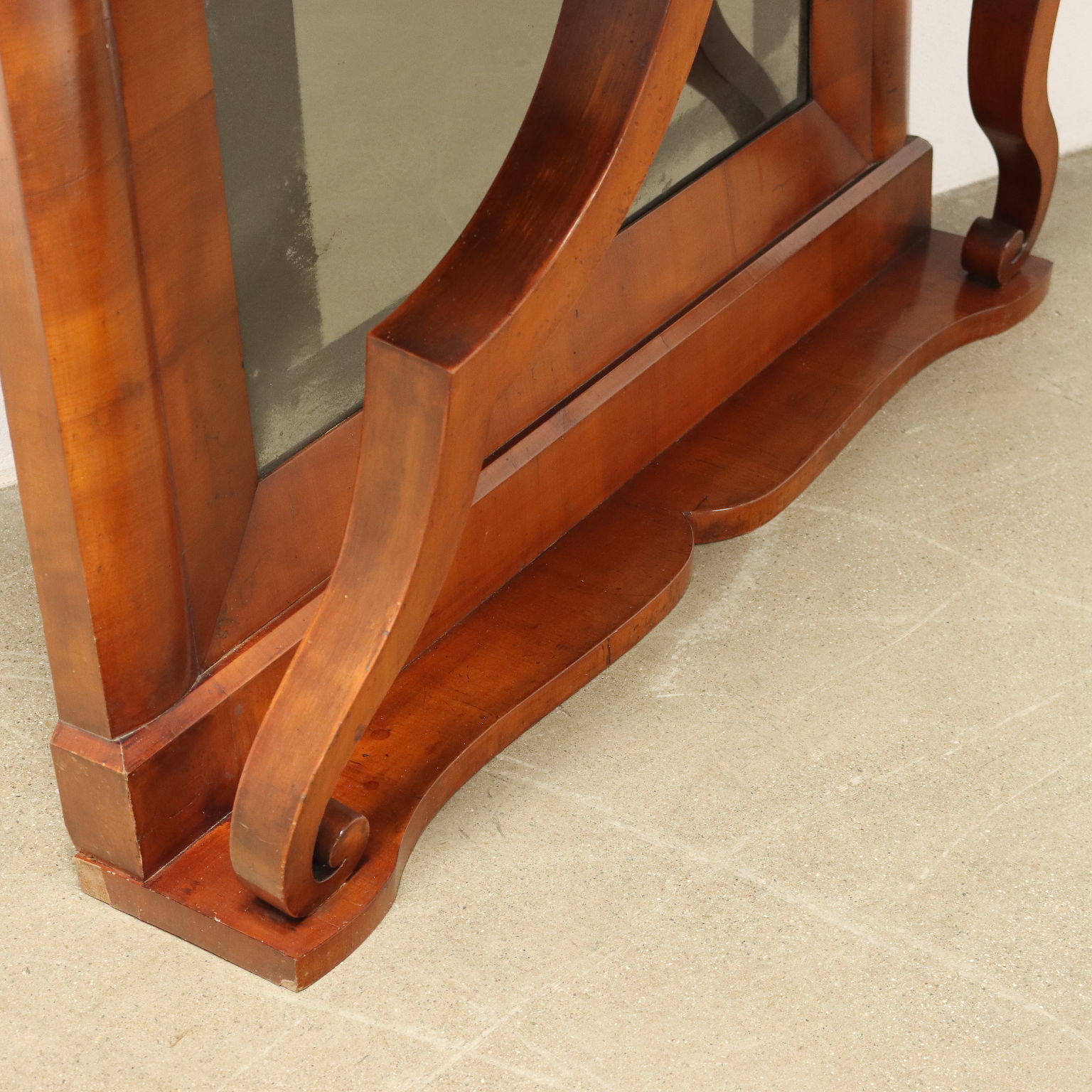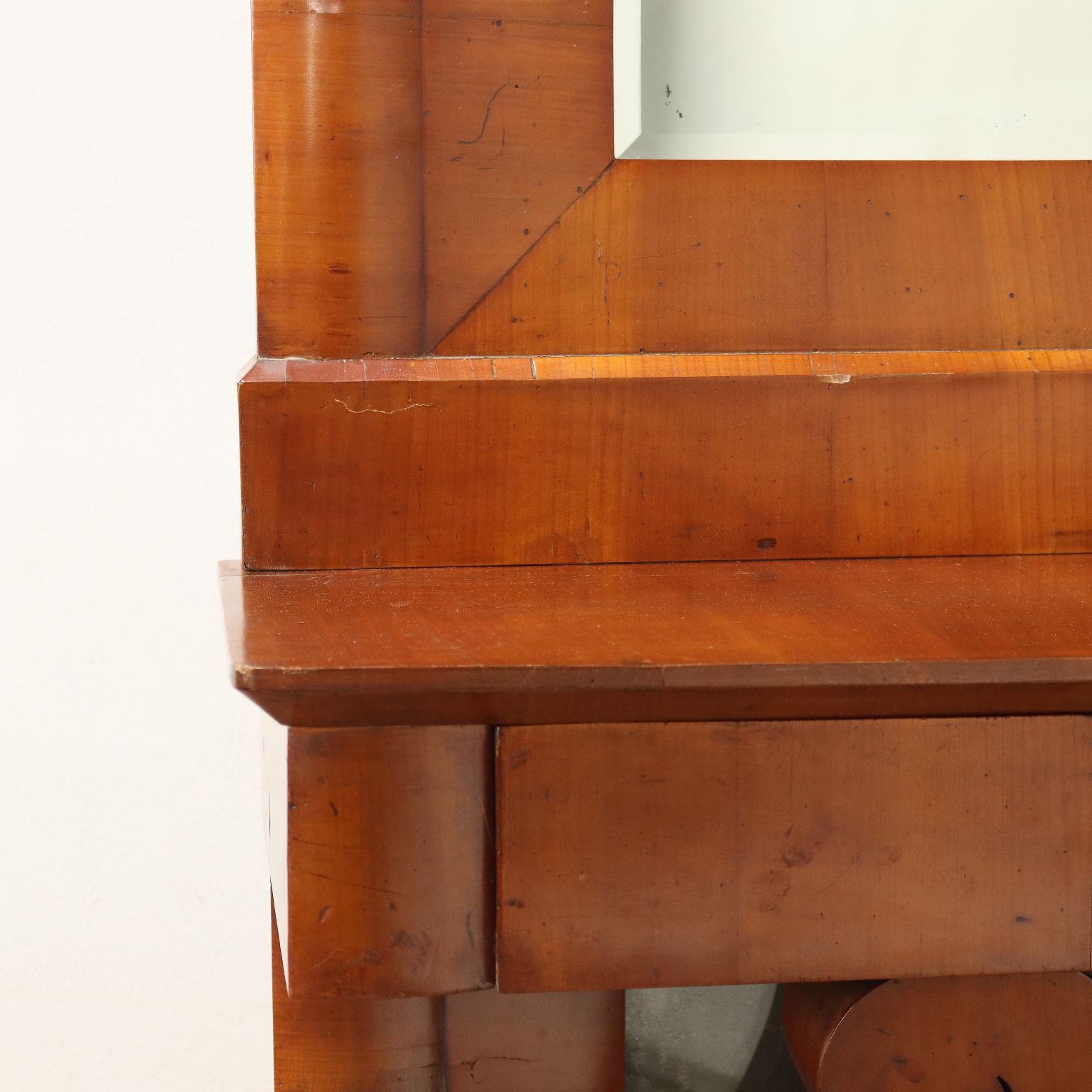 Konsole mit Charles X-Spiegel aus kirschfurnierter Tanne, Italien, zweites Viertel des 19. Jahrhunderts. Ausgestattet mit Bodenspiegeln, von denen einer Quecksilber ist. Konsole mit Schublade im Band, geschwungene Pfosten, die mit der geformten Basis verbunden sind.