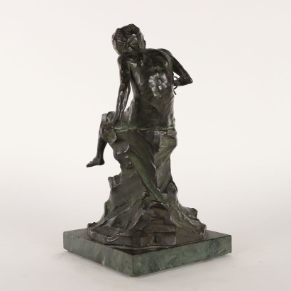 Bronzeskulptur auf grünem Marmor, die einen kleinen Fischer darstellt. Auf der Sockel ist die Signatur des Autors.