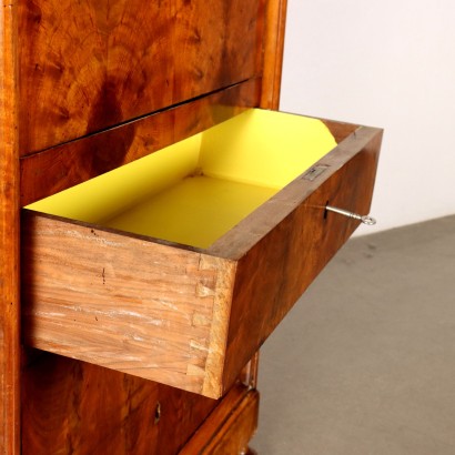 Lombardischer Sekretär mit Nussbaumstiel furniert. Klappe mit Korpus verziert mit in Ahorn eingelegten Sternen und Fäden an der Klappe und an den Schubladen; bewegliches zentrales Fach mit Geheimnissen. Front mit vier Schubladen, von denen eine kleiner ist, geformt nach dem Halsmotiv des oberen Bandes. Nussbaum innen. Glasfüße.