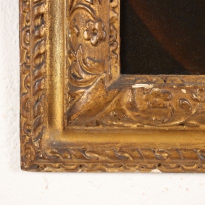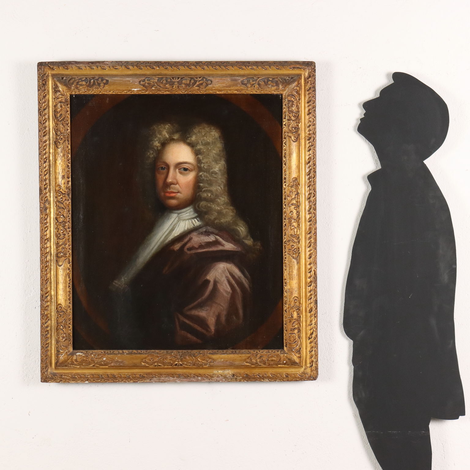 Öl auf Leinwand. Nordeuropäische Schule des achtzehnten Jahrhunderts. Unten rechts befindet sich eine Spur eines Monogramms. Vielleicht ist der dargestellte Herr ein Richter, denn die weiße Lockenperücke kombiniert mit dem schwarzen Umhang und dem weißen Jabot. Der Gesichtsausdruck des Mannes ist streng und hochmütig. Das Porträt ist in ein gemaltes Oval eingeschrieben, das den vorherigen Rahmen anzeigt. Restauriert und unterfüttert, präsentiert es sich in einem umgebauten und neu vergoldeten Rahmen aus dem späten 19. Jahrhundert.