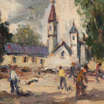 Öl auf Hartfaser. Signatur und Ort unten rechts. Auf der Rückseite befindet sich eine weitere Signatur mit Titel und Datum der Arbeit. Giovanni Balansino, gebürtiger Piemonteser, aber durch Adoption Lombarde, entschied sich dafür, seine Liebe zu beiden Ländern mit seiner Malerei aus breiten und nervösen Pinselstrichen darzustellen, und widmete ihnen einen großen Teil seiner Produktion. In diesem Fall bietet es stattdessen einen Blick auf Brügge, eine bekannte flämische Stadt. Die Arbeit wird in einem Rahmen präsentiert.