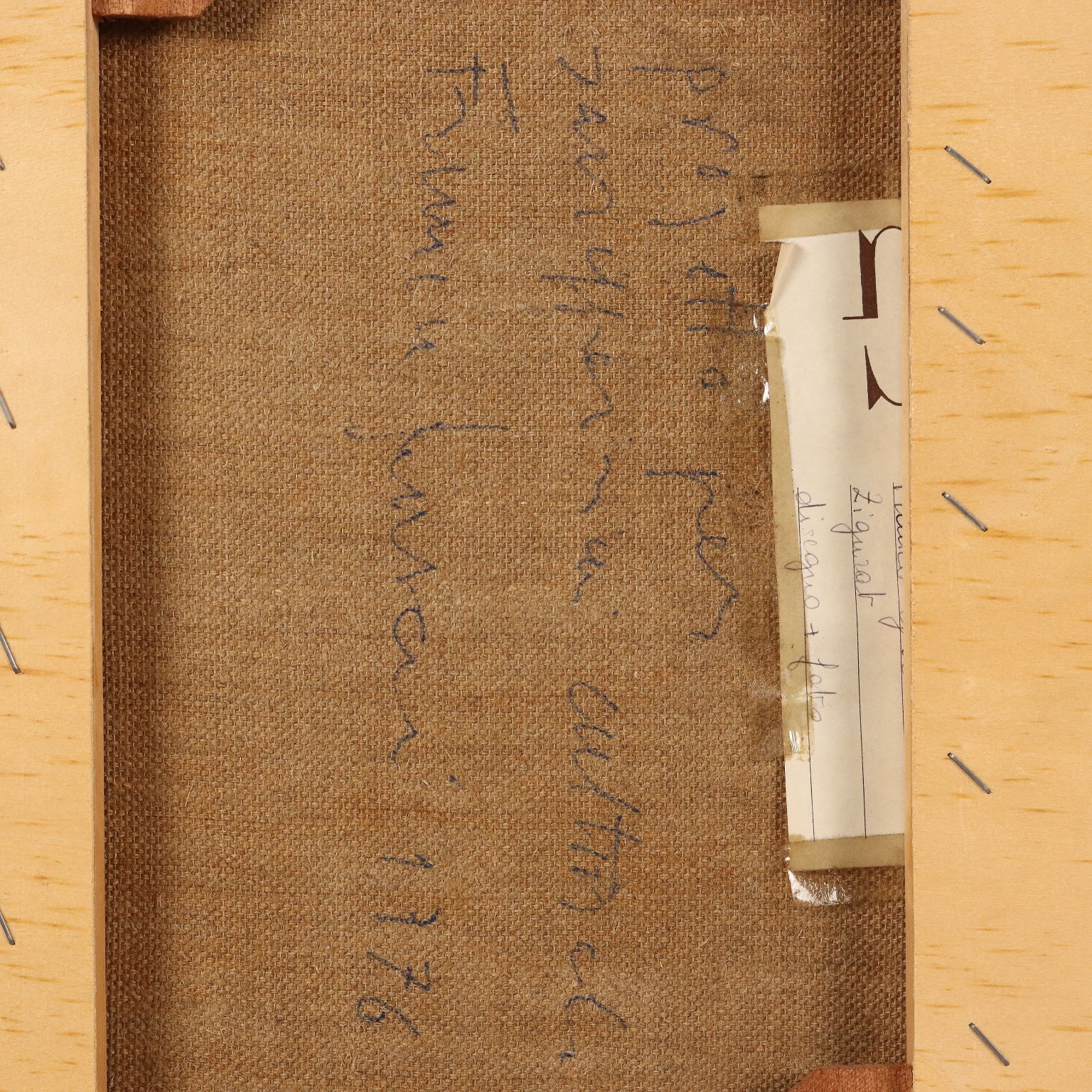Zusammenbau von zwei Elementen, mit Zeichnung und Foto. Auf der Rückseite auf beiden Teilen die eigenhändige Unterschrift und das Datum des Künstlers; außerdem gibt es ein Label der Galleria Studio g7 in Bologna. Ab den frühen 1970er Jahren begann der modenesische Künstler Franco Guerzoni mit einer persönlichen Forschung, die sich der Erforschung der Welt der Archäologie und des Gedächtnisses widmete; Guerzoni mag Erinnerungen im positivsten Sinne des Wortes: persönliche Erinnerungen und kollektive Erinnerungen, die ständig in seine Werke einfließen und sich so mit Schichtungen aus Materie und Gedanken verdichten, die durch die Zeit und den Geist im Bett des Flusses der Kunst sedimentiert werden . Was dabei herauskommt, ist eine Vielzahl von Geschichten, die der unermüdliche Künstler seit jeher gesammelt hat, angefangen bei den ersten Experimenten mit der Fotografie, über das Studium der Archäologie bis hin zu Künstlerbüchern und Arbeiten mit Gips. Das Werk wird in einem Rahmen präsentiert. Es stammt aus einer bedeutenden Privatsammlung in Mailand und wird mit einer Fotoauthentifizierung geliefert.