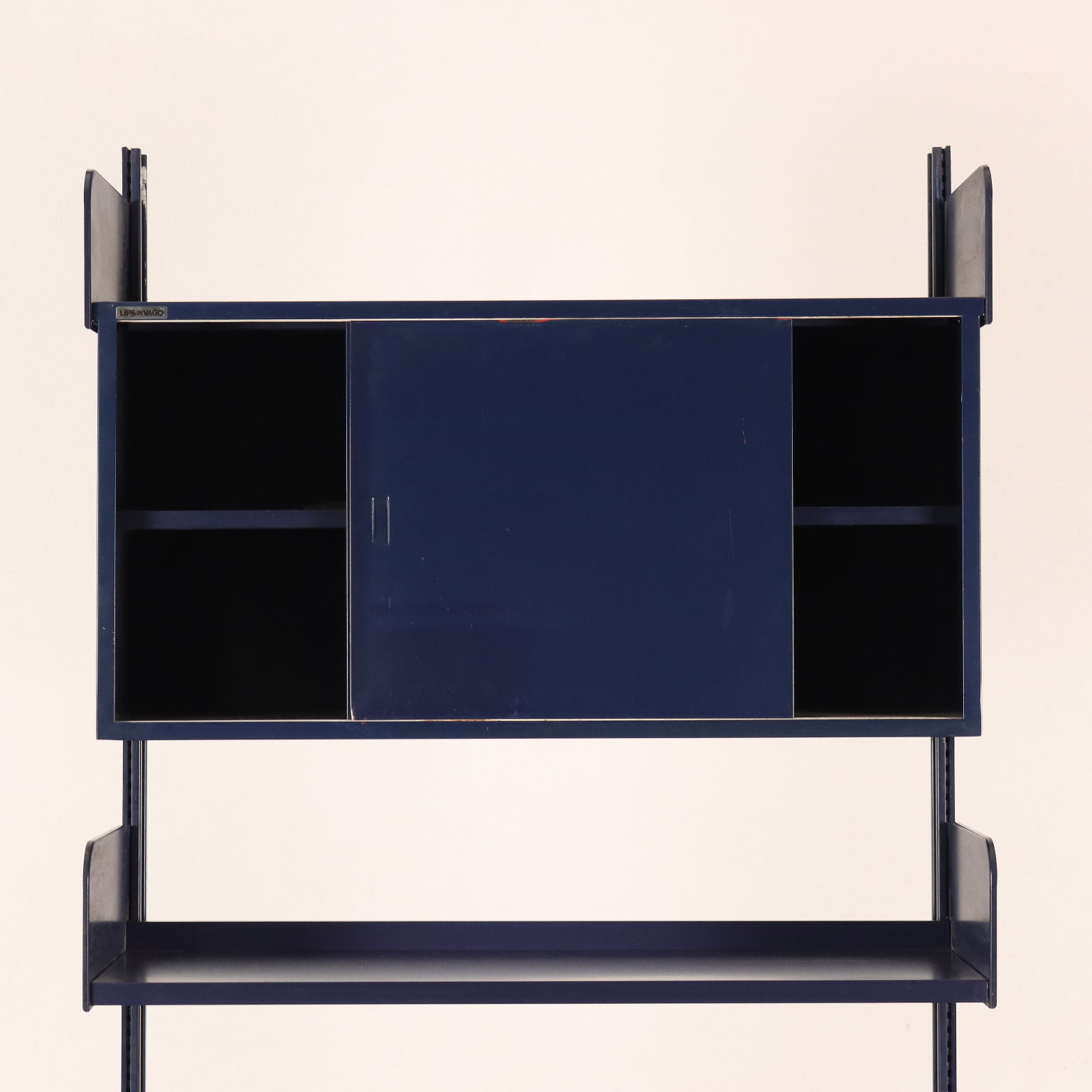 Bücherregal mit verstellbaren Regalen und Behälter mit Schiebetüren aus emailliertem Metall.