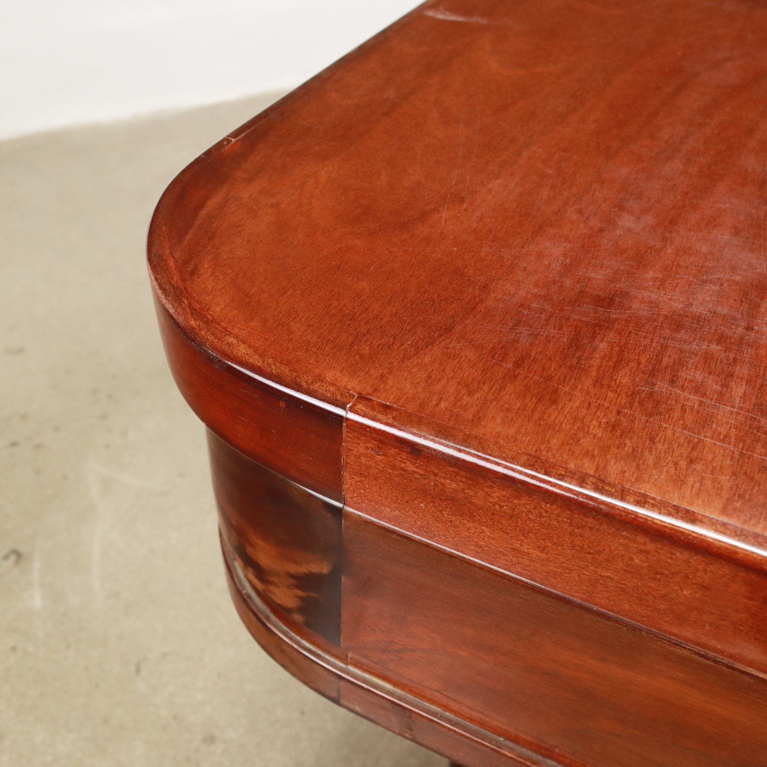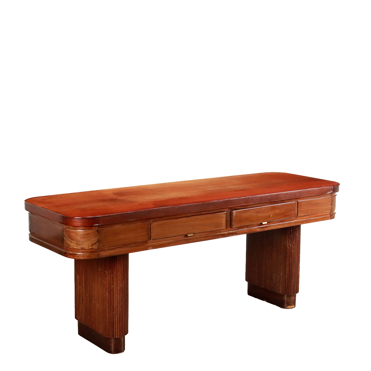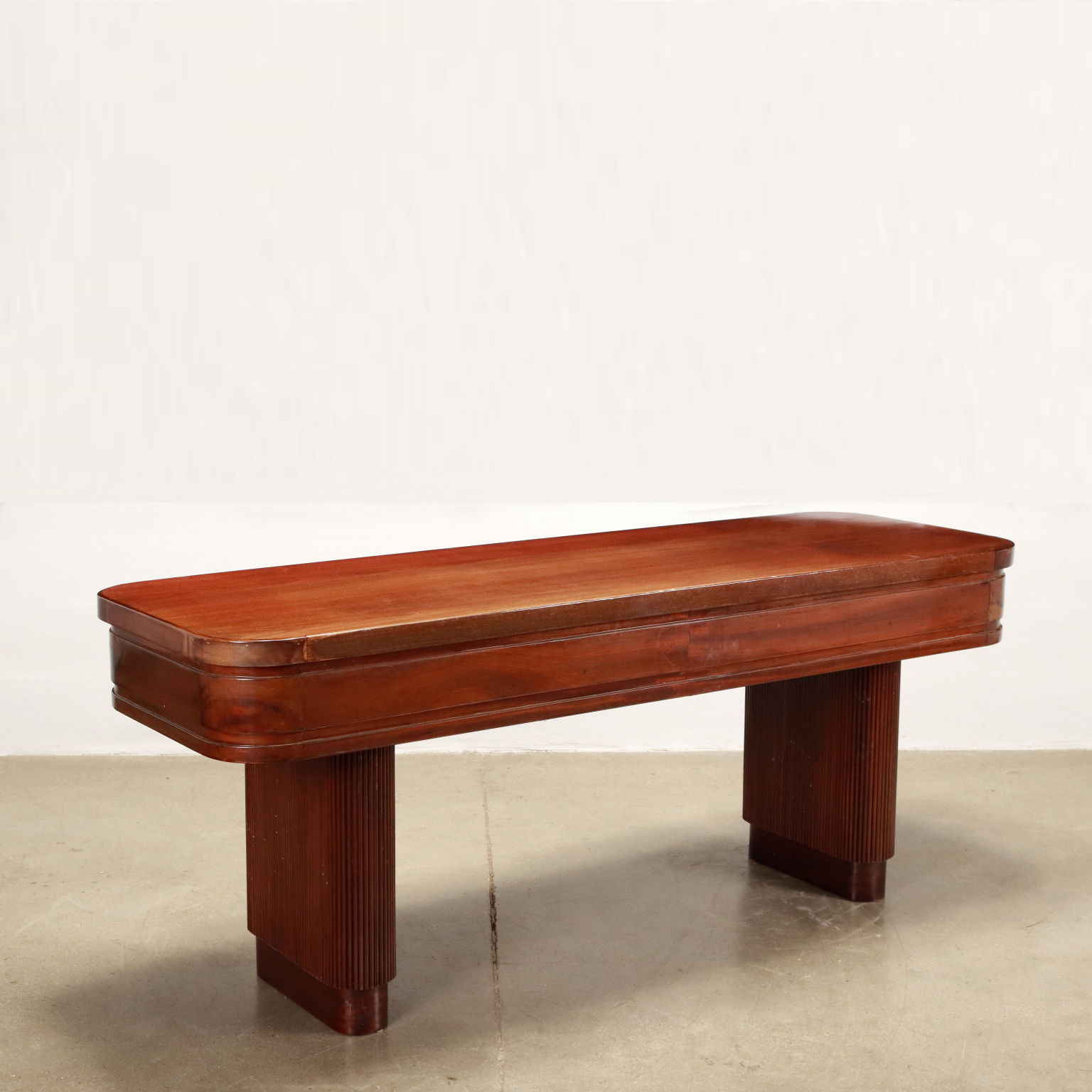 Bank mit Schublade unter der Tischplatte aus Mahagoni-furniertem Holz mit Polyester-Finish und Beinen mit "gravuren".