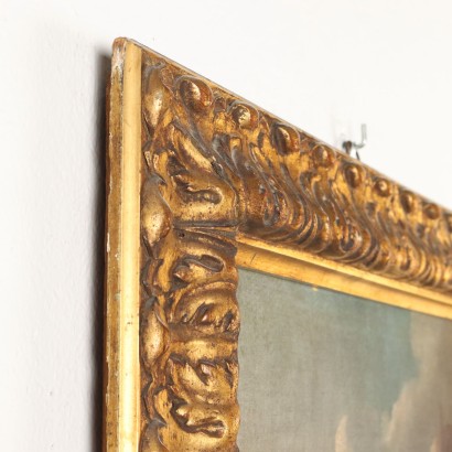 Ölgemälde auf Leinwand. Die Bemalung ist Vorbildern aus dem 17. und 18. Jahrhundert nachempfunden und bietet eine Küstenansicht in der Nähe eines Dorfes mit einem Segelschiff, das auf den Anlegeplatz zusteuert, wo mehrere Figuren zusammen mit dem Fischerboot warten. Das restaurierte und unterfütterte Gemälde ist mit Spannschrauben auf einen neuen Rahmen montiert. Es wird in einem stilvollen Rahmen präsentiert.