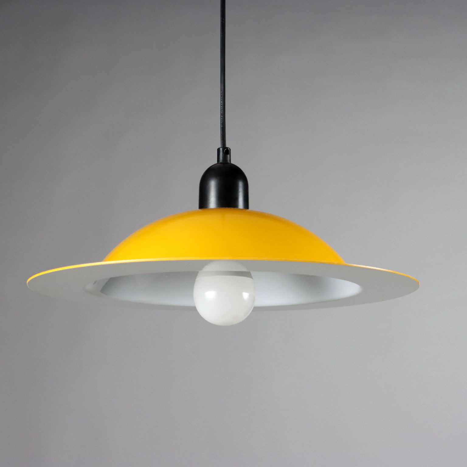 Vintage Deckenleuchte von Stilnovo mit Aluminiumreflektor, Lampenfassung aus Kunststoff und Metallabdeckung. Gelbe und weiße Lackierungen, Markenzeichen der vorliegenden Produktion.