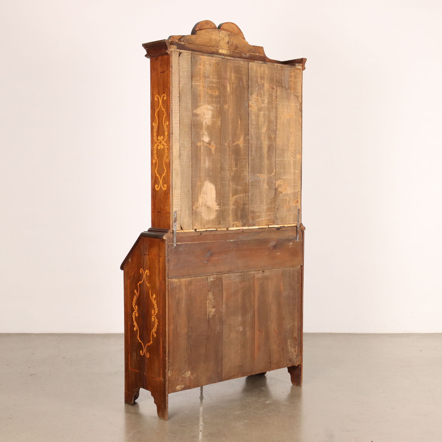 Trumeau mit Intarsien und Schnitzereien, Vorderseite mit gewelltem Cymatium, zwei Türen, die Regale verbergen, Falttür, die einen Schrank mit vier kleinen Schubladen, Griffen darunter und drei Schubladen verbirgt. Halterungsfüße. Struktur aus massivem Walnussholz und Einlagen aus Ahorn.
