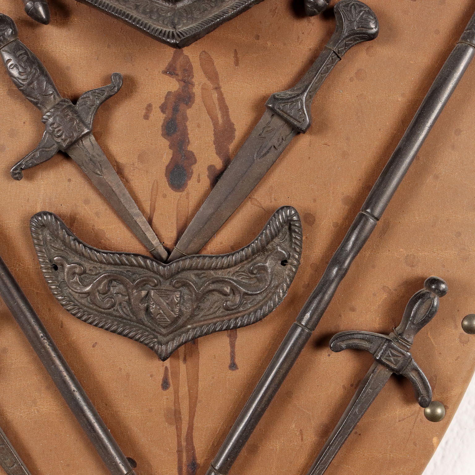 Modelle von Waffen und Rüstungen aus Eisen im mittelalterlichen Stil, präsentiert auf einer mit Leder überzogenen Holztafel mit Nieten.