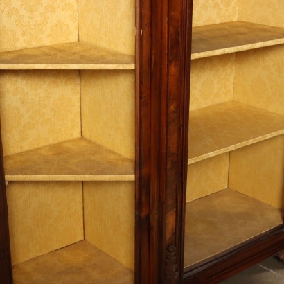 Kleiderschrank aus Walnussholz, hergestellt durch Neuadaption eines Beichtstuhls mit einem großen, geschnitzten und mit Lockenmotiven verzierten Cymatium und einer gekerbten Front mit einer Mitteltür und zwei Seitentüren, Pfosten verziert mit geschnitzten Kapitellen. Die gesamte Struktur ist mit Dornen- und Rollschnitzereien verziert.