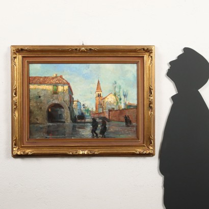 Öl auf Holz. Unten links signiert. Vittore Antonio Cargnel, Vater von Lucio Cargnel, war hauptsächlich Landschaftsmaler und Autor insbesondere eindrucksvoller Ansichten von Treviso und aufregender Einblicke in sein Herkunftsland Friaul. Er gilt als Vertreter der intimen Landschaftsmalerei, denn er schafft es, Landschaften in der Unmittelbarkeit atmosphärischer Veränderungen einzufrieren, oft auf kleinen Tafeln, um den Moment eines bestimmten Lichtzustands nicht zu verpassen, der für den beim Künstler hervorgerufenen Eindruck verantwortlich ist. Bei diesem Blick auf die Stadt fällt der leuchtende Kontrast zwischen dem Platz auf, der immer noch vom Grau des Regens dominiert wird und durch die Regenschirme der Passanten hervorgehoben wird – Figuren, die nur undeutliche Flecken, neutrale Elemente der Landschaft sind – und dem Licht, das , der durch die Wolken schneidet, beleuchtet und färbt die Dächer der Gebäude. Das Gemälde wird in einem zeitgenössischen Rahmen präsentiert.