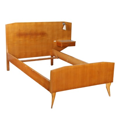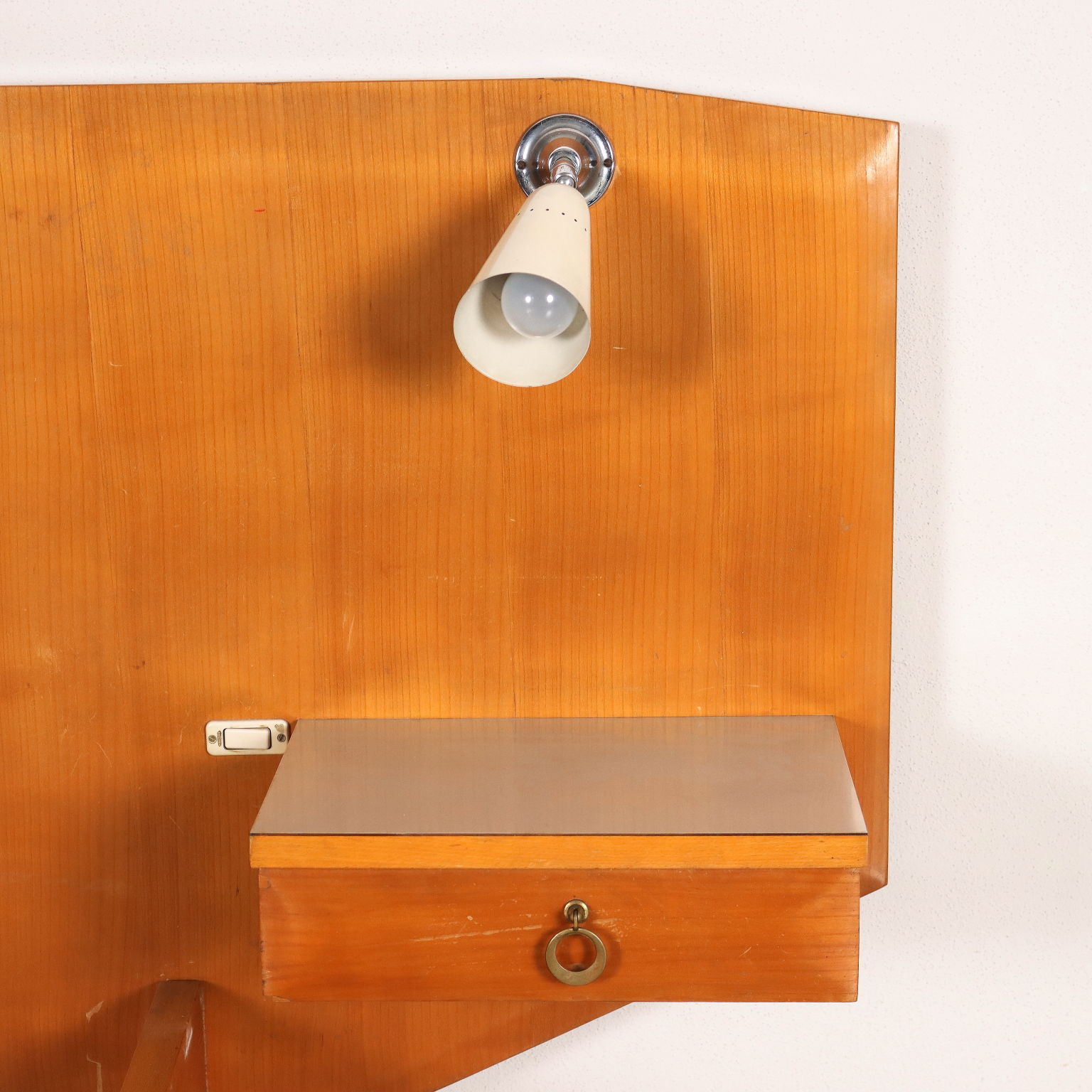 Vintage-Einzelbettgestell aus in Italien hergestelltem Ahornholz mit Regal mit Resopalplatte und kleinem Lichtpunkt.
