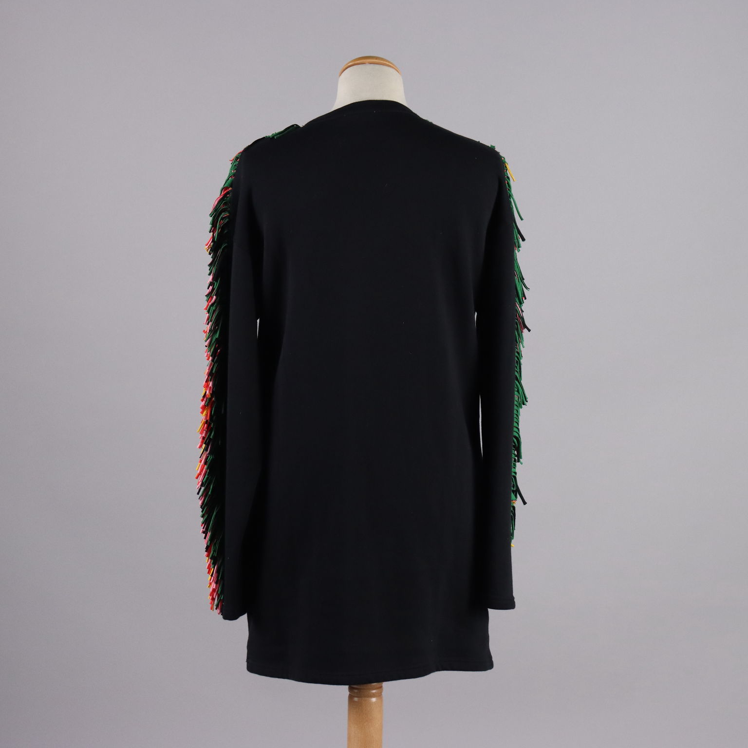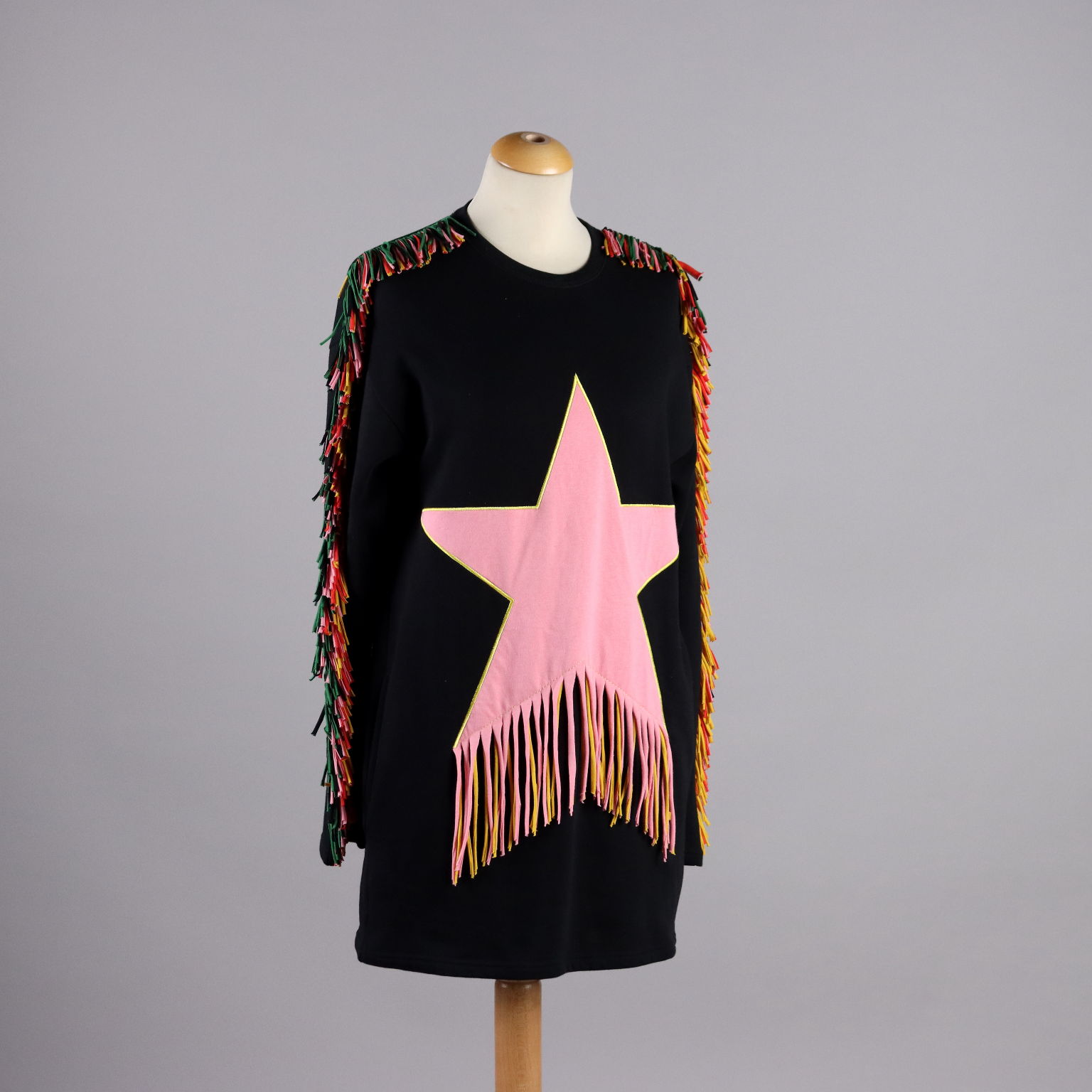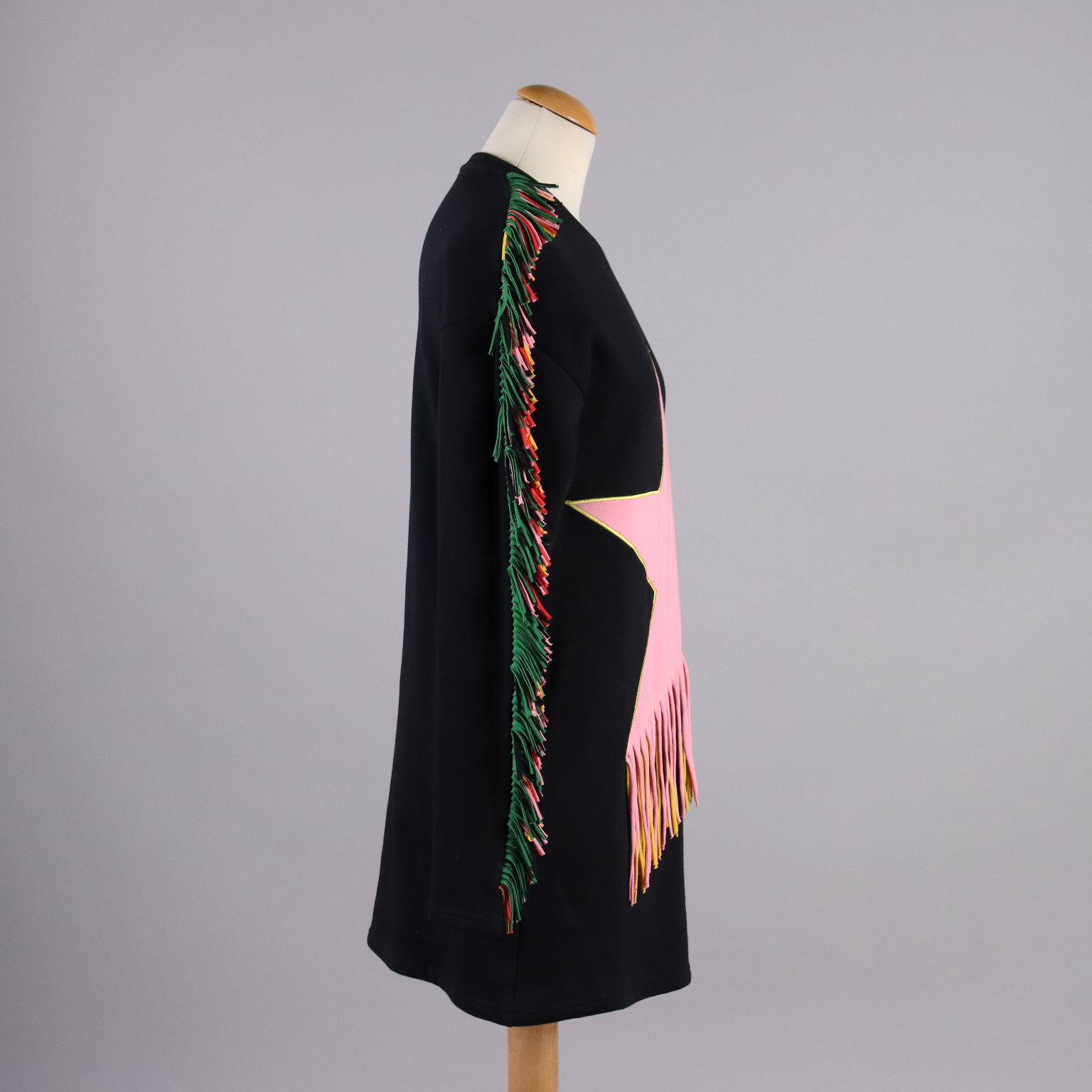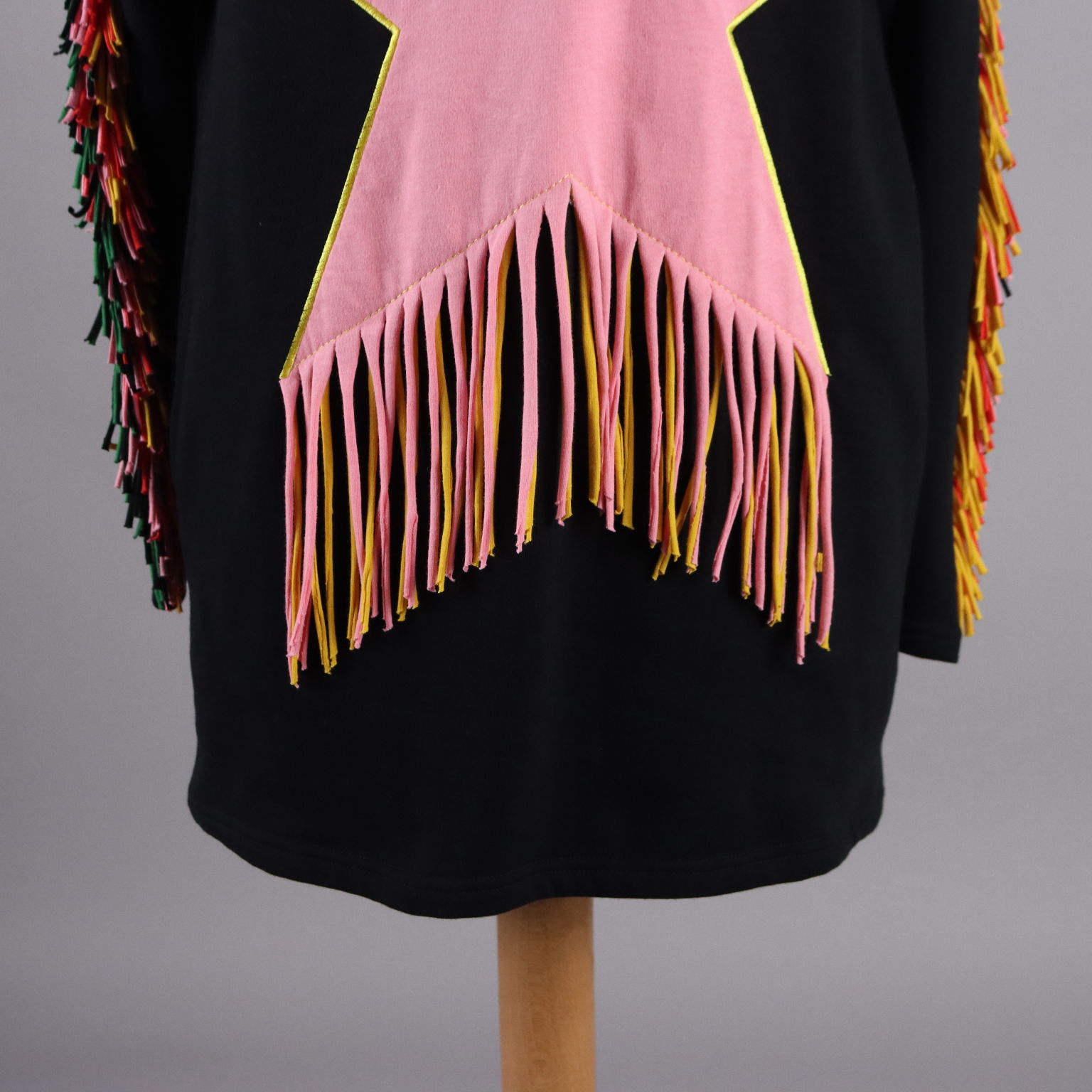 Schwarzes Sweatshirtkleid mit farbigen Fransenapplikationen entlang der Ärmel und einem großen rosa Stern auf der Vorderseite. Eingesetzte Taschen. Das Kleid ist aus der Kinderlinie, passt aber in Größe 42/44. Der Artikel ist in ausgezeichnetem Zustand, wahrscheinlich nie benutzt.