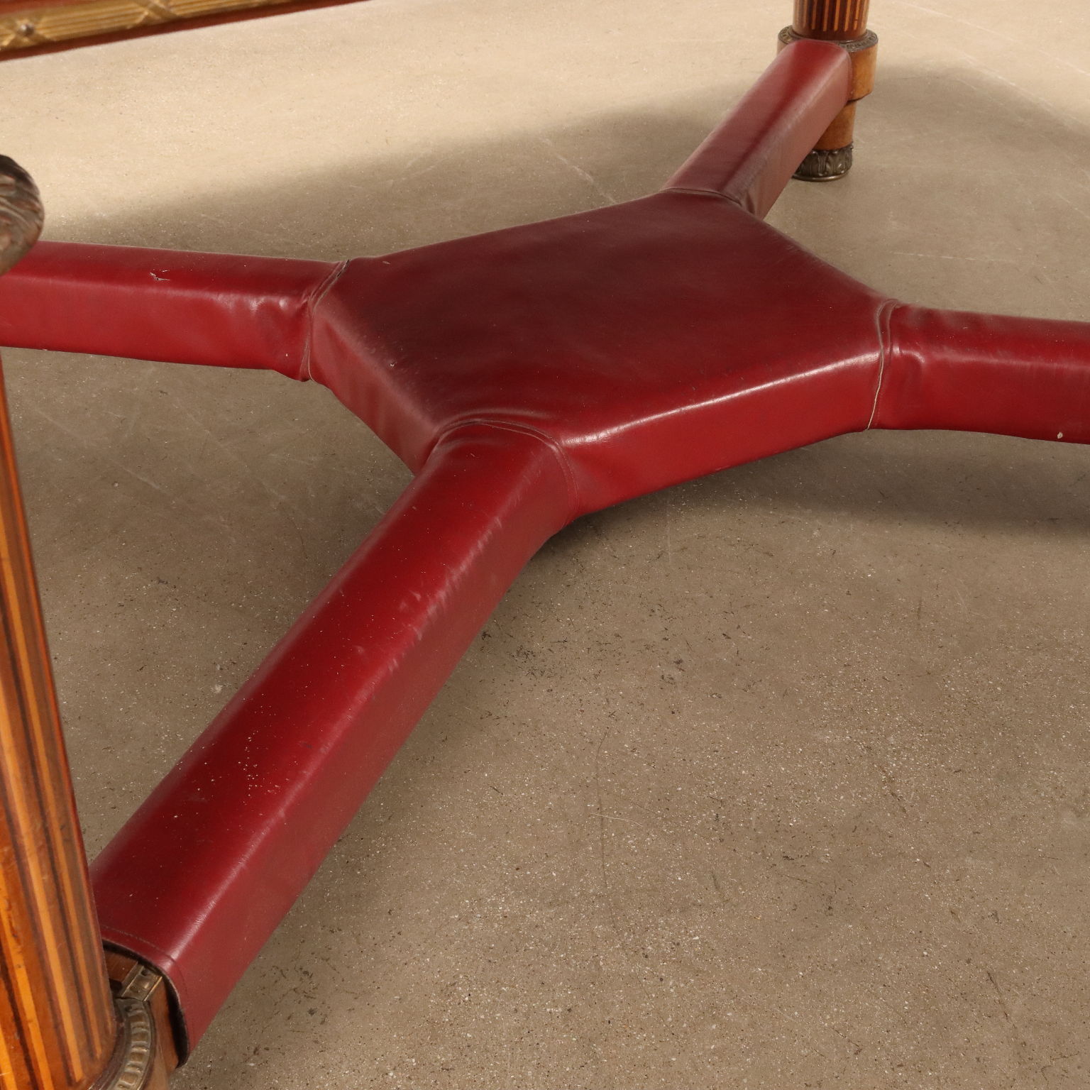 Tisch im neoklassizistischen Stil aus Mahagonifurnier, ausziehbar und mit Verlängerungen ausgestattet, Italien, frühes 20. Jahrhundert. Tischplatte mit Ahorn- und Mahagonifaden, Unterbodenband mit Rautenmotiven verziert, kegelstumpfförmige Beine mit eingelegtem und verziertem griechischem Bronzeblatt-Einsatz, letzterer wurde auch zur Herstellung der Fußenden verwendet. Durch Querstrebe verbundene Füße mit Mittelregal, ausgestattet mit Lederbezug. Der Tisch ist mit goldenen Blechprofilen verziert. Ausziehbare gedrechselte Beine unter der Tischplatte.